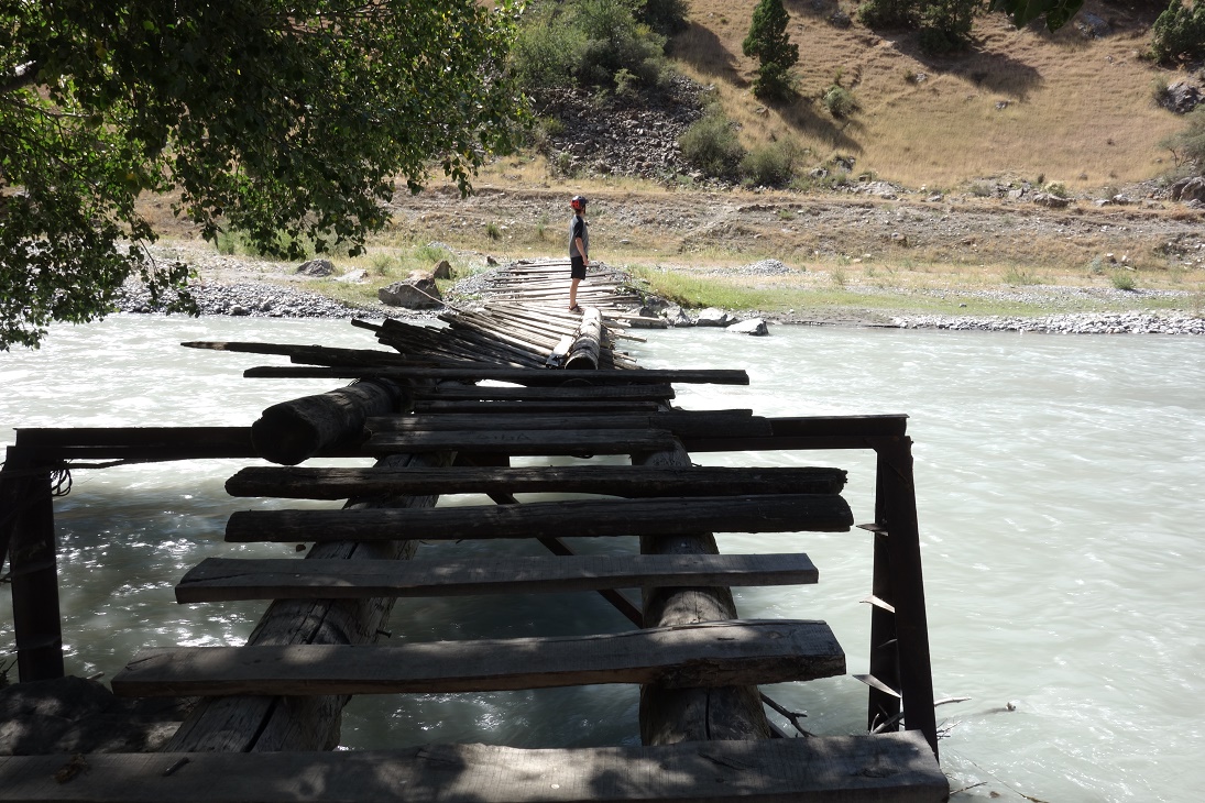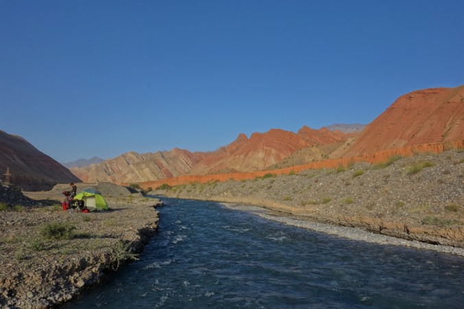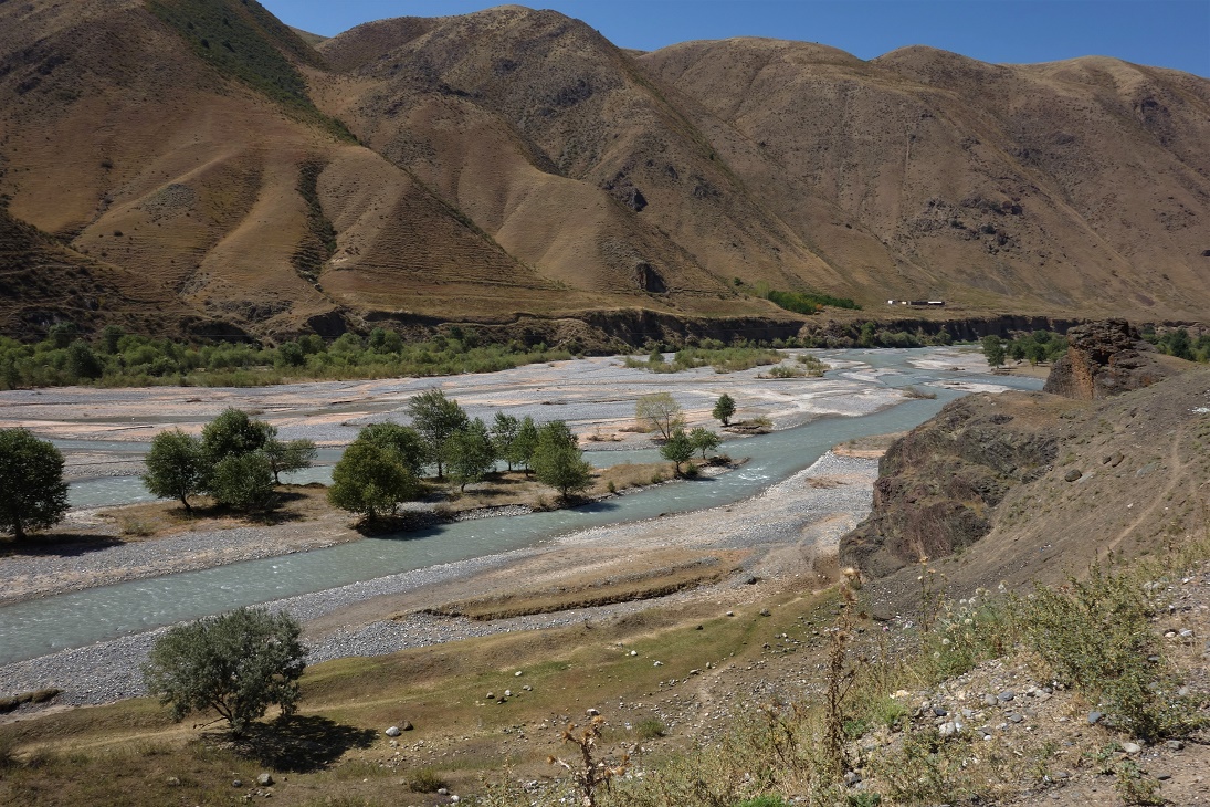 Die Straße führte uns dann weg vom See und wir steuerten die Stadt Kara-Köl an. Entlang der Straße verlief ein Fluss an dem wir vorhatten zu Zelten. Blöd nur wenn der Fluss in einer Schlucht verläuft und kein geeigneter Zeltplatz in der Nähe ist. So gondelten wir die Straße entlang am Fluss, immer weiter bis wir dann endlich in weiter Entfernung ein Platz ausfindig machen konnten. Nach 105km waren wir dann auch ziemlich K.o. und froh nun endlich einen Platz gefunden zu haben.