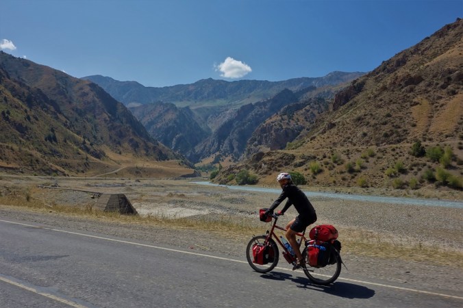 Am nächsten Morgen hatten wir dann eine ca. 65km lange Abfahrt vor uns, die wir natürlich genossen haben. Wir fuhren nach einem leckeren Mittag um den Toktogul See herum und zelten hier direkt am See. Haben wir schon erwähnt welch tolle Landschaft Kirgisistan zu bieten hat? 🙂