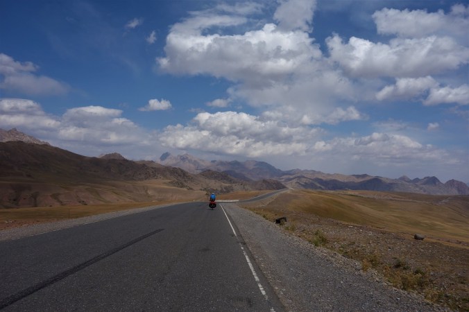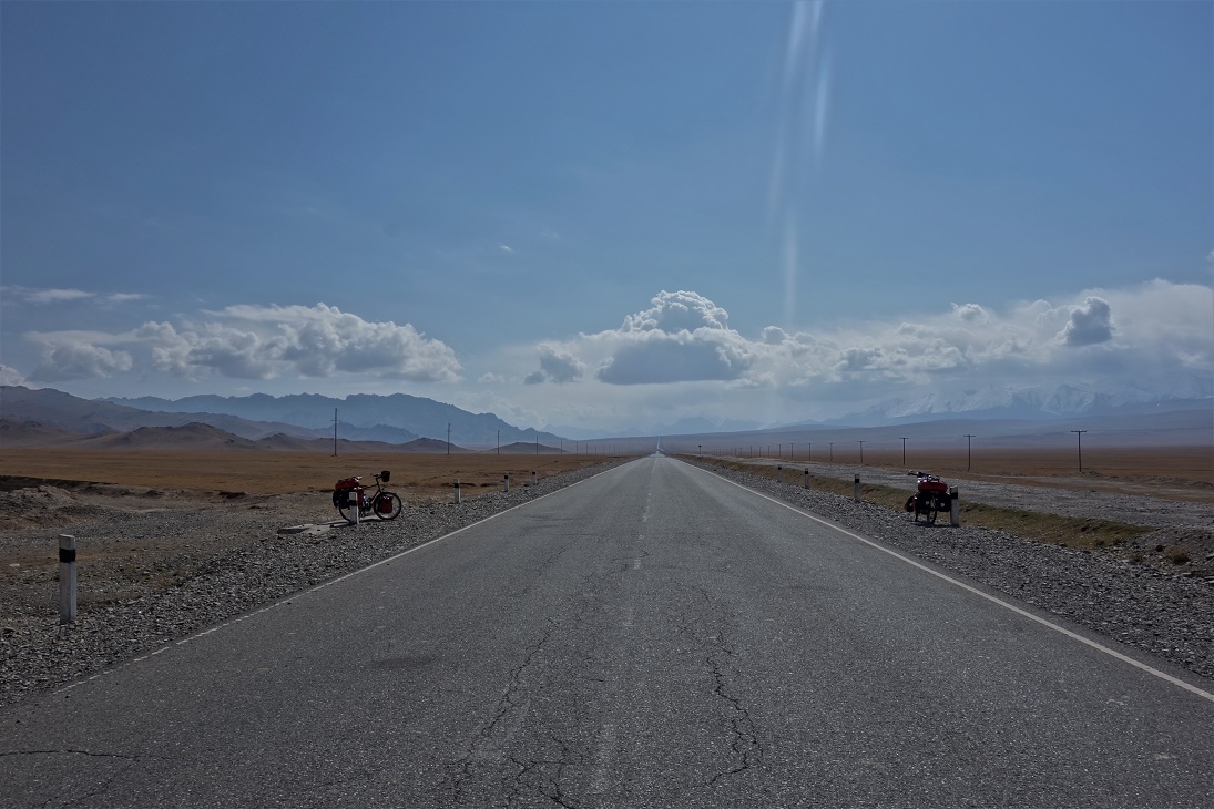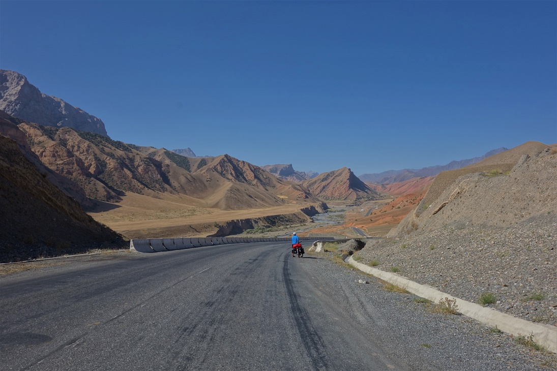 Den ersten Tag (sind wir für Kirgisistan untypisch) hauptsächlich geradeaus gefahren. Aber der erste Tag auf dem Rad war noch nicht so erfolgversprechend. Haben wir uns doch einfach noch total schlapp und K.o. gefühlt. An einem kleinen Bewässerungskanal haben wir dann unser Zelt aufgeschlagen und uns früh schlafen gelegt. Wir wurden am nächsten morgen mit strahlendem Sonnenschein empfangen und waren hoch motiviert unser Tagesziel zu erreichen. Dies sollte ein Pass sein, der auf ca. 3200m liegt. Die Strecke umfasste ca. 70km mit gut 2200hm. Wir waren beide immer noch nicht so richtig gut drauf und kämpften doch ganz schön mit dem Berg. Lag vermutlich an unserem Trainingsrückstand der letzten Wochen. Nach dem Mittag direkt an der Straße, ging es an die letzten 18km mit ca. 12 % Steigung.