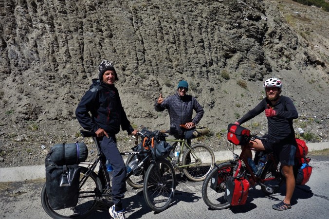 Wir haben hier ganz schnell gemerkt das wir das einfach nicht schaffen. Hier kamen zwei schwer beladene LKW’s mit niedrigem Tempo genau richtig. Jeder von uns krallte sich irgendwo hinten am Hänger fest und dann ging es bergauf. Das mag sich entspannt anhören ist aber ebenso harte Arbeit. Da die Straße ziemlich kaputt war und man meistens ohne Wechsel nur mit einer Hand festhalten kann, für ca. 45 min. Frank hatte dann noch einen kleinen Unfall bei dem Glücklicherweise nichts weiter passiert ist. Er hat sich am Hänger mit dem Lenker und Taschen verkeilt und sich dann unsanft überschlagen und wurde nicht weiter vom LKW mitgeschleift. Nach kurzem richten am Fahrrad, hielt schon der nächste LKW der das Schauspiel verfolgte und gleich signalisierte ab nach hinten und festhalten. Oben angekommen sahen wir schon den Tunnel den wir durchqueren mussten. Der Tunnel ist spärlich beleuchtet, extrem schmal und besitzt keine Ventilation. Kurz gesagt ein solcher Tunnel wäre in Deutschland undenkbar. Für Radfahrer ist er auch verboten, so mussten wir uns ein Taxi organisieren welches uns durch den 2km langen Tunnel beförderte. Nach einiger Suche fanden wir einen grünen Pritschenwagen, der bereit war uns mitzunehmen. Kaum öffneten der Beifahrer die Ladefläche, war uns klar warum die Jungs sich so amüsierten. Wir durften mit 2 Schafen und ihren Exkrementen auf der Ladefläche Platz nehmen. Die Fahrt durch den Tunnel glich einer Achterbahnfahrt. Die Straße im Tunnel war sehr schlecht und wir zischten mit einem Höllenspeed durch den Tunnel. Wir flogen ziemlich umher und selbst die Schafe lagen des öfteren auf dem Boden, aufgrund der rasanten Fahrweise.