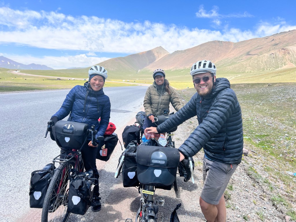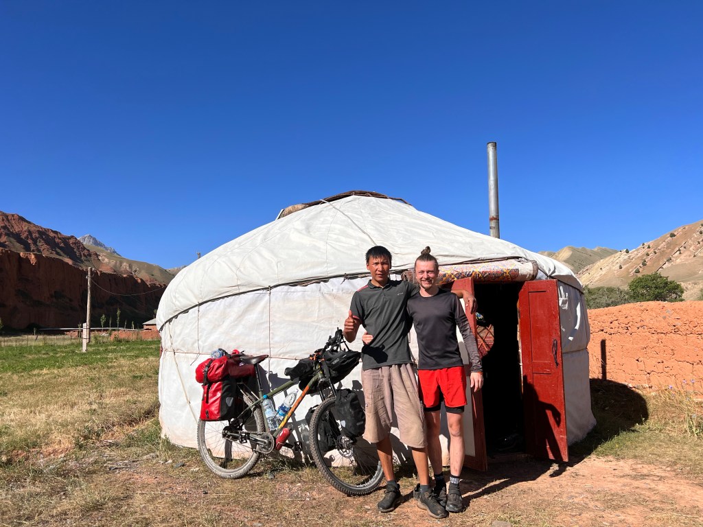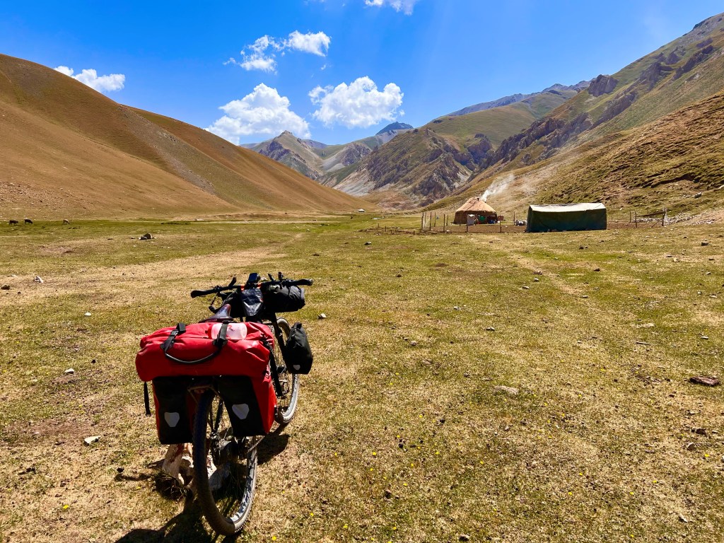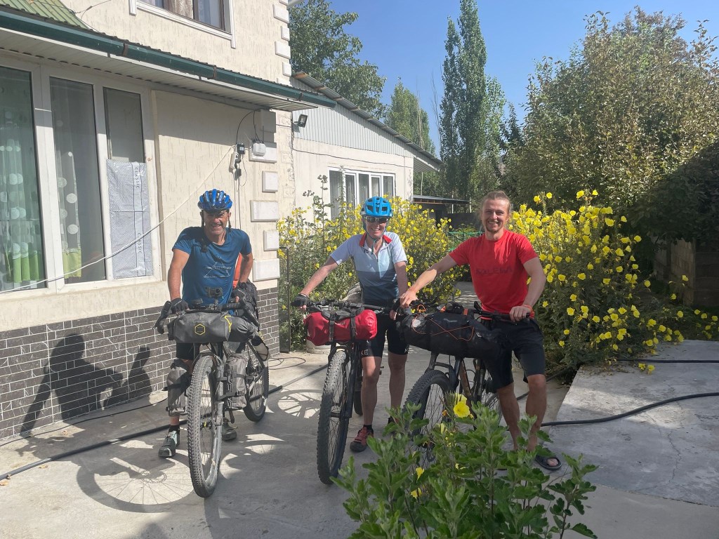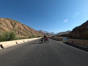 Im Tunduk Hostel waren wieder viele coole Leute unterwegs und man konnte sich super austauschen. Mehrere Radfahrer und iranische Bergsteiger, die den Pik Lenin bestiegen haben. Das spanische Radfahrer-Trio traf ich auch wieder im Hostel und sie berichteten mir, dass bei ihrer Busfahrt zurück nach Bishkek die Heckklappen des Sprinter aufgingen. Dabei verloren sie eine Tasche, weil das Ganze viel zu spät bemerkt wurde. Da war ich froh, dass ich mein Rad direkt hinter mir mit allen Taschen geparkt war. Ich unterhielt mich sehr ausgiebig mit Ahmad, einem Iraner, der den Pik Lenin besteigen wollte, aber aus gesundheitlichen Gründen bei 6500 m abbrechen musste. Ahmad flüchtete 2009 auf eigene Faust aus dem Iran, da er das Totalitäre Religionsregime satt hatte. Er war ein halbes Jahr komplett alleine unterwegs, zu Fuß sagte er, ohne Hilfe. Mit Schlauchboot übers Meer und harten Zeiten, als er zur Winterzeit unterwegs war. In der Schweiz wurde er dann kontrolliert, hatte keinen Pass und kam dort in ein Flüchtlingsheim. Mittlerweile lebt er seit zwölf Jahren in der Schweiz und spricht sehr gut Deutsch. Er hat eine Festanstellung und Wohnung und liebt das Leben in der Schweiz. Er sagte, dass er so froh ist, dass er geflohen ist, weil das Regime im Iran immer schlimmer wird. Er sagte, das alles war nicht einfach, doch seine innere Stimme hat ihm gesagt, dass ihm ein anderes Leben bestimmt ist und dass er hier weg müsse. Ein tolles Beispiel dafür, dass Mut immer belohnt wird. Leider haben wir uns dann nicht noch mal gesehen und so konnte ich leider kein Foto mit ihm machen.