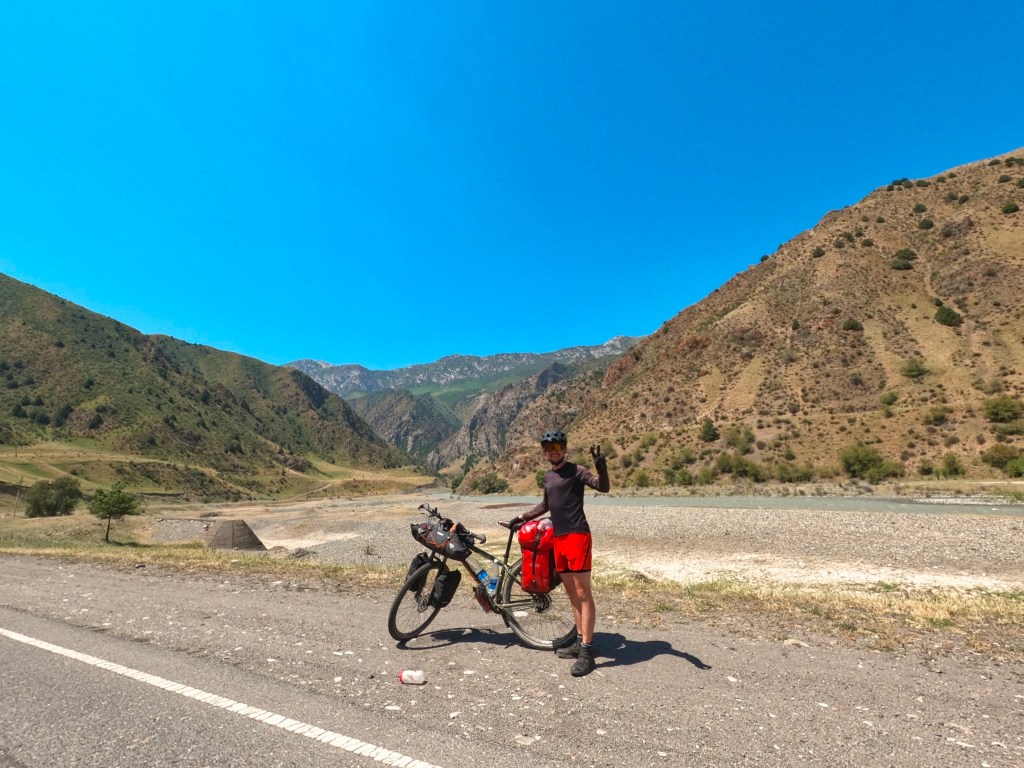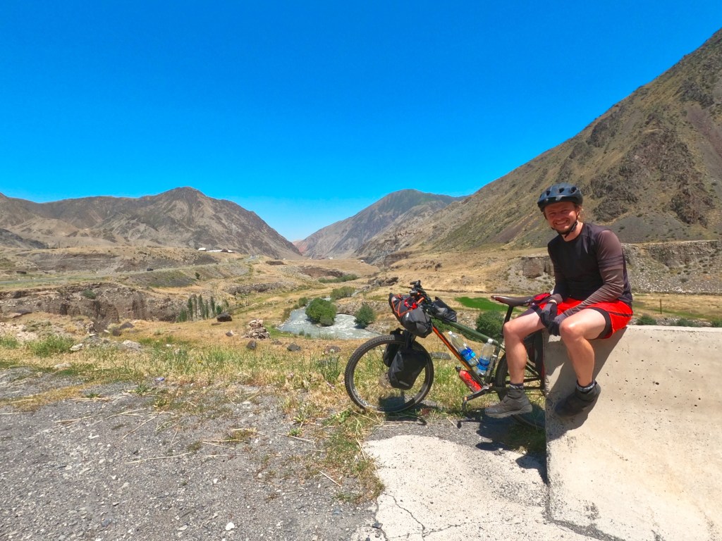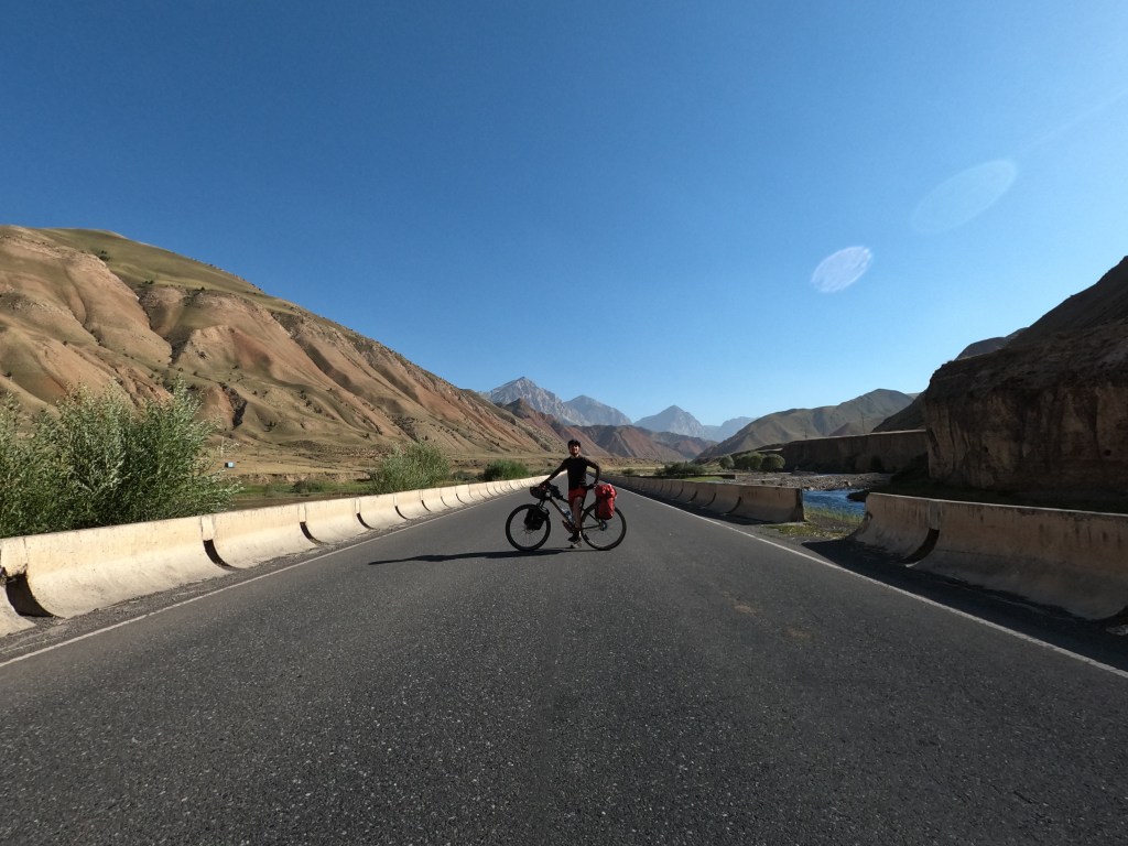 Am nächsten morgen, als die Sonne aufging, wurde es rasend schnell warm und ich packte alles zusammen, frühstückte und machte mich auf den Weg den ersten Pass auf knapp 2400 m, der ca. 4 km vor mir lag, zu überwinden. Es war kurz nach 8 Uhr und schon verdammt heiß. Der Schweiß floss in Strömen. Oben angekommen machte ich noch ein paar Bilder und stürzte mich dann in die knapp 15 km lange Abfahrt nach Gulcha. So schön die Abfahrt auch war, musste ich nur dran denken, dass ich dann später auch alles wieder hochfahren muss. In Gulcha startete ich in einem Restaurant dann Frühstück Nr. 2 mit Manti (gefühlte Teigtaschen). Nach dem Frühstück war klar: ab jetzt geht es nur noch bergauf, ist doch irgendwie gut zu wissen, was auf einen zukommt. Die Straße führte immer entlang des Gulcha Flusses durch traumhafte Landschaft mit sehr wenig Verkehr.