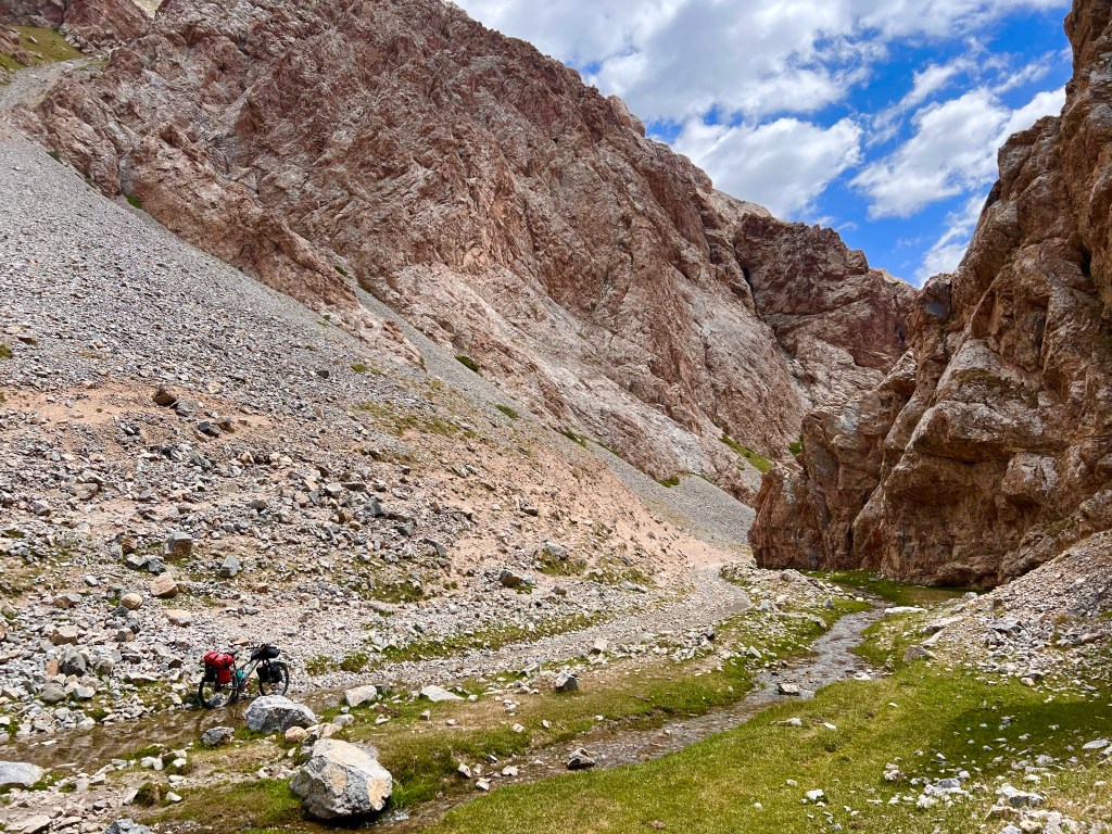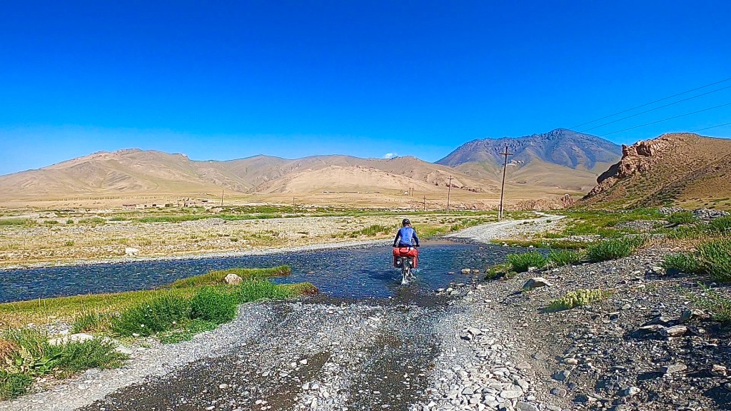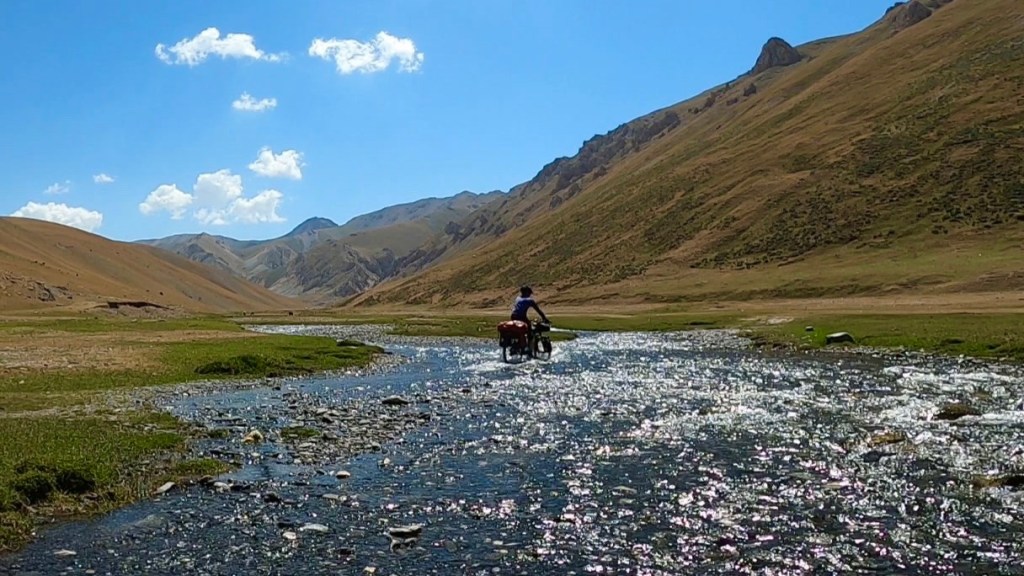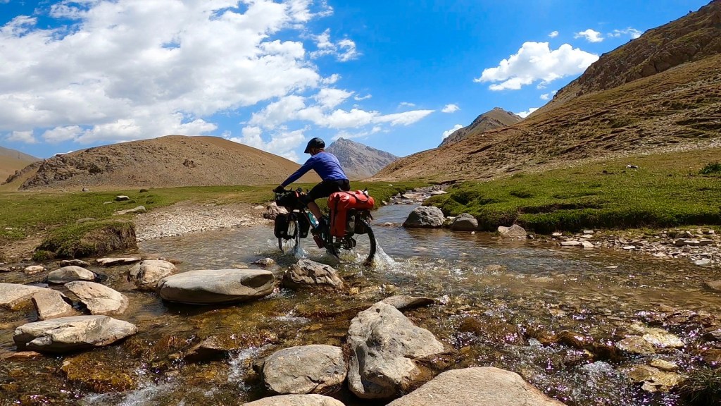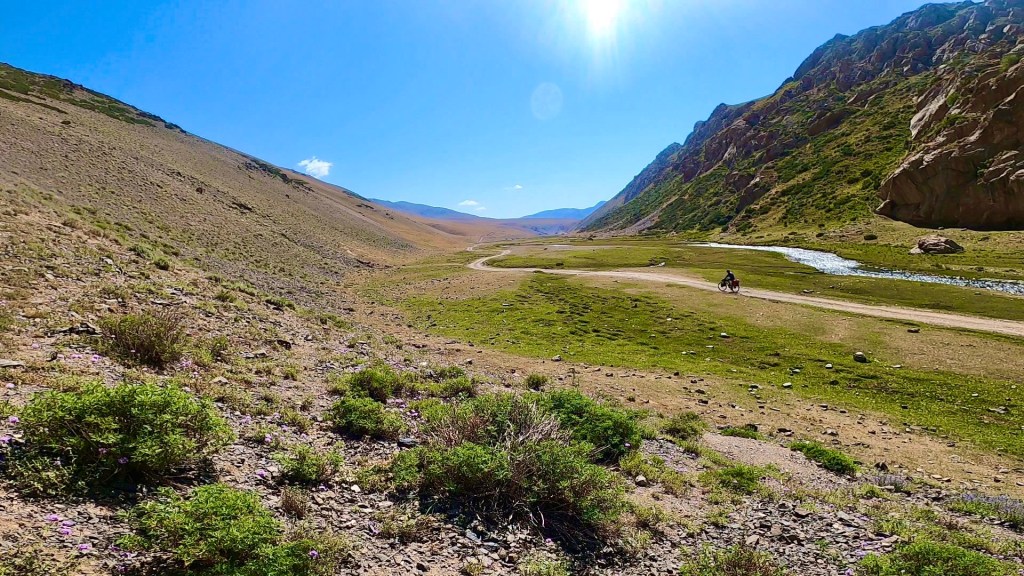 Nach dem ich weiter das Tal hinauf gefahren bin kamen immer mehr Jurten und Bauern zum Vorschein die mir wie freundlich zuwinkten und mir essen schenken wollten. Doch ich erklärte immer das ich nix brauche und alles dabei habe. Vorallem die Kids flippen immer förmlich aus und winken und rufen „hello“ oder „bye bye“. Durch das Tal ging es konstant bergauf anfangs recht moderat zum Ende hin wurde es aber deutlich steiler. Es folgten mehr mehr Flussdurchfahrten bei der meine Füße dann nicht mehr trocken blieben. Der Weg wechselte von Schotterweg zu Wiese, grober Schotter mit großen Steinen oder teilweise gar kein Weg immer hin und her. Zum Schluss gab es noch mal einige steile Anstiege zu überwinden um dann endlich oben auf dem Taldyk Pass auf 3615m wieder anzukommen. Das war eine willkommene Abwechslung doch solche Wege wie beim Silk Road Mountain Race über knapp 2000km und 14 Tage zu fahren ist denke ich sehr herausfordernd, wirklich Hut ab davor. Für mich standen jetzt knapp 80km Abfahrt mit 2000hm runter auf dem Programm. Ich freute mich sehr darauf und die ersten Meter den pass hinunter liefen auch erste Sahne. Doch dann trat wieder extremer Gegenwind auf der mir die Abfahrt bis Gulcha zur Höhle machte. Ich war teilweise beim runterfahren langsamer als beim rauffahren. Es ist sehr frustrierend wenn man sieht das es bergab geht und man treten muss das man voran kommt. Ich habe dazu ein wenig recherchiert da ich das ja fast immer hatte wenn ich ein Tal hinunter gefahren bin. Und habe dazu die Erklärung gefunden das es Tal und Bergwind gibt. Durch das aufheizen des Bodens am Morgen wird Boden nahe Luft erwärmt und steigt nach oben das Tal hinauf. Durch die starke Sonnenstrahlung wird dieser Effekt natürlich verstärkt und es entsteht starker Wind. Übrigens nachts kehrt sich das ganze um. So wäre es ratsam die Abfahrt recht zeitig am morgen oder nachts zu absolvieren. Ich schaffte es nach 126km endlich ziemlich fertig in Gulcha anzukommen und traf im dortigen Hostel das Spanische Pärchen aus Sary Moghol wieder die mir das ganze bestätigen. Sie fuhren einen Teil der Talabfahrt am frühen Vormittag und berichteten mir das sie kaum Wind hatten. Wieder was gelernt.