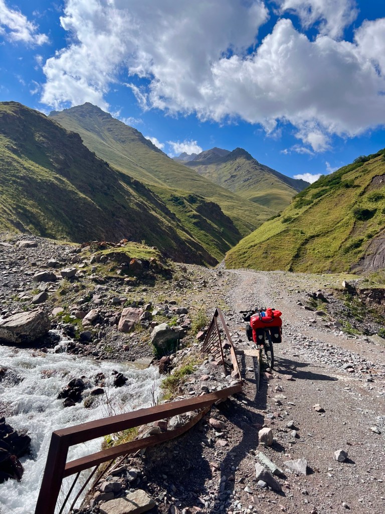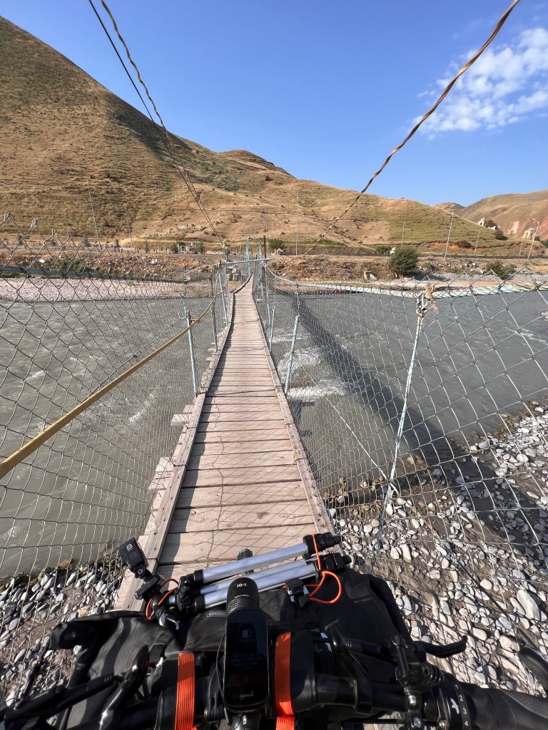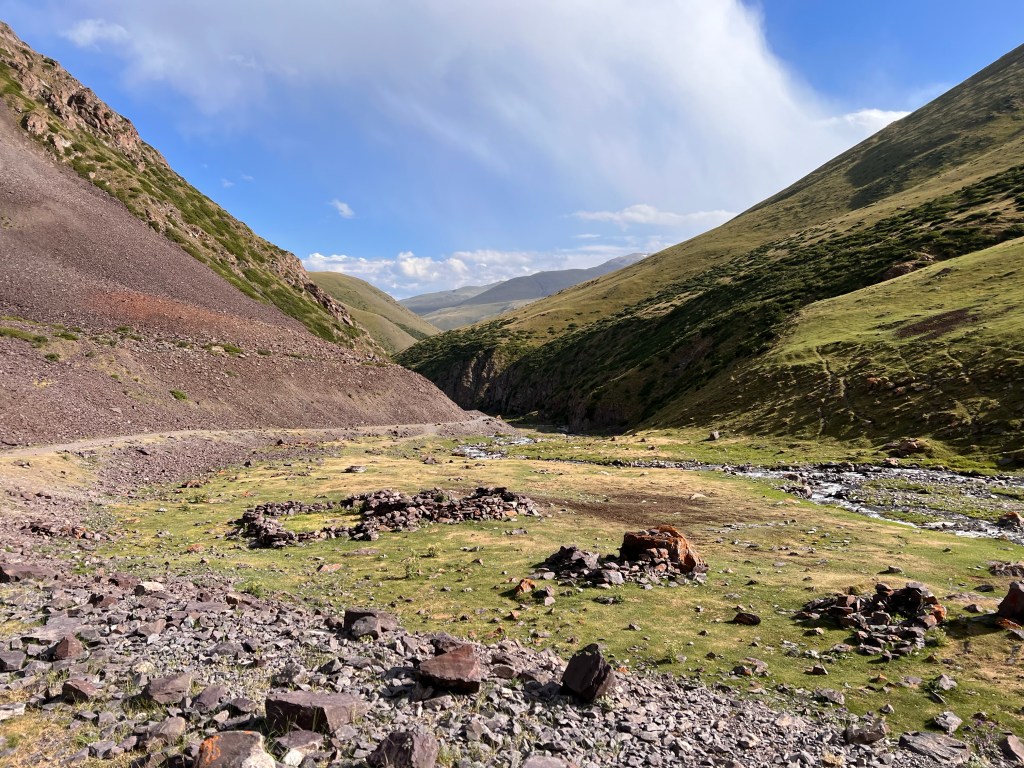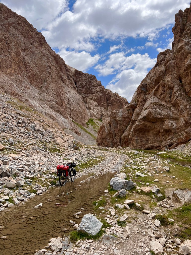 Nach dem ich weiter das Tal hinauf gefahren bin kamen immer mehr Jurten und Bauern zum Vorschein die mir wie freundlich zuwinkten und mir essen schenken wollten. Doch ich erklärte immer das ich nix brauche und alles dabei habe. Vorallem die Kids flippen immer förmlich aus und winken und rufen „hello“ oder „bye bye“. Durch das Tal ging es konstant bergauf anfangs recht moderat zum Ende hin wurde es aber deutlich steiler. Es folgten mehr mehr Flussdurchfahrten bei der meine Füße dann nicht mehr trocken blieben. Der Weg wechselte von Schotterweg zu Wiese, grober Schotter mit großen Steinen oder teilweise gar kein Weg immer hin und her. Zum Schluss gab es noch mal einige steile Anstiege zu überwinden um dann endlich oben auf dem Taldyk Pass auf 3615m wieder anzukommen. Das war eine willkommene Abwechslung doch solche Wege wie beim Silk Road Mountain Race über knapp 2000km und 14 Tage zu fahren ist denke ich sehr herausfordernd, wirklich Hut ab davor. Für mich standen jetzt knapp 80km Abfahrt mit 2000hm runter auf dem Programm. Ich freute mich sehr darauf und die ersten Meter den pass hinunter liefen auch erste Sahne. Doch dann trat wieder extremer Gegenwind auf der mir die Abfahrt bis Gulcha zur Höhle machte. Ich war teilweise beim runterfahren langsamer als beim rauffahren. Es ist sehr frustrierend wenn man sieht das es bergab geht und man treten muss das man voran kommt. Ich habe dazu ein wenig recherchiert da ich das ja fast immer hatte wenn ich ein Tal hinunter gefahren bin. Und habe dazu die Erklärung gefunden das es Tal und Bergwind gibt. Durch das aufheizen des Bodens am Morgen wird Boden nahe Luft erwärmt und steigt nach oben das Tal hinauf. Durch die starke Sonnenstrahlung wird dieser Effekt natürlich verstärkt und es entsteht starker Wind. Übrigens nachts kehrt sich das ganze um. So wäre es ratsam die Abfahrt recht zeitig am morgen oder nachts zu absolvieren. Ich schaffte es nach 126km endlich ziemlich fertig in Gulcha anzukommen und traf im dortigen Hostel das Spanische Pärchen aus Sary Moghol wieder die mir das ganze bestätigen. Sie fuhren einen Teil der Talabfahrt am frühen Vormittag und berichteten mir das sie kaum Wind hatten. Wieder was gelernt.
