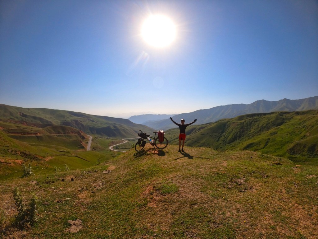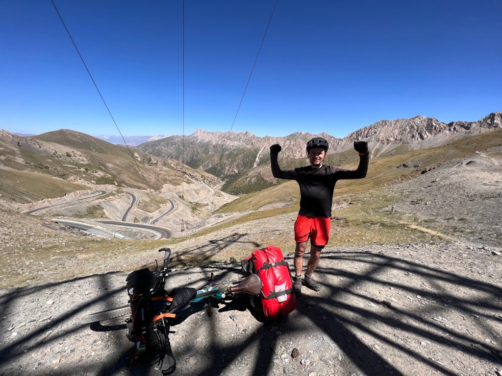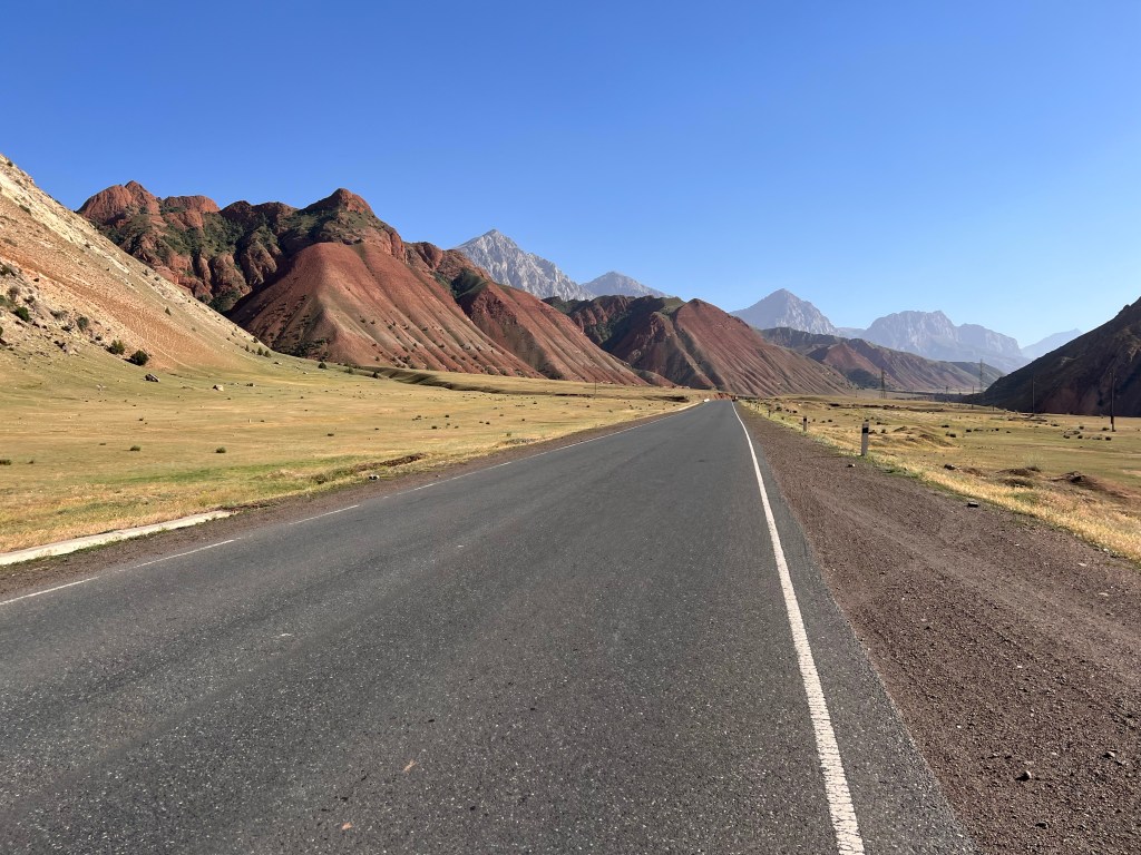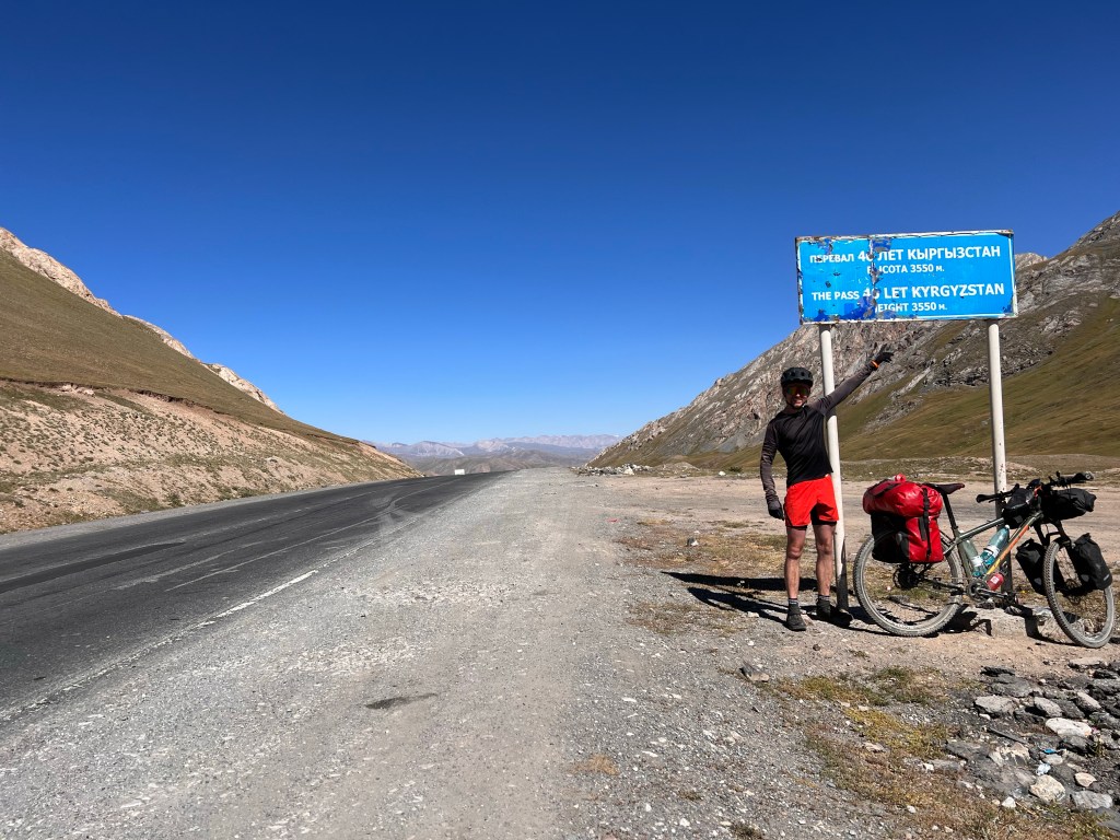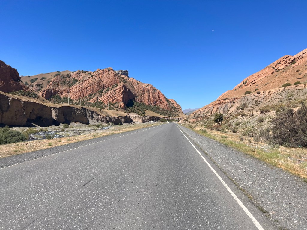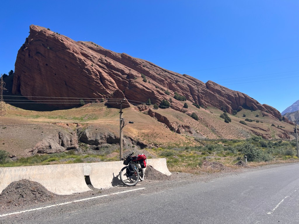 Für mich stand an diesem dritten Fahrtag ordentlich Höhenmeter auf dem Programm. Es geht dabei über 2 Pässe mit 3615 m und 3550 m Höhe und eine Strecke von knapp 50 km, was sich eigentlich nicht viel anhört. Anfangs ging es durchaus wieder sehr moderat nach oben. Dabei durchquerte ich wunderschöne Landschaften, die einen manchmal zweifeln liesen, ob man jetzt in Kirgisistan ist oder doch eher in den USA in der Nähe des Grand Canyon. Nachdem das erste Restaurant geschlossen hatte, fand ich glücklicherweise noch ein zweites, wo ich mich nochmal stärken konnte, vor den zwei Pässen. Es gab einen Mix aus Nudeln, Reis, Soße und ein wenig Fleisch mit dem Namen Gulasch. Man konnte es essen, aber das Highlight war es nicht. Ich war nun schon auf einer Höhe von 2800 m und hatte jetzt noch knapp 800 hm vor mir. In einem kleinen Ort vor dem Pass, kaufte ich mir noch ein paar Snacks und wurde frenetisch bei der Abfahrt von den Kids auf der Straße gefeiert. Ab jetzt ging es ziemlich steil ca. 10 km bis auf den Pass rauf. Das war schon ordentlich anstrengend und ich machte doch deutlich mehr Pause als mir lieb war. Auf dem Weg nach oben stand ein kleines Mädchen, welches wahrscheinlich auf ein Taxi wartete. Dieses kleine Mädchen schenkte mir, als ich sie passierte, eine kleine Blume und wünschte mir einen guten Weg nach oben. Diese Geste war für mich unglaublich schön und ich schätze das Mädchen auf ca. 6-7 Jahre, welches da ganz alleine am Straßenrand stand. Besonders bemerkenswert finde ich, dass in vielen Lebensmittelgeschäften hier Kinder an der Kasse sitzen, die für mich gefühlt irgendwo zwischen 5 – 8 Jahre alt sind. Die machen ihren Job echt gut und dabei frage ich mich, weshalb traut man das den Kindern bei uns Zuhause nicht zu. Die gefühlt vor jeder Verantwortung beschützt werden und dann schlagartig mit 18 Jahren eigenständige Erwachsene sein sollen.