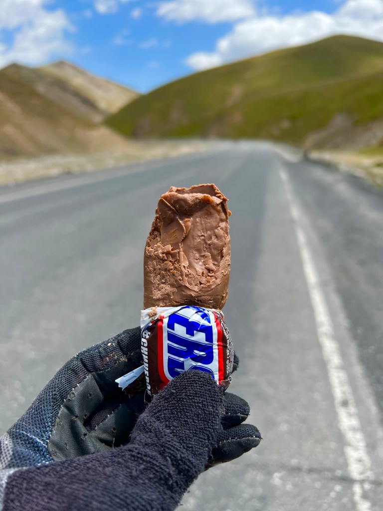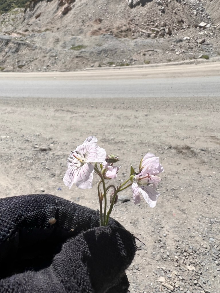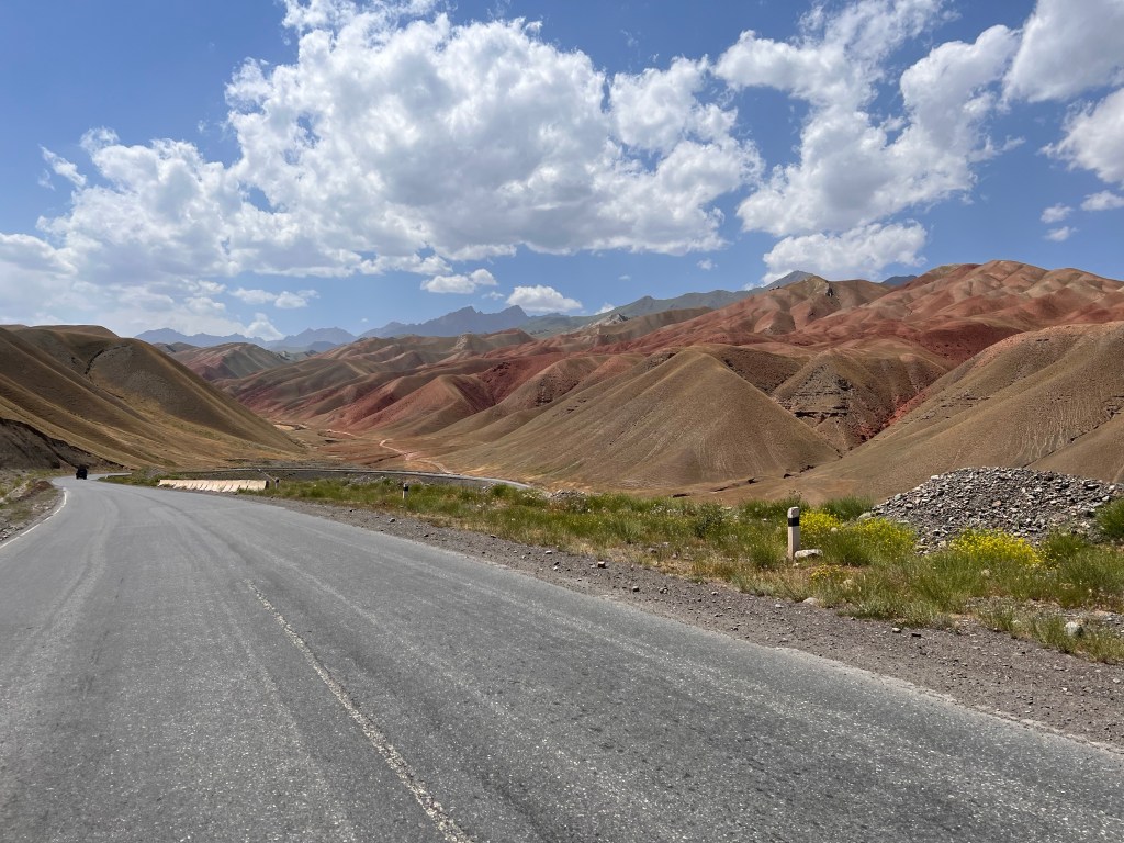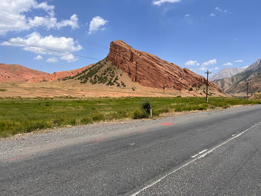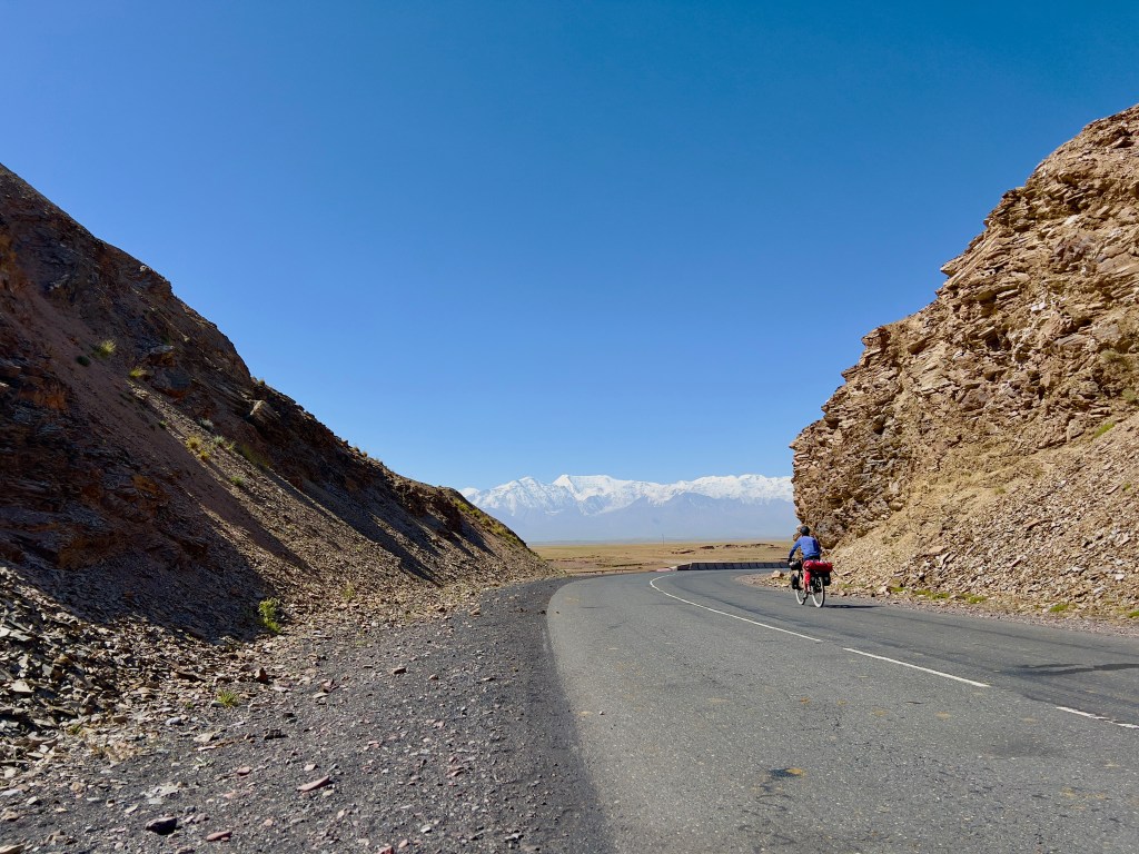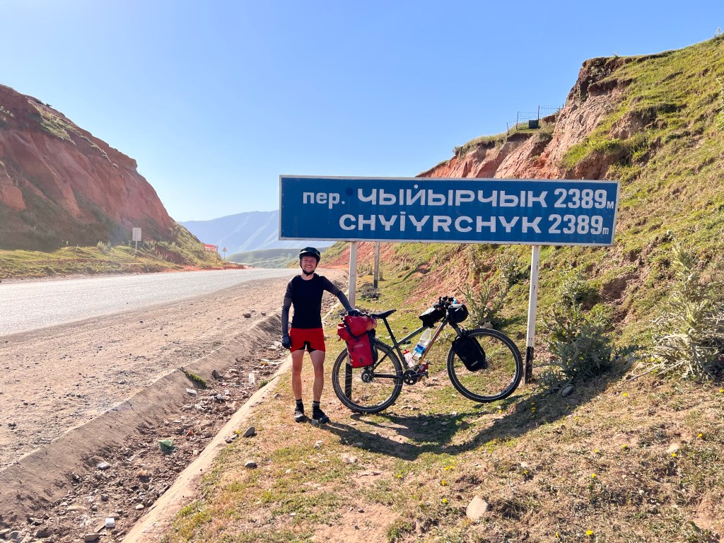 Für mich stand an diesem dritten Fahrtag ordentlich Höhenmeter auf dem Programm. Es geht dabei über 2 Pässe mit 3615 m und 3550 m Höhe und eine Strecke von knapp 50 km, was sich eigentlich nicht viel anhört. Anfangs ging es durchaus wieder sehr moderat nach oben. Dabei durchquerte ich wunderschöne Landschaften, die einen manchmal zweifeln liesen, ob man jetzt in Kirgisistan ist oder doch eher in den USA in der Nähe des Grand Canyon. Nachdem das erste Restaurant geschlossen hatte, fand ich glücklicherweise noch ein zweites, wo ich mich nochmal stärken konnte, vor den zwei Pässen. Es gab einen Mix aus Nudeln, Reis, Soße und ein wenig Fleisch mit dem Namen Gulasch. Man konnte es essen, aber das Highlight war es nicht. Ich war nun schon auf einer Höhe von 2800 m und hatte jetzt noch knapp 800 hm vor mir. In einem kleinen Ort vor dem Pass, kaufte ich mir noch ein paar Snacks und wurde frenetisch bei der Abfahrt von den Kids auf der Straße gefeiert. Ab jetzt ging es ziemlich steil ca. 10 km bis auf den Pass rauf. Das war schon ordentlich anstrengend und ich machte doch deutlich mehr Pause als mir lieb war. Auf dem Weg nach oben stand ein kleines Mädchen, welches wahrscheinlich auf ein Taxi wartete. Dieses kleine Mädchen schenkte mir, als ich sie passierte, eine kleine Blume und wünschte mir einen guten Weg nach oben. Diese Geste war für mich unglaublich schön und ich schätze das Mädchen auf ca. 6-7 Jahre, welches da ganz alleine am Straßenrand stand. Besonders bemerkenswert finde ich, dass in vielen Lebensmittelgeschäften hier Kinder an der Kasse sitzen, die für mich gefühlt irgendwo zwischen 5 – 8 Jahre alt sind. Die machen ihren Job echt gut und dabei frage ich mich, weshalb traut man das den Kindern bei uns Zuhause nicht zu. Die gefühlt vor jeder Verantwortung beschützt werden und dann schlagartig mit 18 Jahren eigenständige Erwachsene sein sollen.
