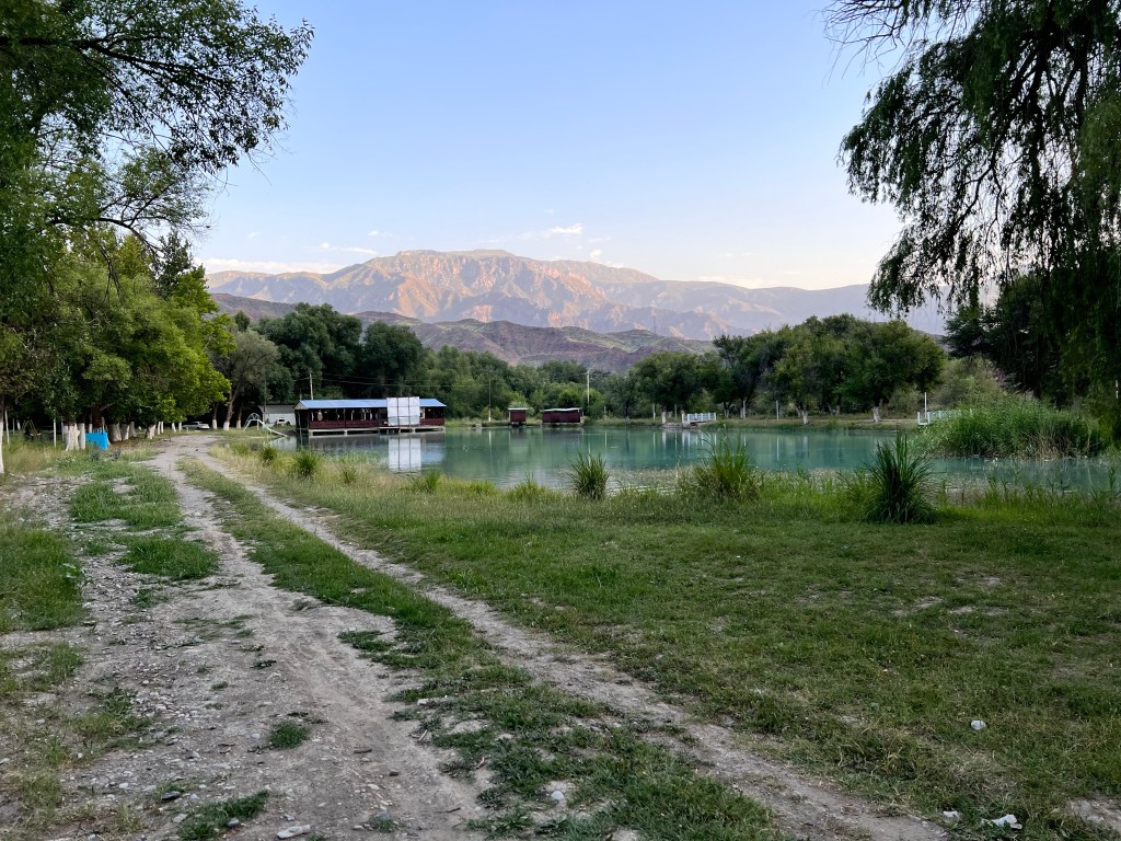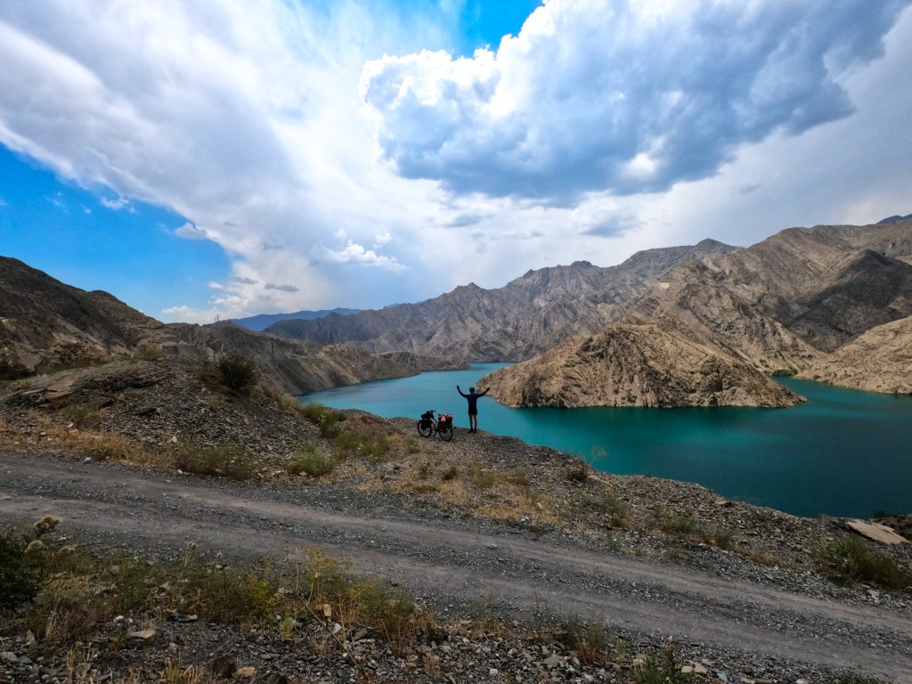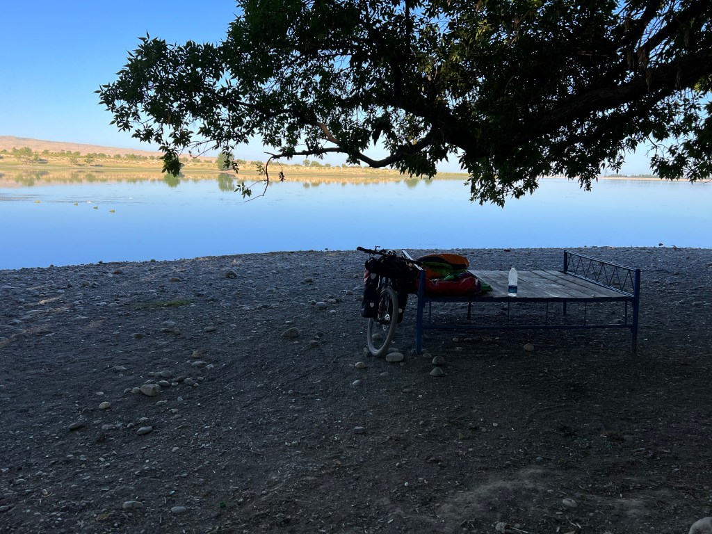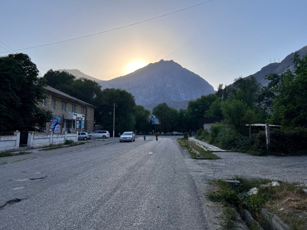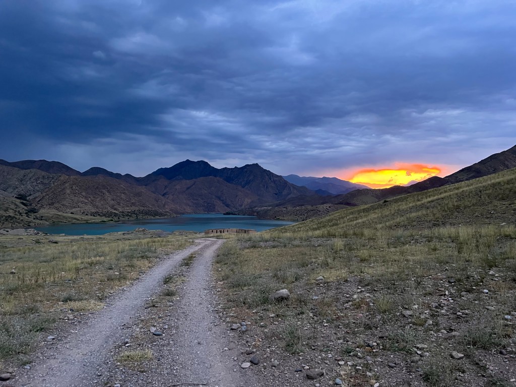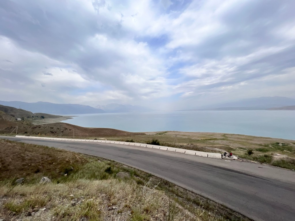Ich machte dann ausgiebig Mittag und fuhr dann nach 3 h Pause weiter. Ich fand einen großen Baggersee an der Straße, welchen ich ansteuerte. Dort war ein kleiner Imbiss und viele Kirgisen, die sich dort abkühlten bei den heißen Temperaturen von über 35 Grad. Ich nutzte auch die Möglichkeit zur Abkühlung und wurde natürlich gleich von unzähligen Kirgisen angesprochen, wo ich herkomme, wohin ich will und so weiter. Mit meinen wenigen Russisch-Kenntnissen komme ich doch immer wieder sehr weit hier. Russisch ist neben Kirgisisch Zweitsprache hier und wird von mehr als 50% der Menschen gesprochen. Ich kochte mir Nudeln zum Abendessen und genoss die Atmosphäre am See, mit einem grandiosen Sonnenuntergang direkt vor mir. Nach Sonnenuntergang zog wieder wie aus dem Nichts ein Wind auf, der mich an letzte Nacht denken lies. Ich wartete bis alle Gäste verschwunden waren und sicherte mir dann direkt am Strand und Bäumen eine Sitzgelegenheit, um hier meinen Schlafplatz zu errichten, natürlich ohne Zelt. Die Nacht war sehr angenehm, vor allem weil ich mir einen Windschutz baute und so gut ausgeschlafen am nächsten Morgen aufwachte. Die Szenerie am Morgen mit der aufgehenden Sonne war magisch und ich genoss das Ganze sehr, auch wenn das heißt später in der Hitze zu starten. Wenn ich heute gut durchziehe, dann schaffe ich die 115 km bis nach Osh, war mein Plan. Es ging recht schleppend voran und nach ein paar Kilometern stand auch schon der erste Berg vor mir, den ich doch mehr schlecht als recht bezwang. Nach der nächsten Abfahrt wurde ich langsam warm, besorgte mir erstmal Snacks und Wasser. Denn der nächste Berg mit gut 500 hm stand vor der Tür. Die Straßen an dem Tag, sowie dem Tag zuvor, waren teilweise in höllischem Zustand, mit Schlaglöchern und Bodenwellen übersäht. Da macht das Fahren keine Freude. Auch wurde an manchen Stellen die Straße komplett erneuert und es war nur Schotter und Schlamm, auf dem ich fuhr. Zur Staubbekämpfung fährt immer ein Lkw mit Bewässerungsvorrichtung die Piste ab. Das hilft zwar teilweise gegen den Staub, der Dreck bleibt trotzdem.