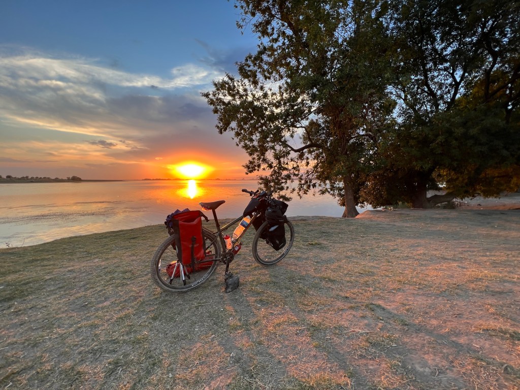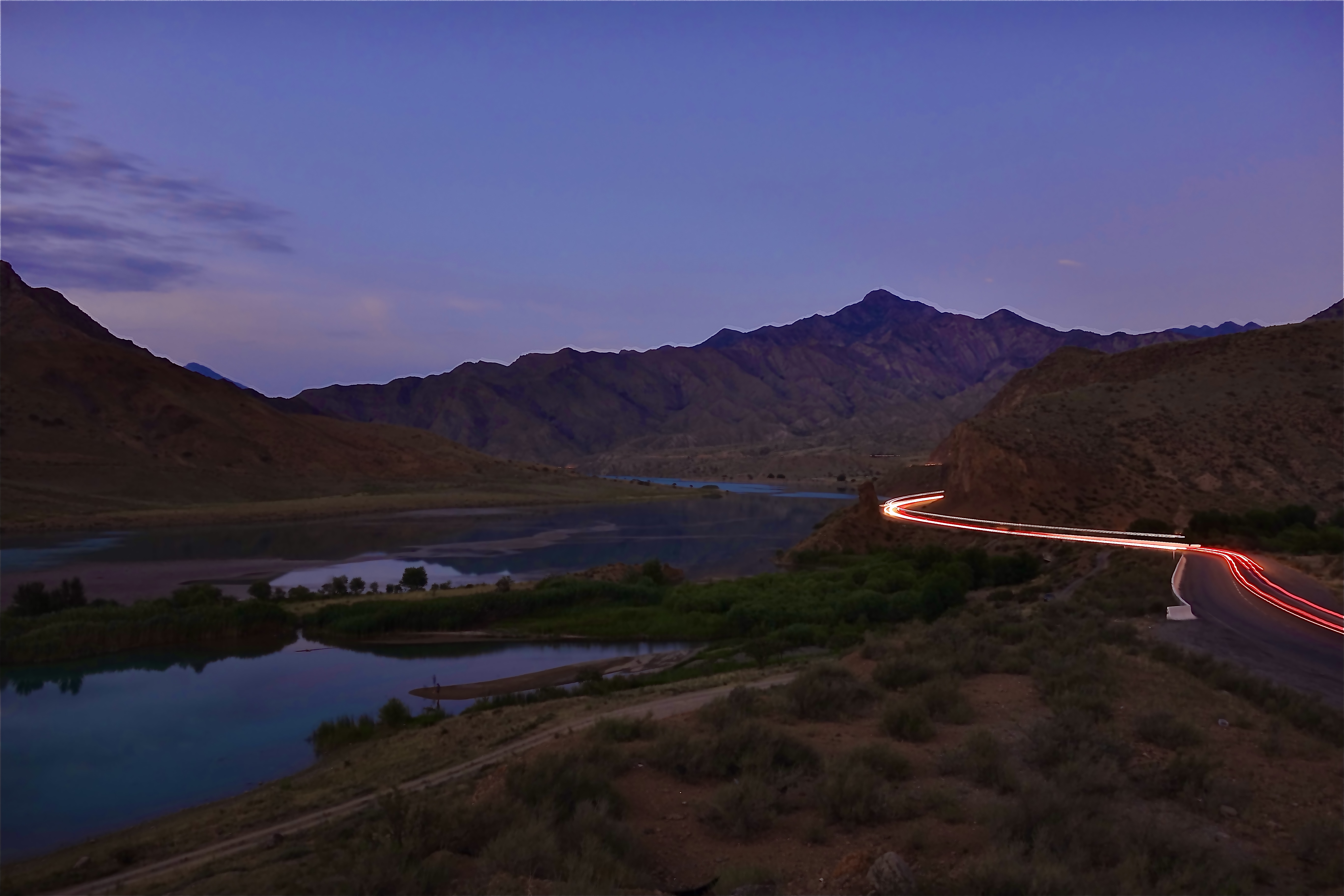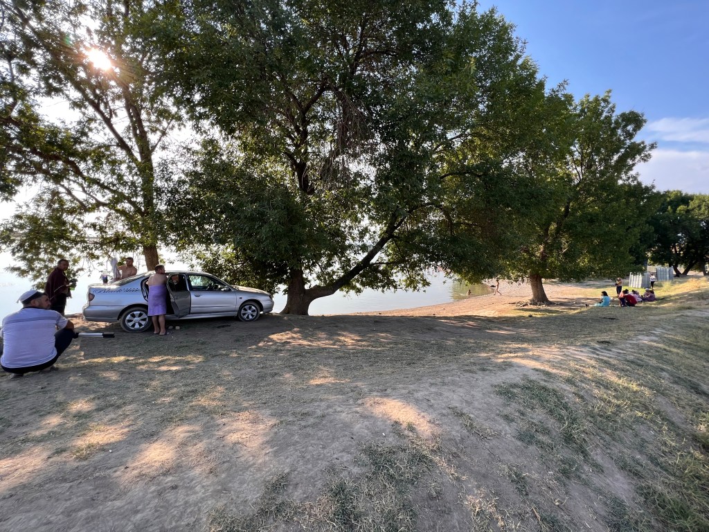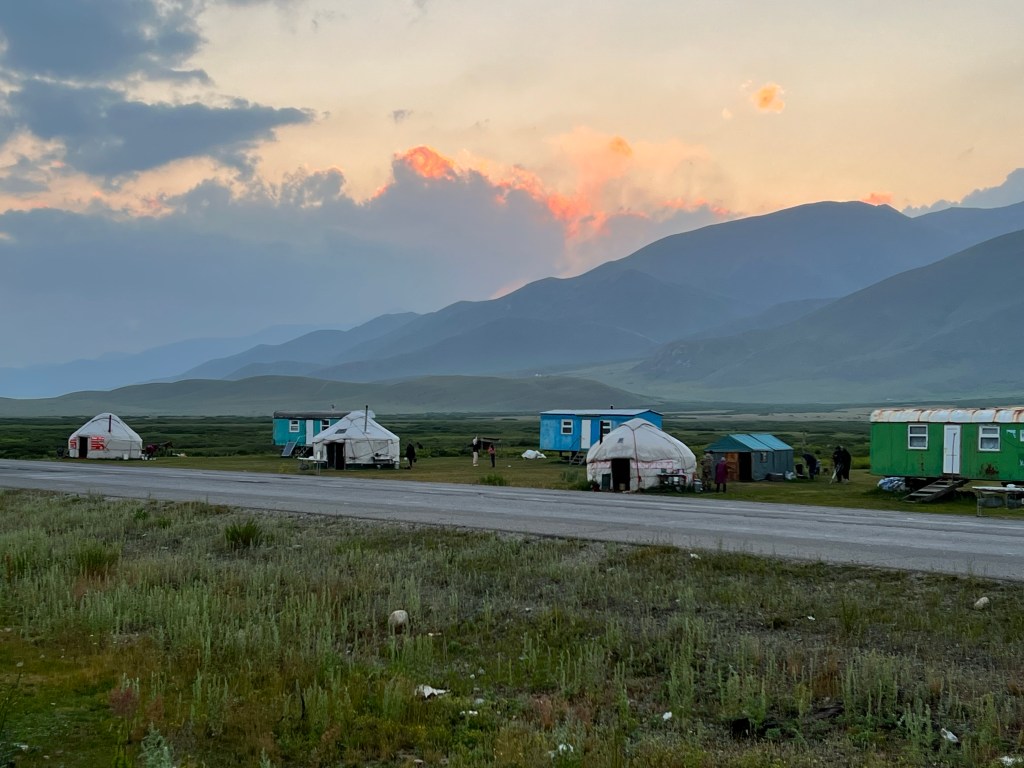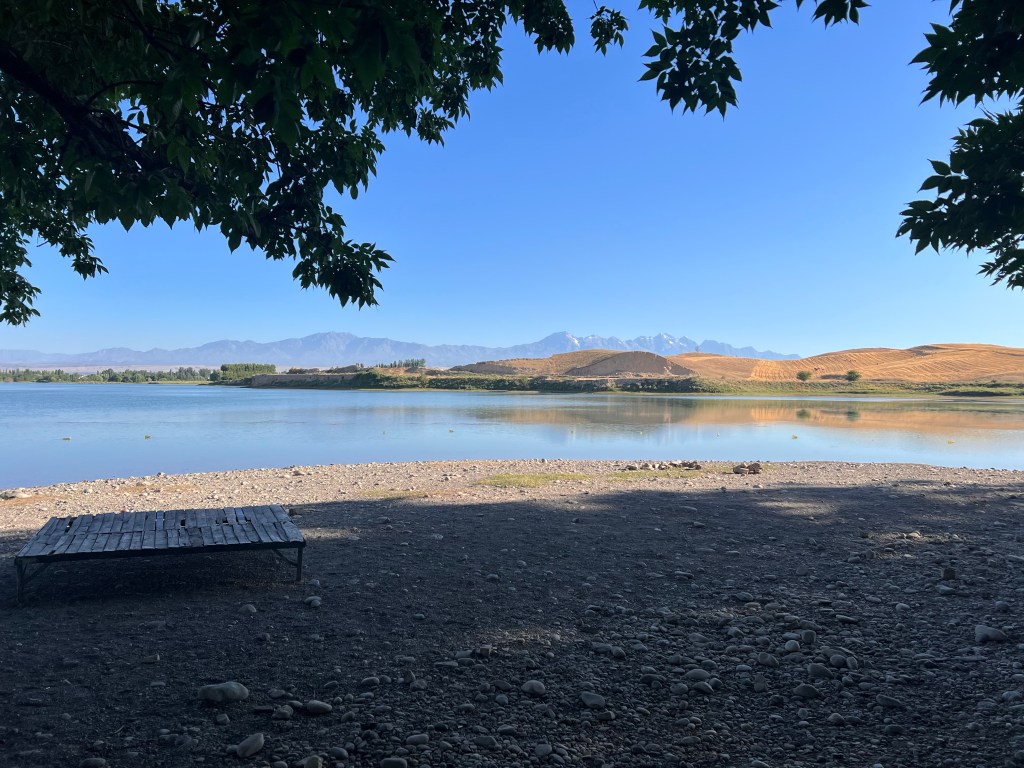 Ich machte dann ausgiebig Mittag und fuhr dann nach 3 h Pause weiter. Ich fand einen großen Baggersee an der Straße, welchen ich ansteuerte. Dort war ein kleiner Imbiss und viele Kirgisen, die sich dort abkühlten bei den heißen Temperaturen von über 35 Grad. Ich nutzte auch die Möglichkeit zur Abkühlung und wurde natürlich gleich von unzähligen Kirgisen angesprochen, wo ich herkomme, wohin ich will und so weiter. Mit meinen wenigen Russisch-Kenntnissen komme ich doch immer wieder sehr weit hier. Russisch ist neben Kirgisisch Zweitsprache hier und wird von mehr als 50% der Menschen gesprochen. Ich kochte mir Nudeln zum Abendessen und genoss die Atmosphäre am See, mit einem grandiosen Sonnenuntergang direkt vor mir. Nach Sonnenuntergang zog wieder wie aus dem Nichts ein Wind auf, der mich an letzte Nacht denken lies. Ich wartete bis alle Gäste verschwunden waren und sicherte mir dann direkt am Strand und Bäumen eine Sitzgelegenheit, um hier meinen Schlafplatz zu errichten, natürlich ohne Zelt. Die Nacht war sehr angenehm, vor allem weil ich mir einen Windschutz baute und so gut ausgeschlafen am nächsten Morgen aufwachte. Die Szenerie am Morgen mit der aufgehenden Sonne war magisch und ich genoss das Ganze sehr, auch wenn das heißt später in der Hitze zu starten. Wenn ich heute gut durchziehe, dann schaffe ich die 115 km bis nach Osh, war mein Plan. Es ging recht schleppend voran und nach ein paar Kilometern stand auch schon der erste Berg vor mir, den ich doch mehr schlecht als recht bezwang. Nach der nächsten Abfahrt wurde ich langsam warm, besorgte mir erstmal Snacks und Wasser. Denn der nächste Berg mit gut 500 hm stand vor der Tür. Die Straßen an dem Tag, sowie dem Tag zuvor, waren teilweise in höllischem Zustand, mit Schlaglöchern und Bodenwellen übersäht. Da macht das Fahren keine Freude. Auch wurde an manchen Stellen die Straße komplett erneuert und es war nur Schotter und Schlamm, auf dem ich fuhr. Zur Staubbekämpfung fährt immer ein Lkw mit Bewässerungsvorrichtung die Piste ab. Das hilft zwar teilweise gegen den Staub, der Dreck bleibt trotzdem.