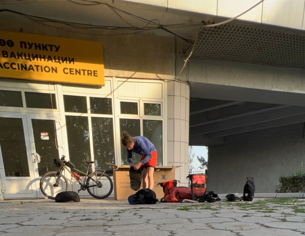 In Bishkek bin ich gegen halb 6 Uhr frühs nach gut 10h Flug gelandet, nach deutscher Zeit 2 Uhr nachts. Als Deutscher kann man sich 60 Tage Visa-frei im Land aufhalten und nach kurzem Passport-Check und Einreise-Stempel ging es zur Gepäckausgabe, um zu schauen, ob es denn mein Rad auch geschafft hat. Und siehe da, nach ein wenig Wartezeit tauchte mein Radkarton auf und so war ich doch sehr erleichtert die Reise nach Bishkek mit dem Rad anzutreten und nicht im Taxi.
