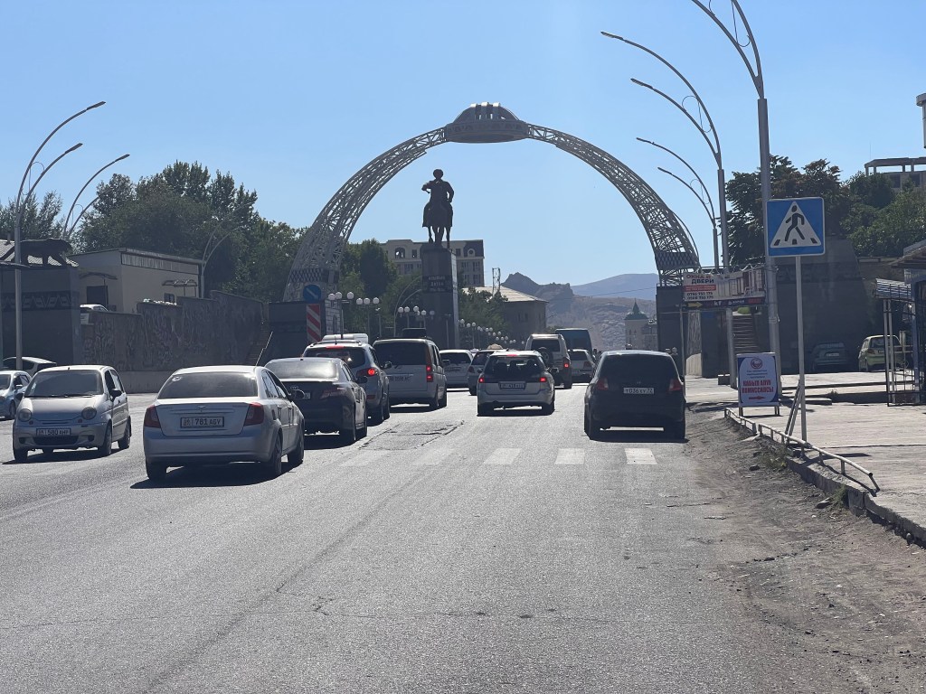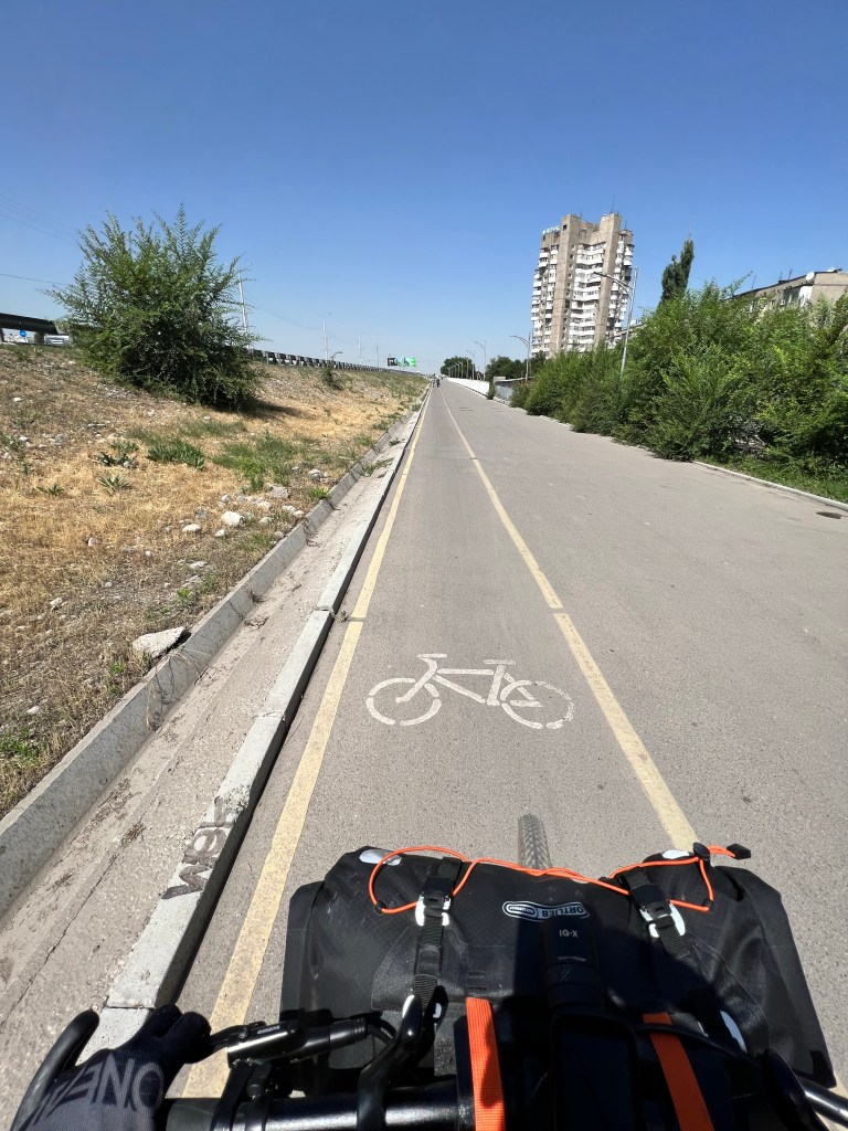 Vom Flughafen bis ins Tunduk Hostel in Bishkek waren es ca. 36km ohne nennenswerte Steigungen. Die Temperaturen waren frühs um 7 Uhr noch akzeptabel, doch es wurde gefühlt viel zu schnell warm. Ich fuhr anfangs auf wenig befahrenen Straßen Richtung Bishkek. Je näher ich der Stadt kam, umso heftiger wurde der Verkehr. Ich bin immer sehr fasziniert davon in große Städte reinzufahren, weil sich das ganze Umfeld konstant ändert. Von Vororten ohne Infrastruktur zu komplett ausgebauter Infrastruktur im Zentrum.