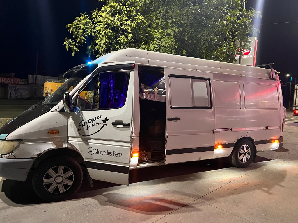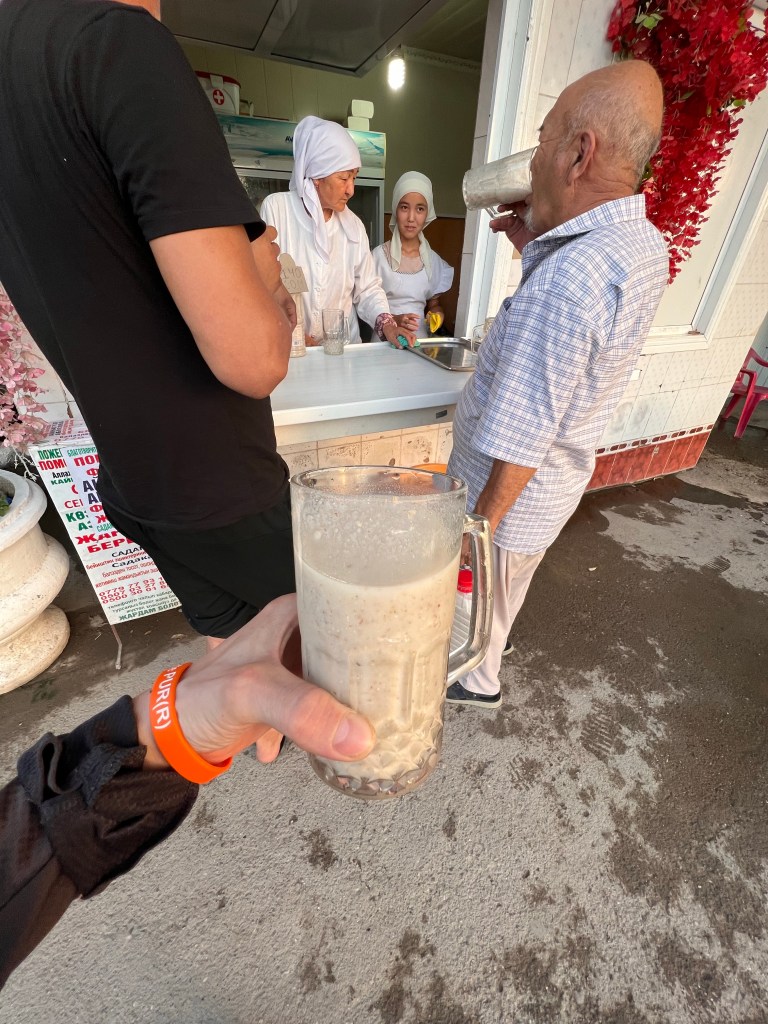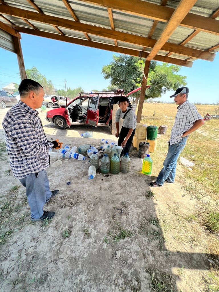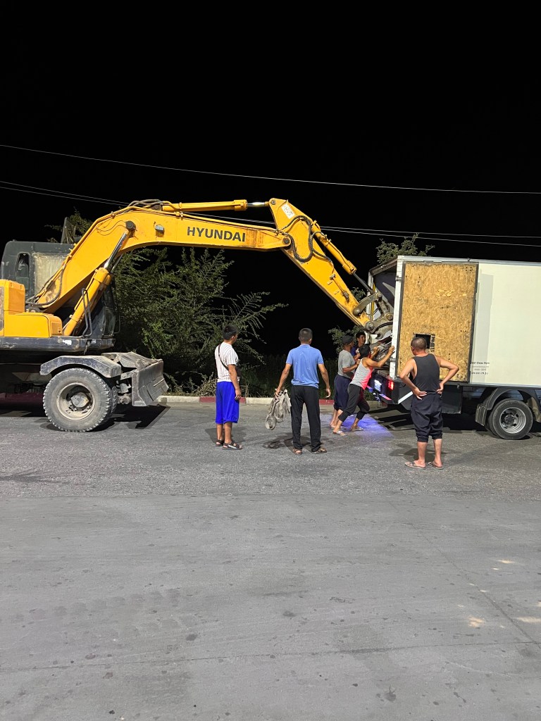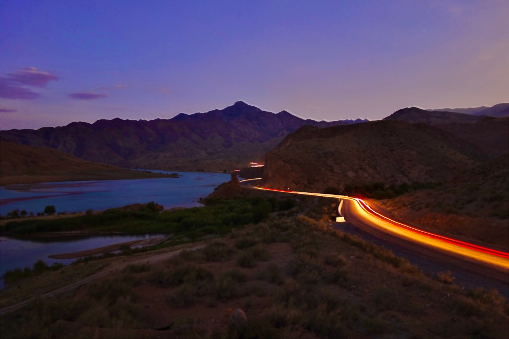 Nach dem alle wieder ins Auto gekrabbelt waren, ging die rasante Fahrt weiter. Währenddessen wurde ich von allen Seiten interviewed und mit allen möglichen Fragen gelöchert. Wie viele Kinder ich hätte, ob verheiratet, Beruf und ganz wichtig: was für ein Auto ich fahre. Die Jungs waren absolute Mercedes-Fans und waren ein wenig enttäuscht, dass ich selbst keinen fahre. Der Mercedes-Sprinter, mit dem wir unterwegs waren, hatte knapp 700.000 km runter und von außen waren schon etliche Kampfspuren ersichtlich. Das Tempo war weiterhin rasant und es wurde überholt, wo es nur ging. In einer größeren Stadt hielten wir plötzlich an und die Jungs forderten mich auf, mit ihnen zu kommen. Wir gingen an einen kleinen Verkaufsstand, wo es Jarma gab, die Coca Cola Kirgisistan’s, wie mir gesagt wurde. Jarma ist ein Kaltgetränk aus gemahlenen Gertreide, was fermentiert wird und mit Ayran gemischt wird. Ja, was soll ich sagen, das hat scheußlich geschmeckt und nach 2-3 Schlucken winkte ich dankend ab. Die Jungs lachten nur, kauften sich jeder ein 5 l Kanister von der Brühe und ab ging’s ins Auto und weiter. Ich merkte vorher schon, ‚ok, die Fahrt wird ein wenig länger dauern‘, und als der Fahrer mir sagte, dass wir gegen 06:00 Uhr in Bishkek ankämen, schaute ich nicht schlecht. Die nächsten Stunden ging die Raserei weiter und gegen 2 Uhr nachts gab es dann kurz nach einer Mautstelle die zweite Pause, nach knapp 10h. Hier sah man dann auch mal alle 7 Leute, die unter dem Dach lagen, an der frischen Luft. Nebenan wurde noch schnell eine Baggerschauffel verladen, wobei man hätte meinen können, dass die Vorderachse des Transporters gleich abhebt. Es war verblüffend zu sehen, was da nachts alles so auf den Beinen ist. Gefühlt habe ich nachts mehr Menschen und Fahrzeuge gesehen als tagsüber. Für uns ging es dann die nächsten Stunden über einige Pässe, wo wir natürlich nicht mehr ganz so so spritzig unterwegs waren. Überholt wurde trotzdem noch immer. Hier sah man dann auch unzählige Menschen und Fahrzeuge, die am Straßenrand standen und Pannen und Probleme mit ihren Fahrzeugen hatten.