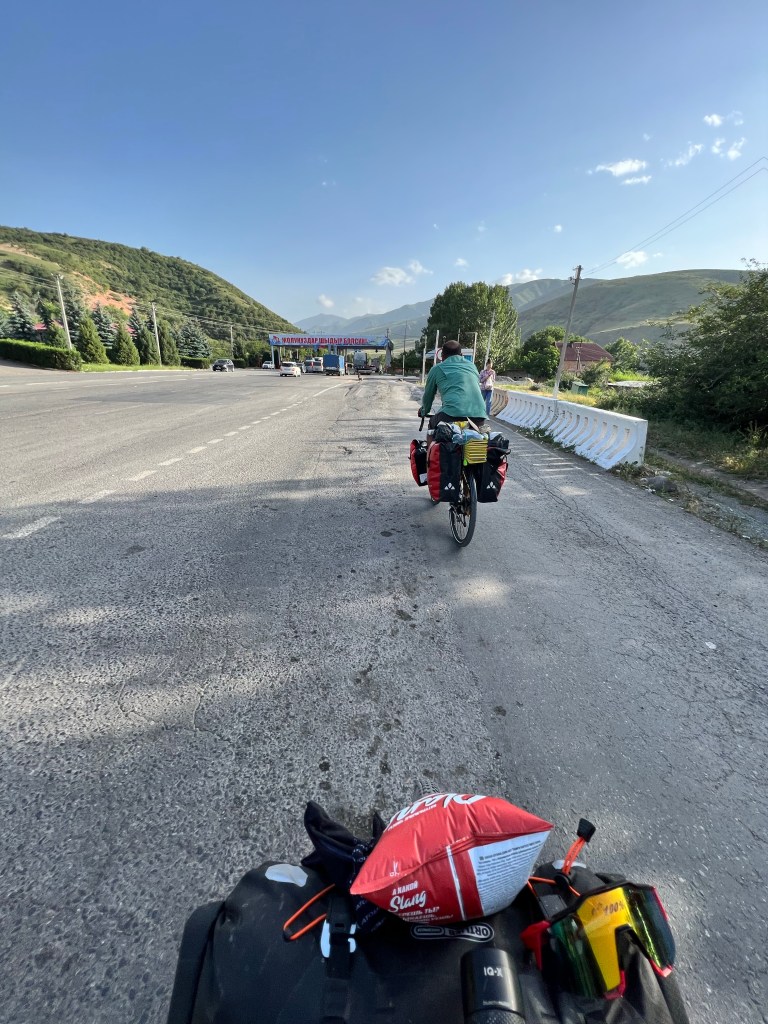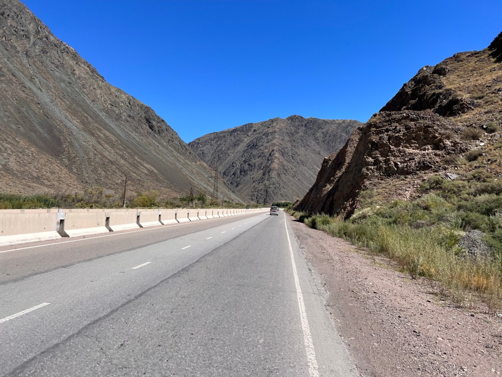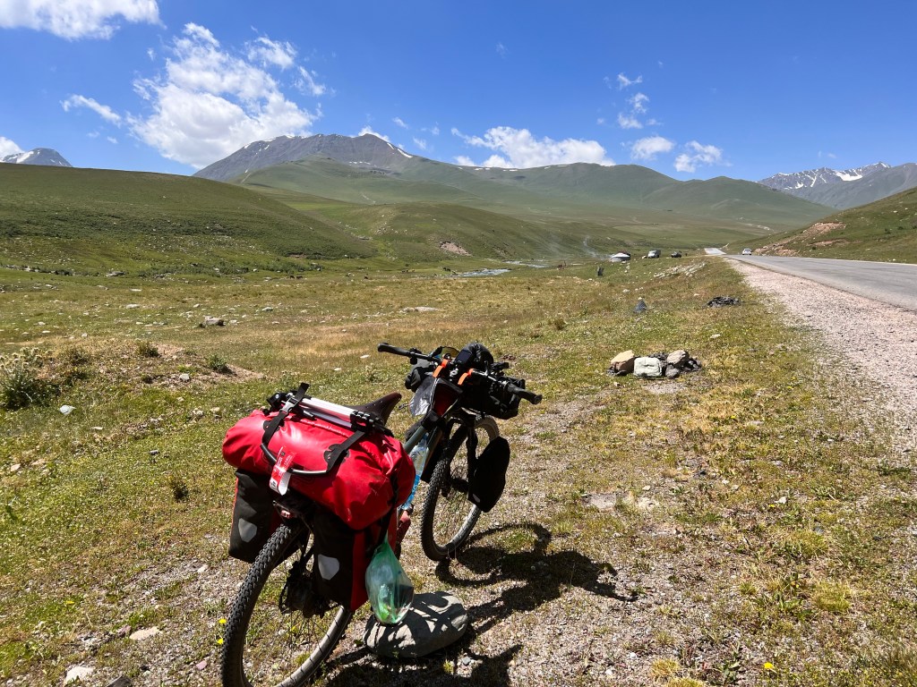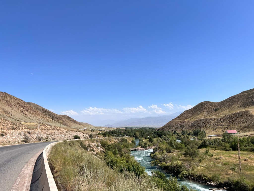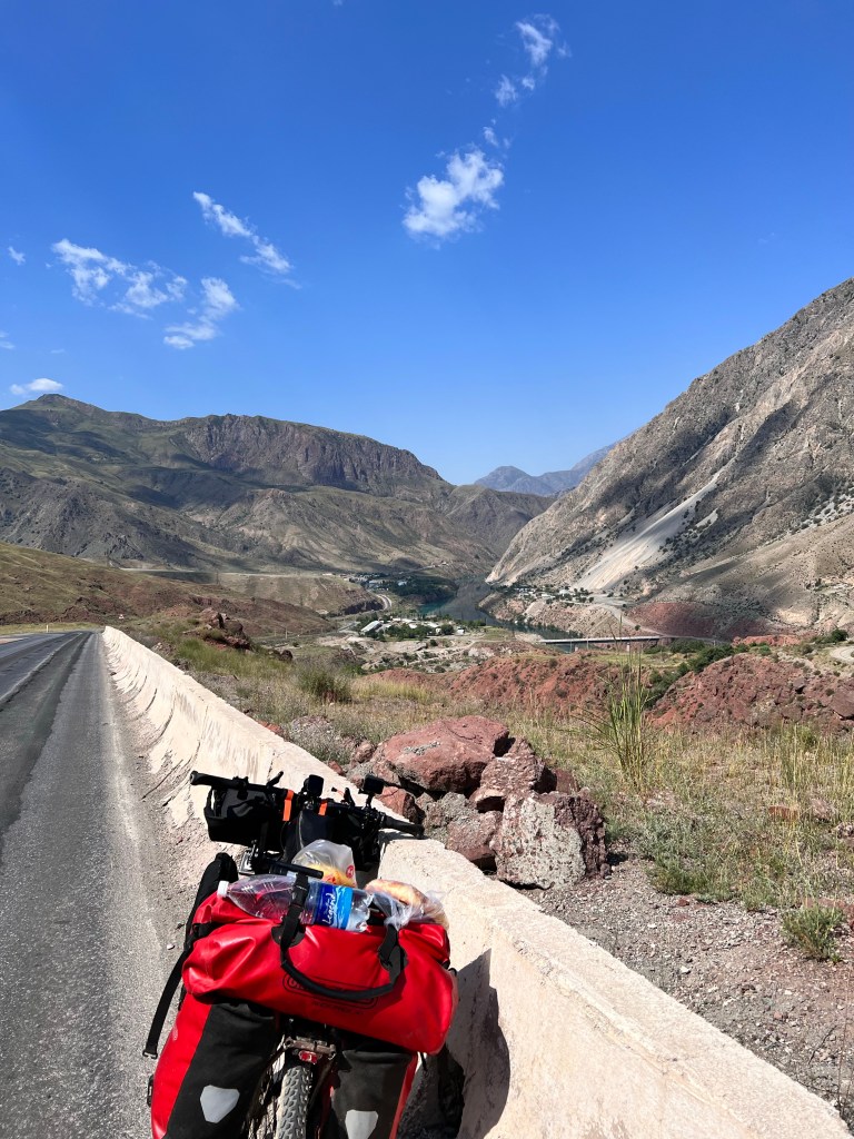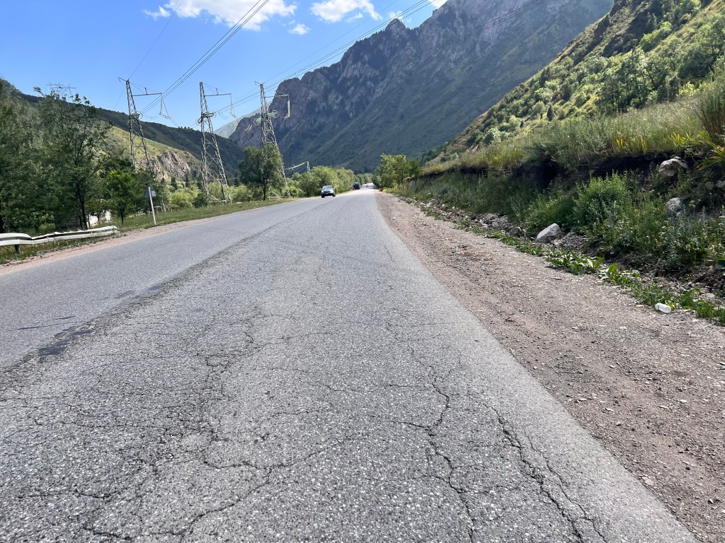 Nach dem ich mich zwei Tage in Bishkek rumgetrieben habe ging es am 6.Juli los mit radeln Richtung Osh. Ich wollte eigentlich recht früh starten um der Tageshitze zu entgehen doch so startete ich erst gegen 10:30 Uhr am Tunduk Hostel, wunderbar in die Mittagshitze. Die fahrt aus Bishkek war ganz entspannt ich fuhr auf einem extrem gut ausgebauten Radwegen bis an den Rand der Stadt. Hier gab es sogar einen Skatepark und einen Pumptrack was mich wirklich überraschte. Ich wollte diesmal wenig befahrene Straßen nehmen und naja was soll ich sagen. Keine so gute Idee. Die Straßen waren normale Straßen doch waren es hauptsächlich Schotterpisten wo es nicht so flüssig voran ging wie ich das dachte dafür aber kaum Verkehr. Am späten Nachmittag traf ich zwei türkische Reiseradler mit denen ich mich gemeinsam auf Zeltplatz suche begab. Vorher gönnte ich mir noch Plov zum Abendessen da ich keine Lust auf Kochen hatte. Die Jungs hatten entlang der Passstraße die es den nächsten Tag entlang ging einen ausgeschriebenen Zeltplatz gefunden und den steuerten wir an. Der Platz war ok und es war Fluss in der Nähe wo ich mich waschen konnte, also alles perfekt. Wir tauschten uns noch ein bisschen aus und die Jungs erzählten mir das Sie von Kirgisistan zurück in die Türkei nach Istanbul radeln wollen.