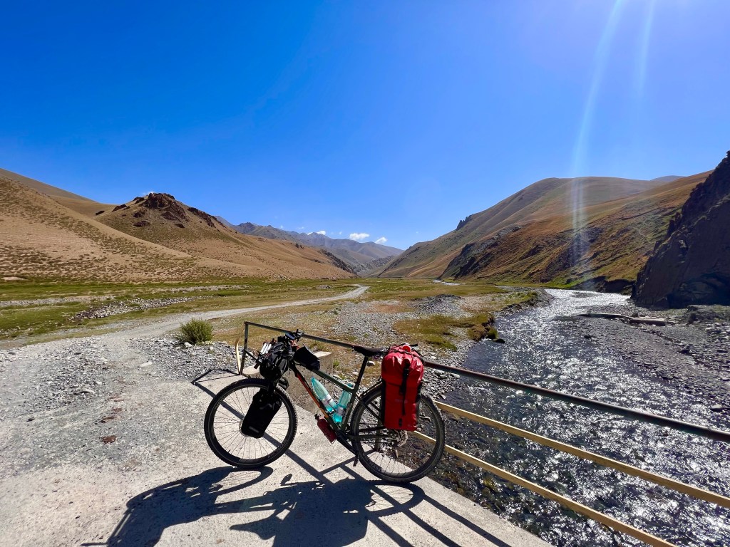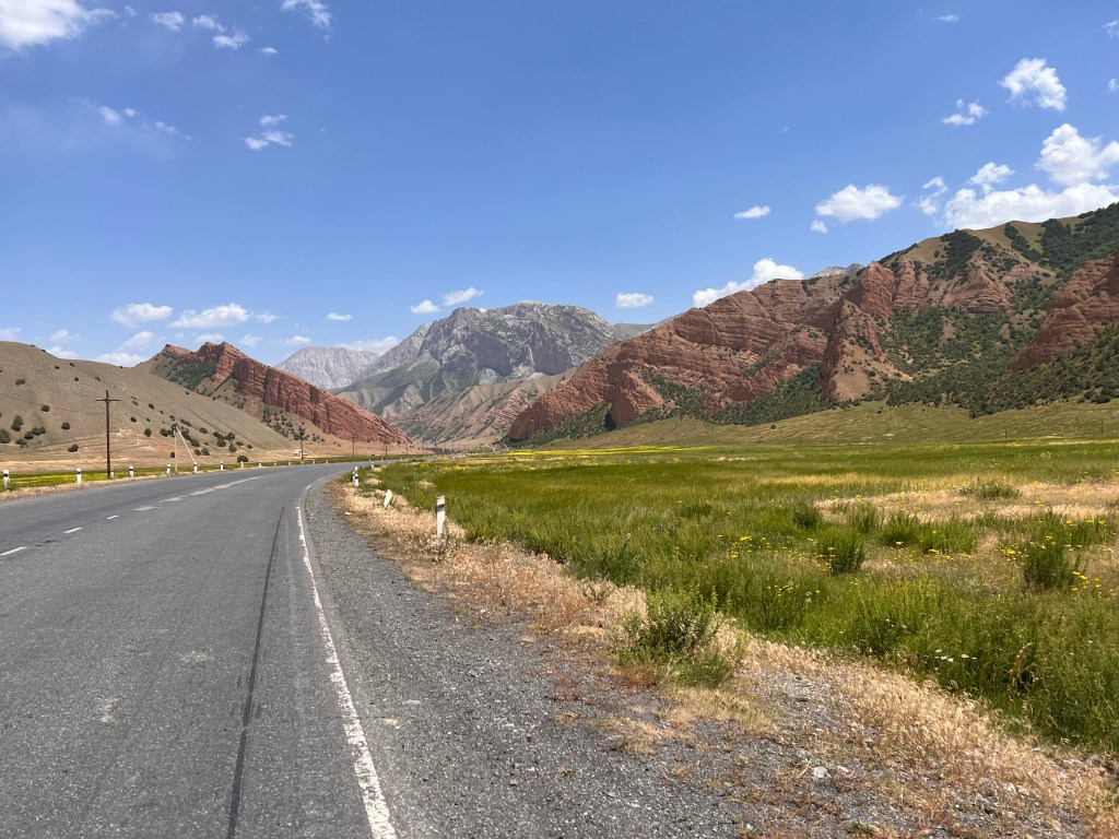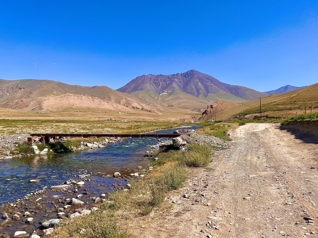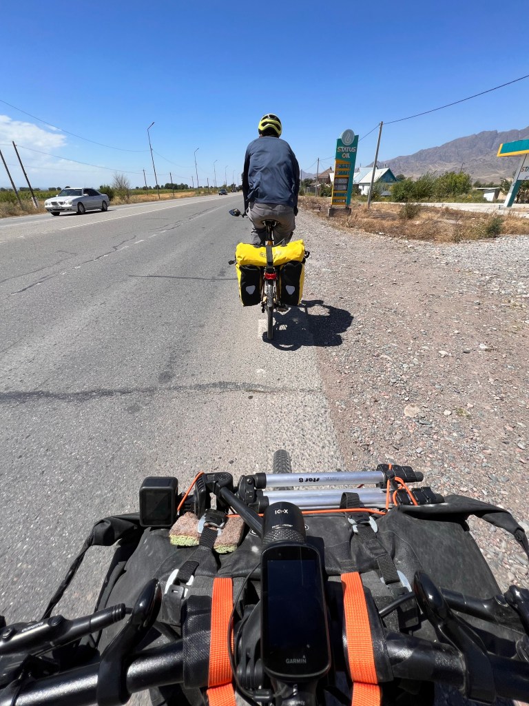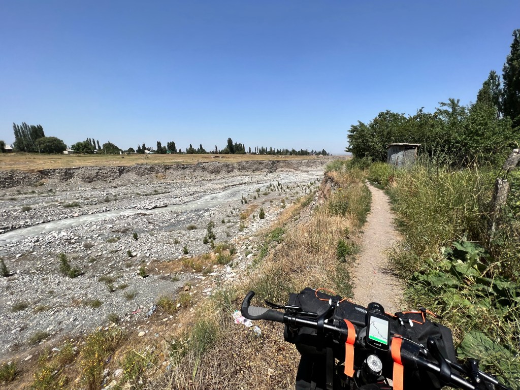 Nach dem ich mich zwei Tage in Bishkek rumgetrieben habe ging es am 6.Juli los mit radeln Richtung Osh. Ich wollte eigentlich recht früh starten um der Tageshitze zu entgehen doch so startete ich erst gegen 10:30 Uhr am Tunduk Hostel, wunderbar in die Mittagshitze. Die fahrt aus Bishkek war ganz entspannt ich fuhr auf einem extrem gut ausgebauten Radwegen bis an den Rand der Stadt. Hier gab es sogar einen Skatepark und einen Pumptrack was mich wirklich überraschte. Ich wollte diesmal wenig befahrene Straßen nehmen und naja was soll ich sagen. Keine so gute Idee. Die Straßen waren normale Straßen doch waren es hauptsächlich Schotterpisten wo es nicht so flüssig voran ging wie ich das dachte dafür aber kaum Verkehr. Am späten Nachmittag traf ich zwei türkische Reiseradler mit denen ich mich gemeinsam auf Zeltplatz suche begab. Vorher gönnte ich mir noch Plov zum Abendessen da ich keine Lust auf Kochen hatte. Die Jungs hatten entlang der Passstraße die es den nächsten Tag entlang ging einen ausgeschriebenen Zeltplatz gefunden und den steuerten wir an. Der Platz war ok und es war Fluss in der Nähe wo ich mich waschen konnte, also alles perfekt. Wir tauschten uns noch ein bisschen aus und die Jungs erzählten mir das Sie von Kirgisistan zurück in die Türkei nach Istanbul radeln wollen.