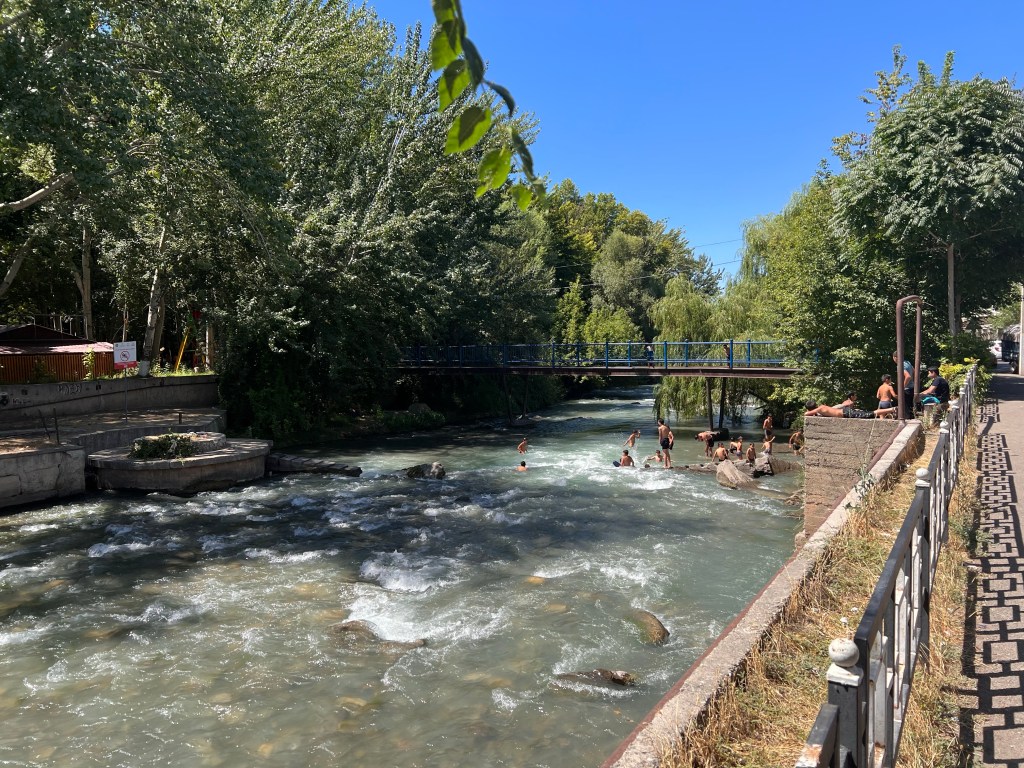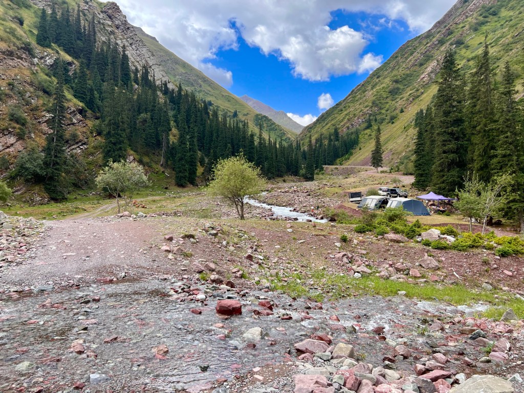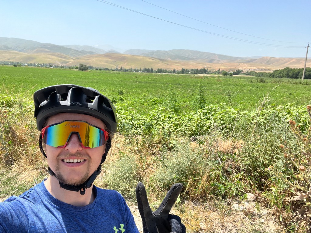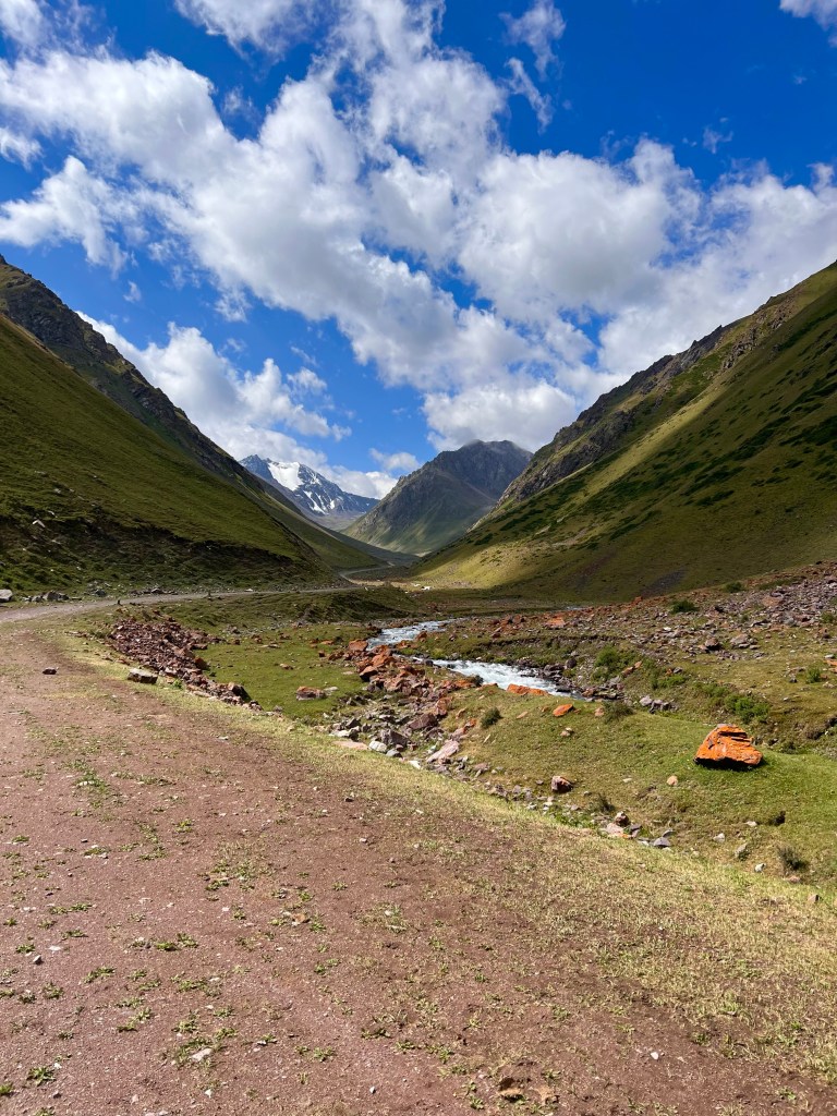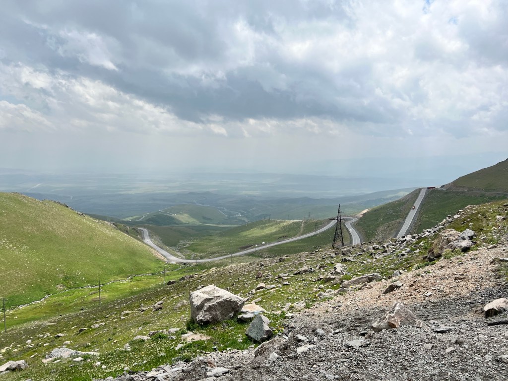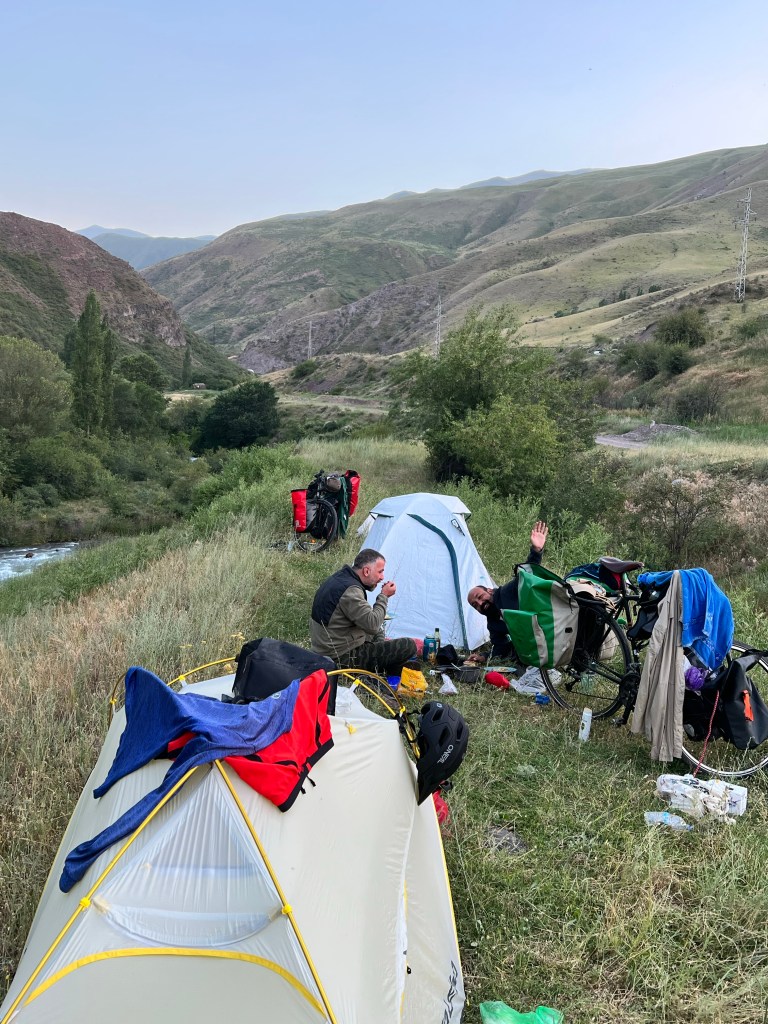Nach dem ich mich zwei Tage in Bishkek rumgetrieben habe ging es am 6.Juli los mit radeln Richtung Osh. Ich wollte eigentlich recht früh starten um der Tageshitze zu entgehen doch so startete ich erst gegen 10:30 Uhr am Tunduk Hostel, wunderbar in die Mittagshitze. Die fahrt aus Bishkek war ganz entspannt ich fuhr auf einem extrem gut ausgebauten Radwegen bis an den Rand der Stadt. Hier gab es sogar einen Skatepark und einen Pumptrack was mich wirklich überraschte. Ich wollte diesmal wenig befahrene Straßen nehmen und naja was soll ich sagen. Keine so gute Idee. Die Straßen waren normale Straßen doch waren es hauptsächlich Schotterpisten wo es nicht so flüssig voran ging wie ich das dachte dafür aber kaum Verkehr. Am späten Nachmittag traf ich zwei türkische Reiseradler mit denen ich mich gemeinsam auf Zeltplatz suche begab. Vorher gönnte ich mir noch Plov zum Abendessen da ich keine Lust auf Kochen hatte. Die Jungs hatten entlang der Passstraße die es den nächsten Tag entlang ging einen ausgeschriebenen Zeltplatz gefunden und den steuerten wir an. Der Platz war ok und es war Fluss in der Nähe wo ich mich waschen konnte, also alles perfekt. Wir tauschten uns noch ein bisschen aus und die Jungs erzählten mir das Sie von Kirgisistan zurück in die Türkei nach Istanbul radeln wollen.