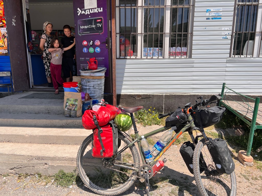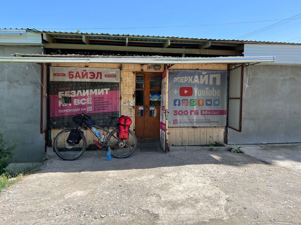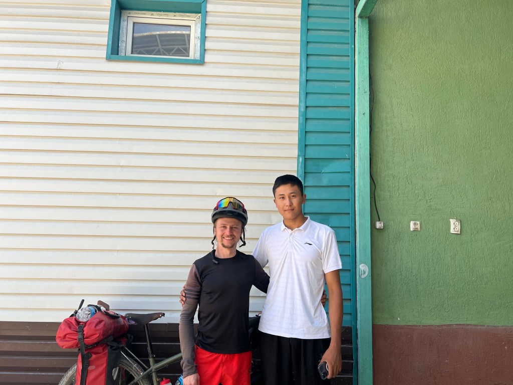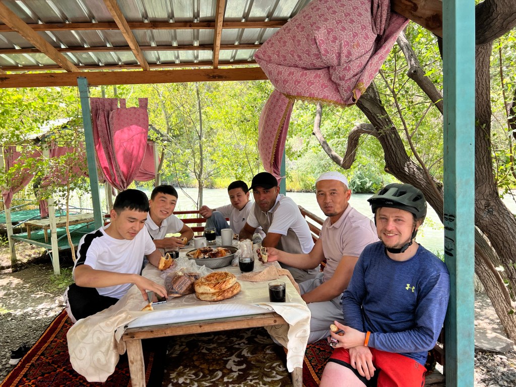 Ich bin gegen 7:30 Uhr in Osh gestartet, um der Hitze von fast 40°C täglich ein wenig zu entgehen. Ich habe erstmal noch ein wenig Proviant aufgefüllt mit Wasser und Snacks. Ich war froh aus Osh raus zu sein, weil der Verkehr und die ganzen Abgase mir keine Freude machen. So dauerte es auch nicht lange und der Verkehr lies spürbar nach. Nachdem ich in einem Magazin (Einkaufsladen) mir noch was zu Essen besorgte, kam ich mit Erzat, der im Laden arbeitete, ins Gespräch. Er erzählte mir, dass er einen Deutsch-Kurs in Osh besuchte und wollte nun seine Kenntnisse im Gespräch mit mir anwenden. Wir unterhielten uns ein wenig und er war so happy darüber, dass er mich zum Essen einlud. An den Laden war ein großes Restaurant angeschlossen, welches seiner Familie gehörte. Dort bekam ich Tee, Brot und 2x Samsa aufgetischt. Samsa sind mit Fleisch gefüllte, sehr würzige Brottaschen, die enorm lecker sind. Nachdem wir noch Adressen ausgetauscht und Fotos gemacht haben, verabschiedete ich mich und fuhr weiter.