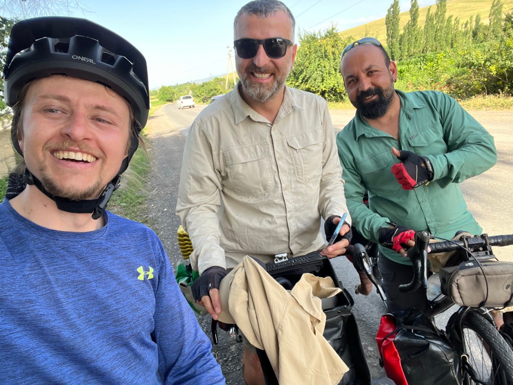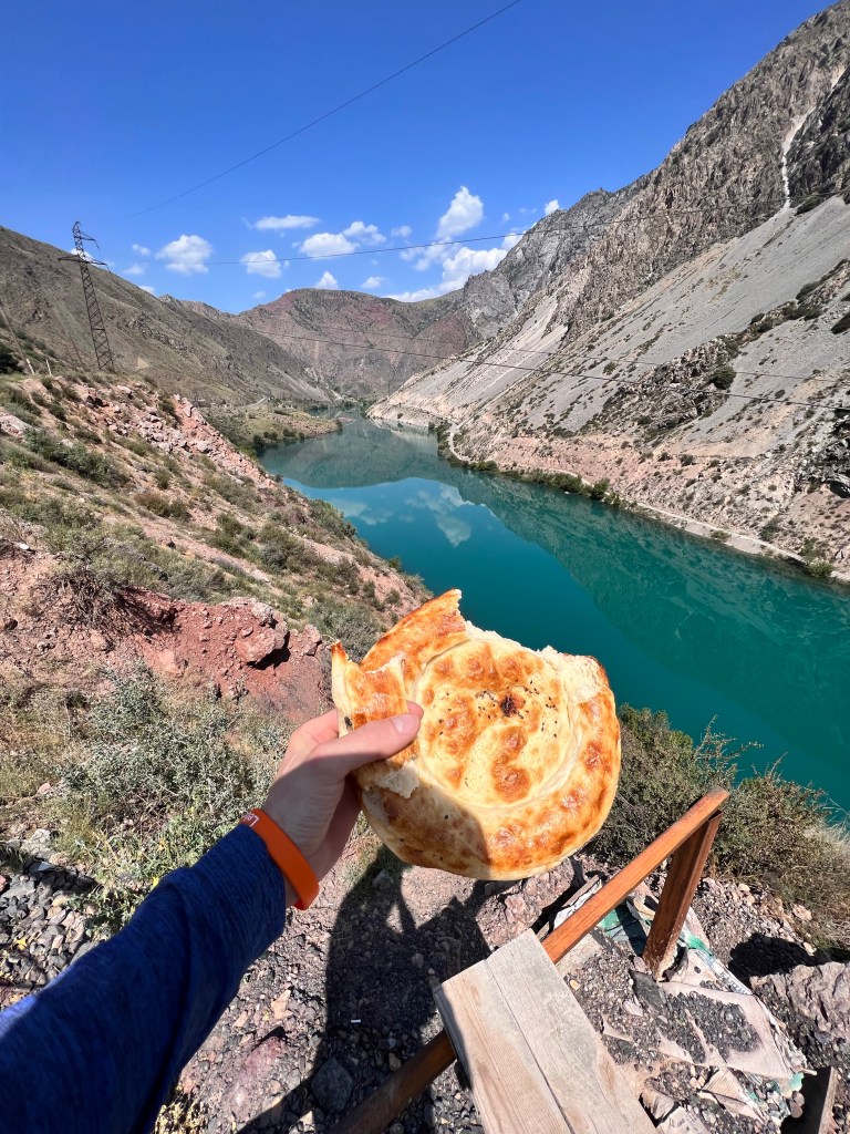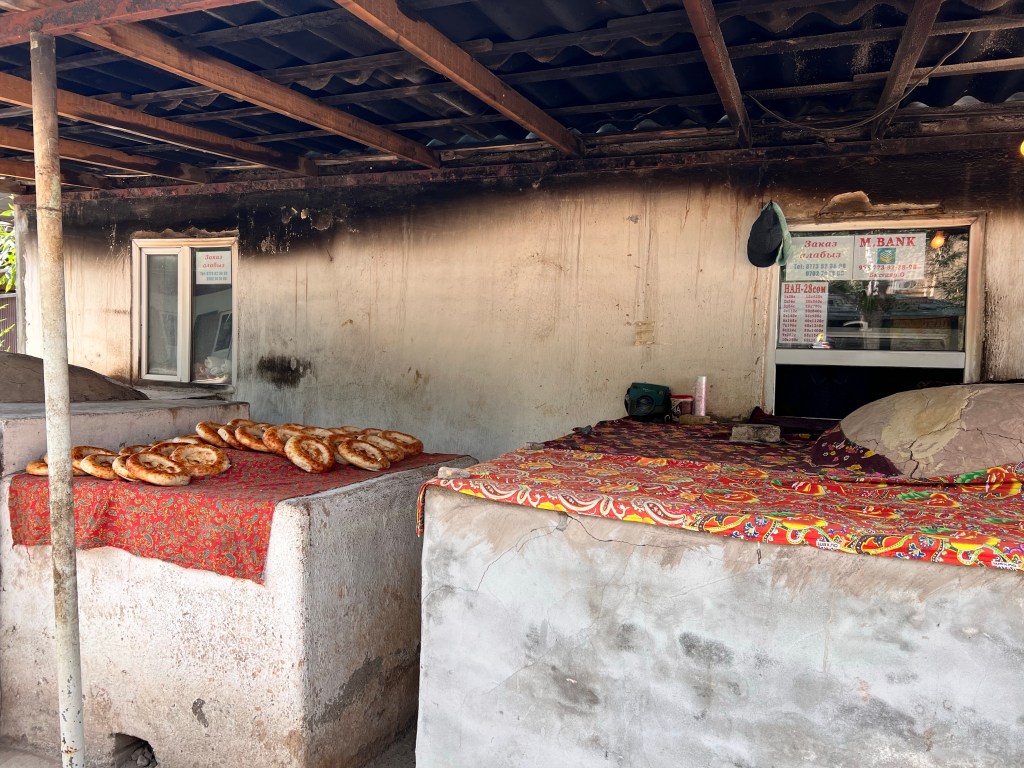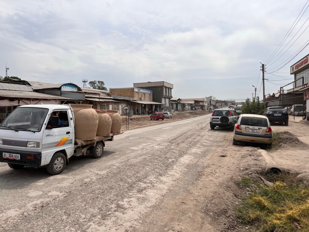Ich bin gegen 7:30 Uhr in Osh gestartet, um der Hitze von fast 40°C täglich ein wenig zu entgehen. Ich habe erstmal noch ein wenig Proviant aufgefüllt mit Wasser und Snacks. Ich war froh aus Osh raus zu sein, weil der Verkehr und die ganzen Abgase mir keine Freude machen. So dauerte es auch nicht lange und der Verkehr lies spürbar nach. Nachdem ich in einem Magazin (Einkaufsladen) mir noch was zu Essen besorgte, kam ich mit Erzat, der im Laden arbeitete, ins Gespräch. Er erzählte mir, dass er einen Deutsch-Kurs in Osh besuchte und wollte nun seine Kenntnisse im Gespräch mit mir anwenden. Wir unterhielten uns ein wenig und er war so happy darüber, dass er mich zum Essen einlud. An den Laden war ein großes Restaurant angeschlossen, welches seiner Familie gehörte. Dort bekam ich Tee, Brot und 2x Samsa aufgetischt. Samsa sind mit Fleisch gefüllte, sehr würzige Brottaschen, die enorm lecker sind. Nachdem wir noch Adressen ausgetauscht und Fotos gemacht haben, verabschiedete ich mich und fuhr weiter.