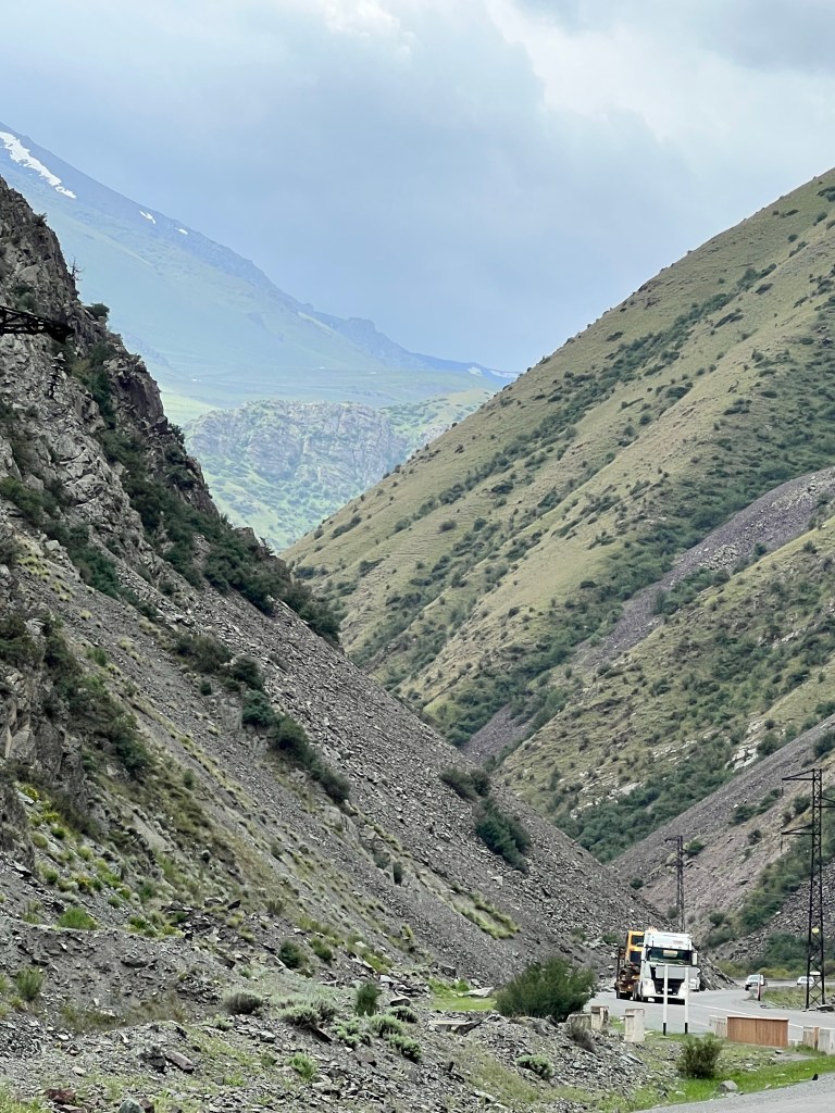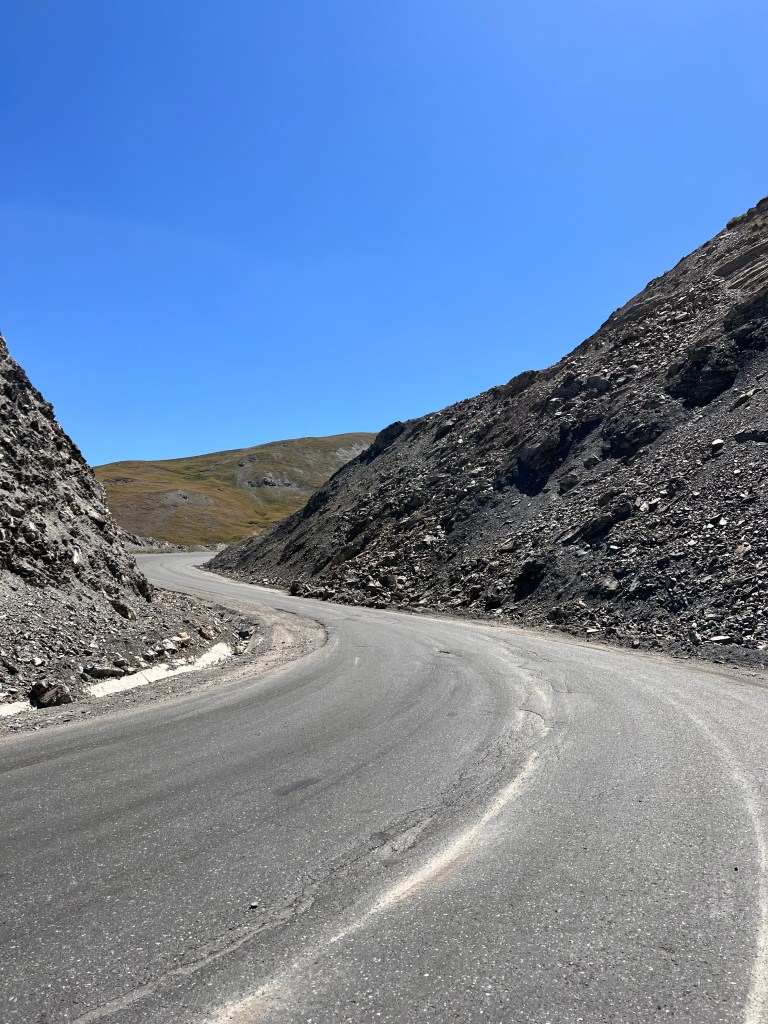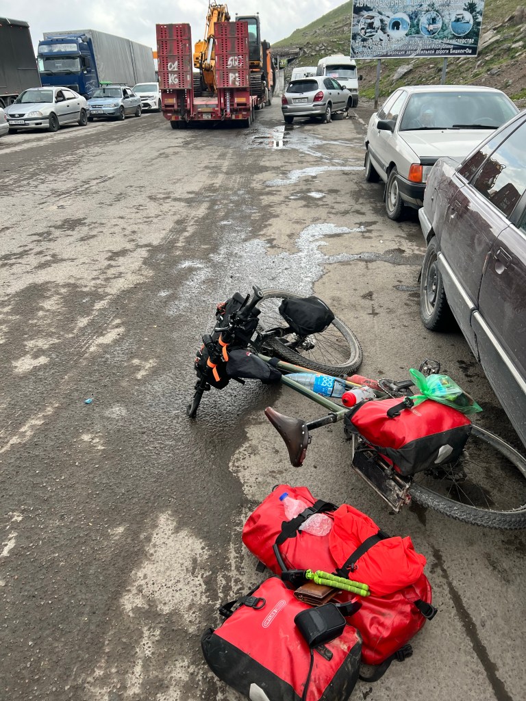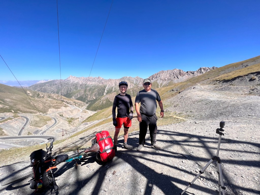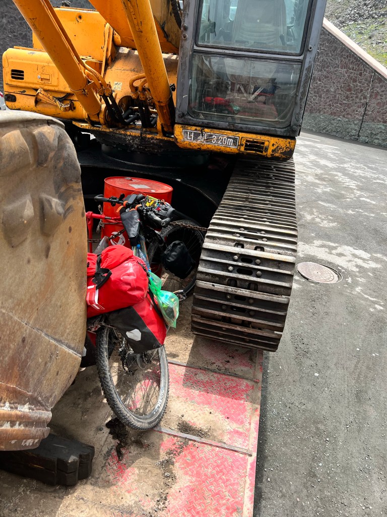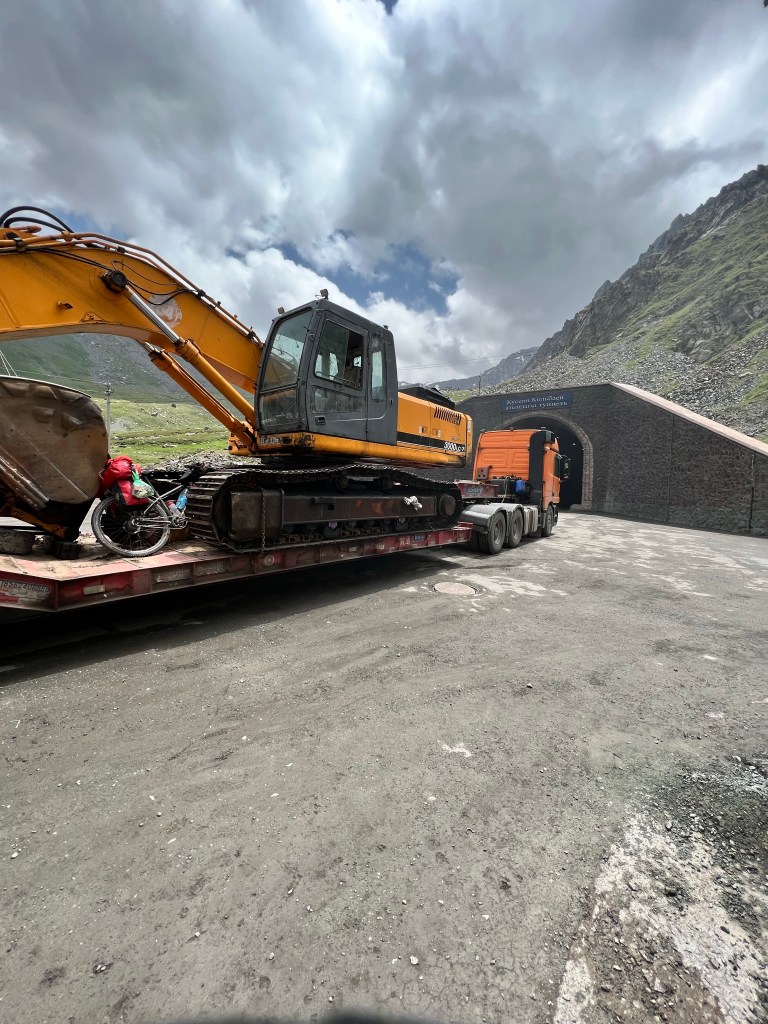 Am nächsten morgen ging es für mich um 6 aus dem Zelt um rechtzeitig zu starten weil heute der Too Ashu Pass bezwungen werden soll. Ich hatte hier ca. 50km mit knapp 2000hm auf dem Programm. Ich frühstückte und verabschiedete mich von den Jungs die noch im Zelt lagen. Ich starte auf etwa 1200m Meereshöhe und bis ca. 2200m geht die Straße sehr angenehm bergauf. Die letzten 1000hm haben es dann in sich und ich musste dann hier doch öfters anhalten als mir lieb war. Ab ca. 2500m höhe musste ich fast jeden Kilometer pausieren merkte ich doch die Höhe immer mehr. So hangelte ich mich Serpentine für Serpentine nach oben. Ich lieferte mir mit einem voll beladenen LKW über 2-3 Kurven ein Rennen da er fast noch langsamer war als ich. Als ich dann pausierte ergriff ich die Chance und hielt mich an der hinteren Bordwand fest und lies mich dann ca. 3km mit nach oben ziehen. Was sich zwar easy anhört doch auch einiges an Anstrengung bereit hält. Der LKW hielt dann noch mal an und ich ging die letzten 2km des Passes an. Oben angekommen auf 3200m war es doch recht frisch. Um auf die andere Seite des Passes zu kommen muss man einen Tunnel durchqueren. Ich radelte in Richtung Tunnel und wollte einen Blick hinein werfen. Ich wurde von der Tunnelpolizei abgefangen und darauf hingewiesen Radfahren verboten im Tunnel weil zu gefährlich. Das kannte ich schon von unserer Reise aus 2017. Diesmal erwischte ich ein deutlich angenehmeres Taxi als beim letzten mal, als Patrick und ich auf einer Lkw Ladefläche mit 3 Schafen und vielen exkremten durch den Tunnel rasten. Vor dem Tunnel wartete ein Schwerlast LKW bei dem ich mein Rad zwischen den Bagger platzieren konnte. Ich durfte dann im Führerhaus Platz nehmen. Dann noch kurz warten bis der Tunnel freigegeben wird und ab gehts. Mein Rad auf dem Hänger hat die Fahrt gut überstanden und nach dem Abladen stellte ich fest meine Handschuhe lagen noch im Lkw und der war schon weitergefahren. So rollte ich die Passhöhe auf der gut ausgebauten Straße hinab und holte den Lkw schnell wieder ein. Er sah mich schon im Spiegel fuhr rechts ran und reichte mir meine Handschuhe raus. Und da soll noch mal einer sagen es gibt keine Hilfsbereitschaft.