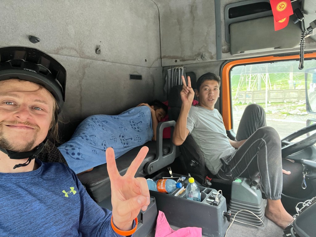 Ich denke ich bin hier in sicheren Händen Mit den beiden netten älteren Herren im Lkw Top Straßen wie immer in Kirgisistan Am Horizont geht es zum Kegety Pass wo sich schon die Gewitter Wolken sammelten Nach dem der Regen aufhörte fuhr den Pass immer weiter hoch Idealer Weg um zügig voran zu kommen 😬Mein Schlafplatz bei Nurda Hier wurde der Wasserhahn installiert und jeder wusste es besser Schöne Landschaft auf dem Weg nach oben