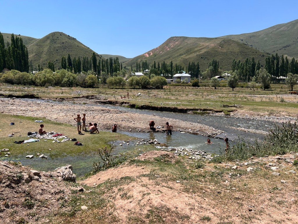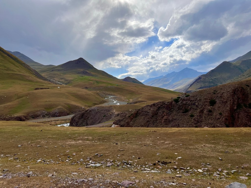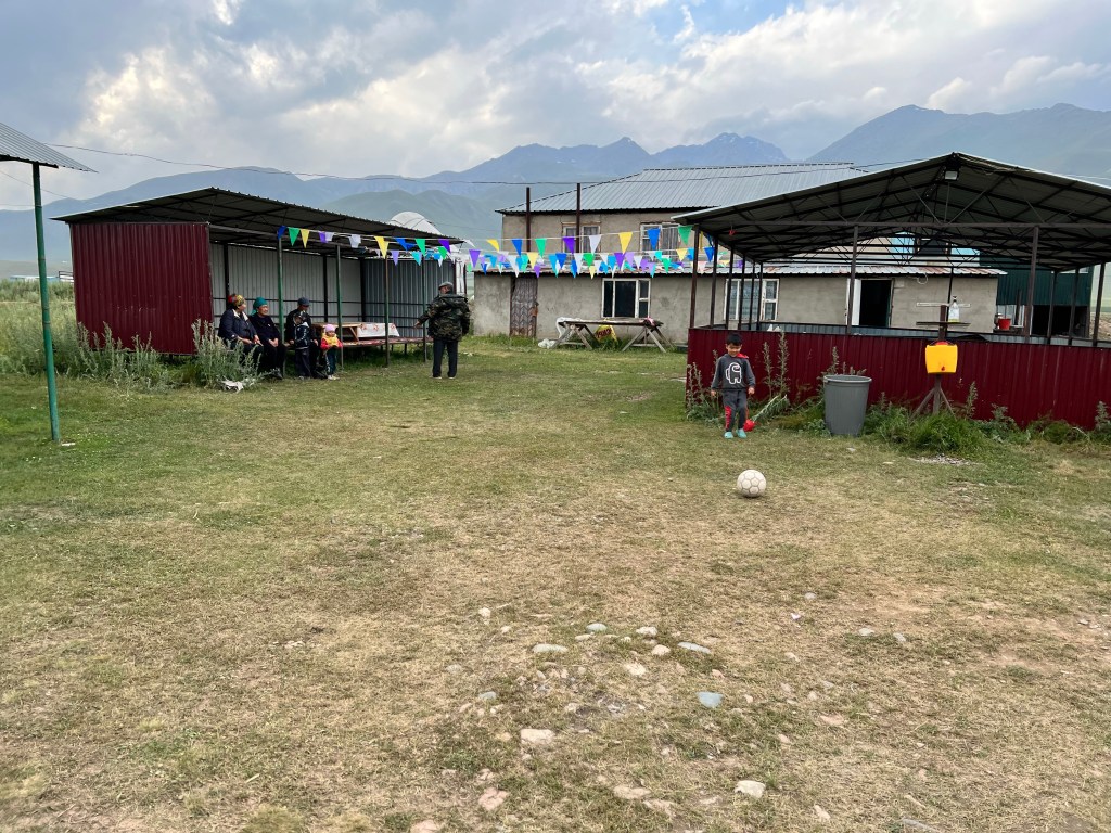 Ich fuhr dann weiter hinunter auf eine Hochplateau was auf ca. 2400m liegt und freute mich schon auf diese tolle Landschaft mit den Bergen auf der rechten und linken Seite. Die Straße schlängelt sich hier ca. 70km auf diesem Hochplateau entlang. Natürlich nicht gerade das wär zu schön. So hatte ich doch tollen Gegenwind was das fahren nicht gerade besser machte. Das Wetter war auch nicht so toll und hin und wieder regnete es leicht. So gönnte ich mir erstmal Mittag in einer Gaststätte an der Straße bevor es weiterging. Nach einem weiteren Stop um Wasser zu kaufen deute die Verkäuferin an ich könnte in der Yurte im Garten schlafen. Da ich ziemlich geschafft war dachte ich warum nicht habe ich ja noch nicht gemacht. Für 400 Som knapp 5€ willigte ich ein. Eine Yurte ist das Zuhause der kirgisischen Nomaden die auf den Hochebenen des Landes Landwirtschaft und Viehzucht betreiben. Das Dach der Yurte ist auch auf der national Flagge des Landes zu sehen hat einen großen Stellenwert in der Kirgisischen Kultur. Ich hatte die Yurte für mich alleine. Wasser zum Waschen gab es leider nicht genug, dafür aber einen Fluss in der nähe in welchem ich mich mit wundervollen klaren eiskalten Wasser waschen konnte. Danach wurde ich noch ein wenig von der Familie auf Russisch ausgequetscht woher, wohin, wie alt etc. und spielte mit den Kids Fußball. Die Nacht in der Yurte war angenehm und frisch doch mein Schlafsack hat mich schön warmgehalten.