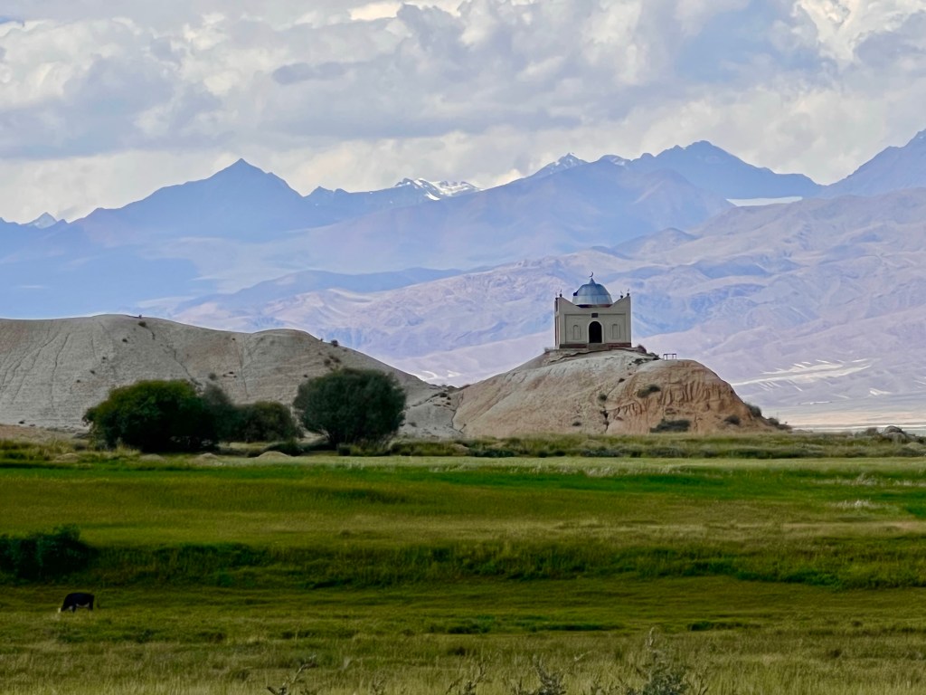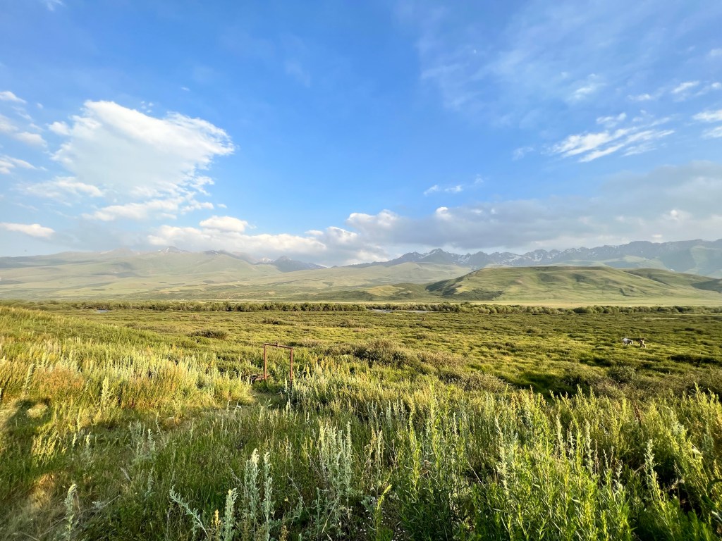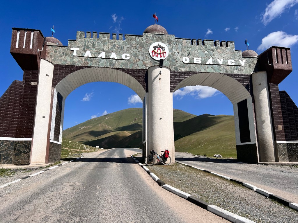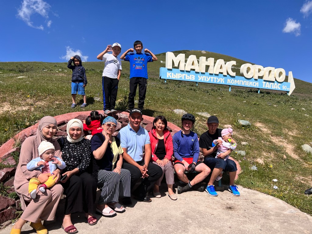 Der nächste Tag hatte besten Sonnenschein zu bieten und ich fuhr das Hochplateau weiter. Wieder mit Gegenwind der mich die nächsten Tage noch begleiten wird. Am Manas Denkmal welches dem Volkshelden aus dem 9. Jahrhundert gewidmet ist machte ich Mittagspause. Doch ich war nicht lange alleine und wurde von einer ganzen Familie umzingelt und mit russisch und ein wenig englisch kombiniert mich ausgefragten. Ich traf dann noch einen Schweizer Rentner der das Land bzgl. der Pflanzenwelt besuchte und nicht viel positives zu sagen hatte. Seiner Meinung gibts in Kirgisistan mehr Pferde als Menschen und die würden alles abgrasen. Man hat ja immer die Wahl worauf man seinen Fokus legt, ich teile seine Meinung nicht ganz.