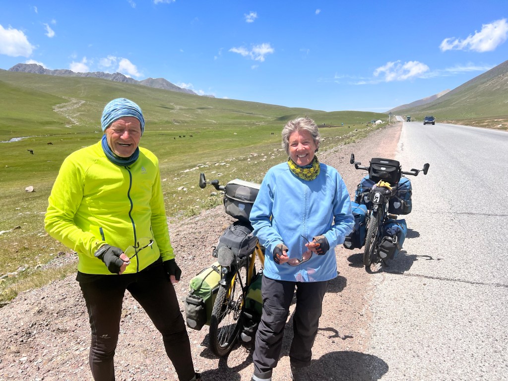 Nach der Pause ging es dann aus dem Hochplateau Richtung Ala-Bel Pass der auf ca. 3170m liegt. Hier ging es dann knapp 500hm mit moderater Steigung nach oben. Von weiten sah ich zwei Radfahrer mit Gepäck kommen und die winkten mir schon zu. Es waren Gabi 64 und ihr Bruder Walther 74 aus der Nähe von Mönchengladbach. Als die beiden mir ihr Alter verrieten war ich baff. Walter reiste schon viel umher nach dem er Rentner ist nun Vollzeit, ebenso seine Schwedter. Die beiden waren vorher in Usbekistan und Tadschikistan unterwegs und wollen jetzt Kirgisistan bereisen. Wir haben uns toll unterhalten und die beiden haben mir ein paar tolle Dinge mitgeben die mir selbst in den letzten zwei Jahren immer bewusster geworden sind. Sie sagten mir man solle seine Träume jetzt leben und nicht auf später verschieben und z.b. warten bis man Rentner ist. Denn was du heute nicht tust machst du später vermutlich auch nicht. Und schaust nur zurück und sagst hätte ich doch mal. Nur wir Menschen denken ja häufig an was könnte ich denn verlieren wenn ich jetzt ins Ungewisse springe. Die wenigsten denken dabei aber was könnte ich denn alles gewinnen dabei. Dabei sagten sie im Bezug auf das Reisen man solle nicht erst anfangen wenn man Rentner ist sondern sukzessiv das Reisen in sein Leben einplanen. Gabi sagte dann als sie noch nicht Rentnerin war besuchte sie ihren Bruder immer wenn er unterwegs war damit Sie auf dem laufenden blieb. Beide meinten auch zu mir das sie ihre Autos verkauft haben und sich dafür ihre Räder gekauft haben weil sie das Auto nicht brauchen. Walter unterhält einen sehr detaillierten Blog über seine Reisen www.radtraum.de auf dem ihr sehr gerne vorbei schauen könnt.
