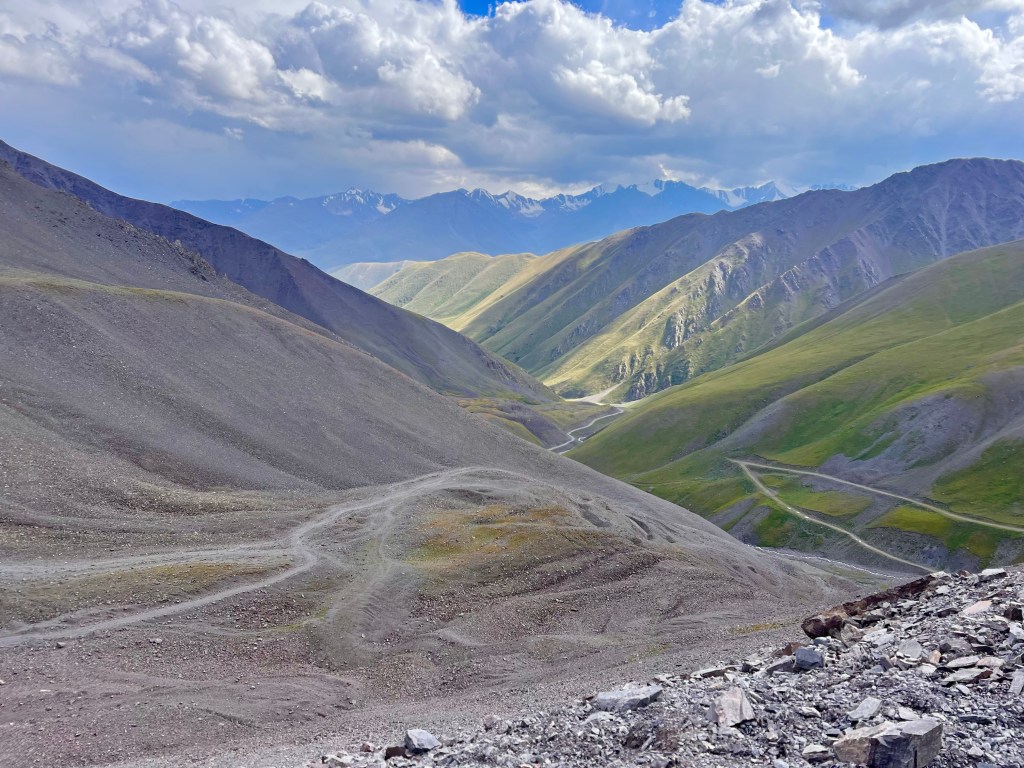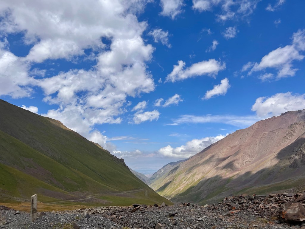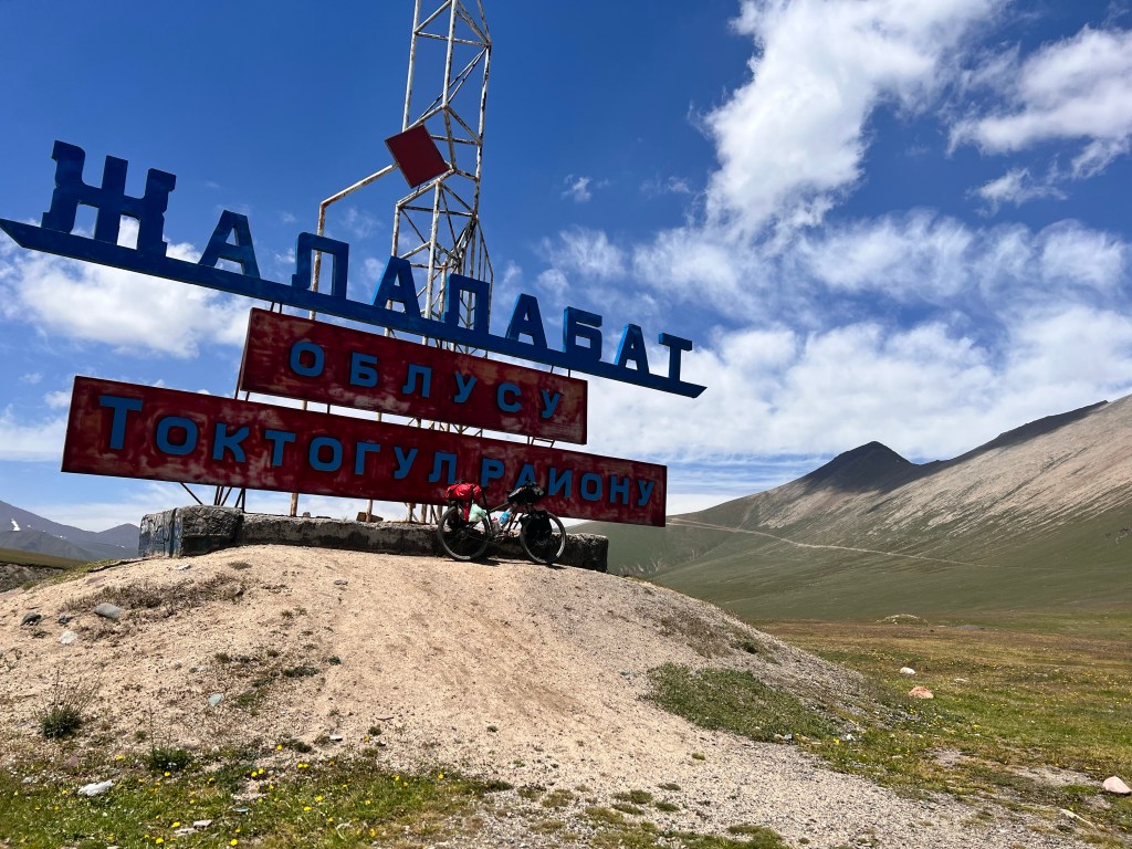 Nach dieser wundervollen Begegnung ging es für mich weiter den Pass hinauf und siehe da die nächsten Radler kommen auf mich zu. Es waren 3 Engländer 2 Mädels und ein Junger Mann mit denen ich mich kurz austauschte und sie mir viel Spaß wünschten bei der 65km langen Abfahrt Richtung Toktugul Stausee die vor mir lag. Ich genoss noch mal die wunderschöne Landschaft am Pass und machte mich fertig für die Abfahrt.