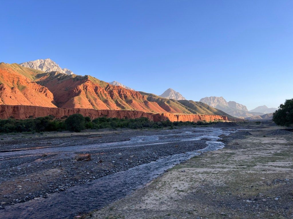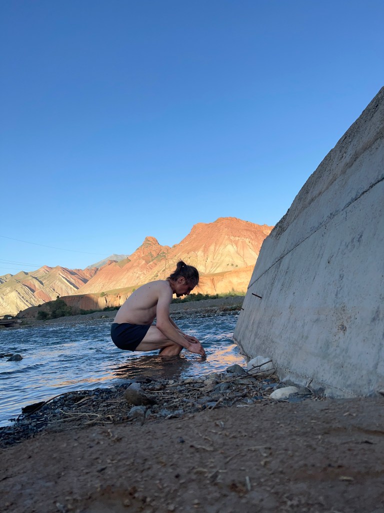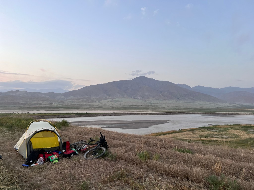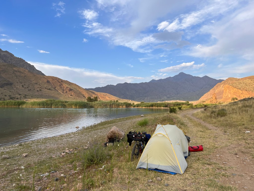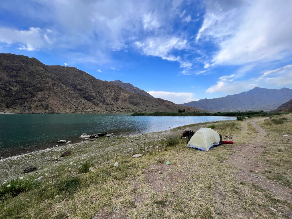 Meine Fahrt ging dann immer entlang des Naryn mit dezent steilen Auf- und Abfahrten bei knackigen Temperaturen über 30 Grad. Die Landschaft mit den schroffen, steilen Felswänden und der türkisblaue Fluss sind eine Augenweide. Allerdings war ich durch meine Magenverstimmung noch gehandicapt und fuhr mit langsamen Tempo, was aber völlig in Ordnung war. Nach gut 50 km sagte ich mir, das ist genug für heute, und fand einen tollen Zeltplatz direkt am Fluss zum Baden. Der Platz war schön abgelegen, mit tollem Ausblick. Ich entspannte dort den ganzen Nachmittag und nutzte die Zeit zur Erholung. Mein Plan war es abends noch ein Lagerfeuer zu machen, doch ein extrem aufkommender Wind nach Sonnenuntergang machte den Plan zunichte, da ich aufpassen musste, dass mir mein Zelt nicht wegflog. Der Wind hielt die ganze Nacht an und wurde stärker, sodass ich höchstens eine Stunde schlief. Nachdem es dann frühs kurz vor 5 Uhr donnerte und blitzte entschied ich mich schnell alles im Dunkeln zusammen zu packen bevor erst alles nass ist und der Wind noch stärker wird. Ich bekam ein paar Tropfen ab und hatte anscheinend eine gute Idee. Ich verließ meinen Zeltplatz im Dunkeln und machte mich weiter auf den Weg nach Osh.