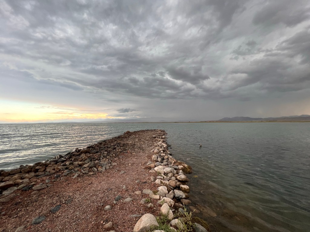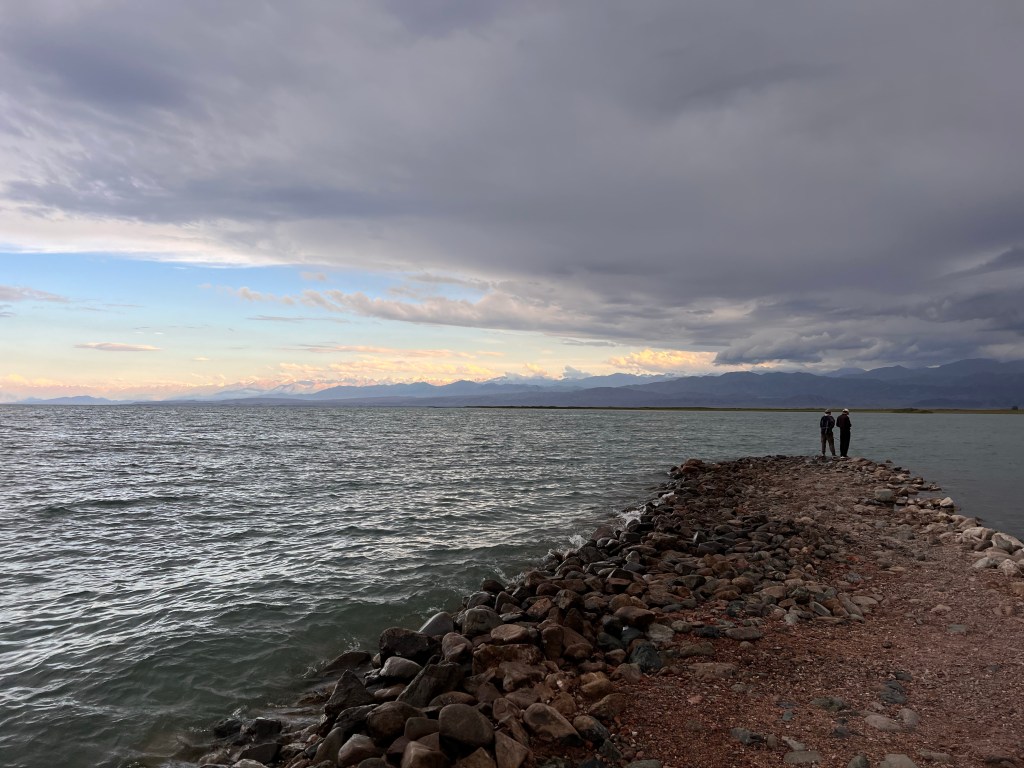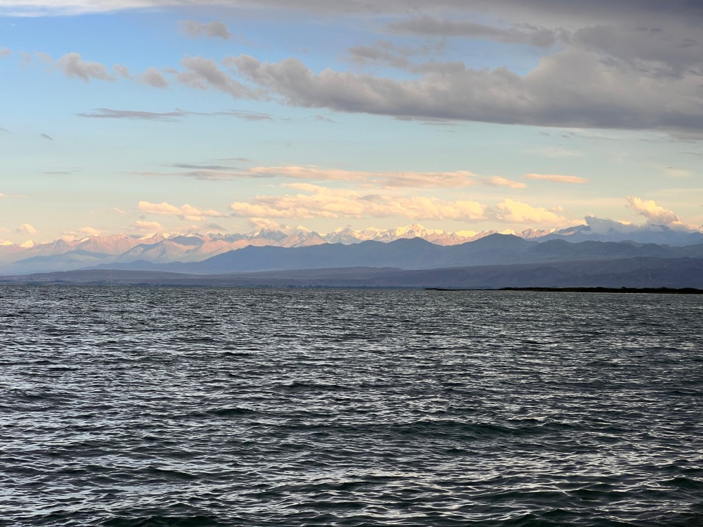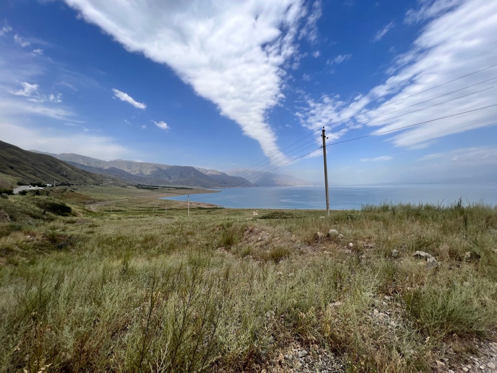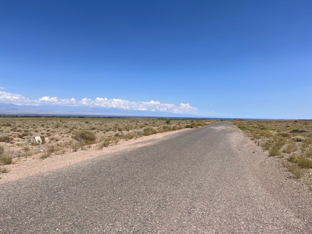 Am nächsten Morgen ging es dann für mich Richtung Yssy Köl See, mit leichtem Rückenwind. So konnte ich die erste Stunde gut Meter machen. Nach einer Stunde zog wieder starker Gegenwind auf, die Straße wurde wieder zur Baustelle und es ging auf Schotter weiter. Später war wenigstens eine Spur geteert und es war nicht mehr so holprig. Angekommen in Balykchy am Yssy Köl See, wurde mir erstmal klar wie groß der See wirklich ist. Ich bezog ein Hostel, kaufte ein und kochte im Zimmer mein Essen und ließ den Tag am See ausklingen.