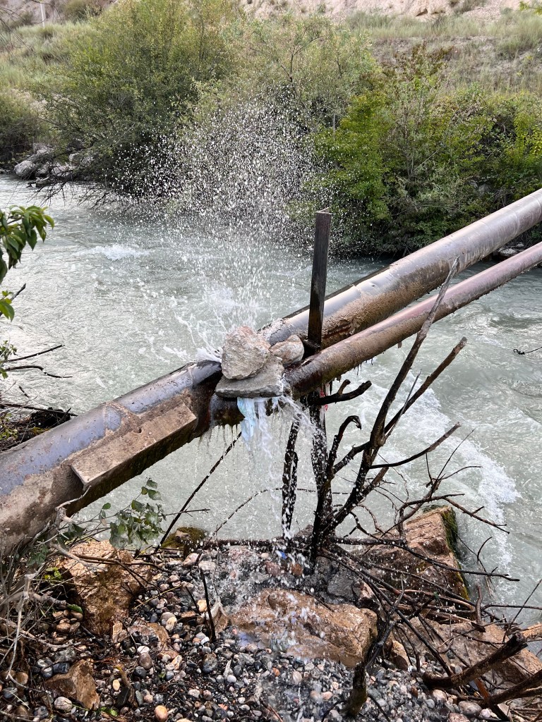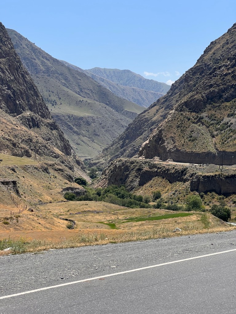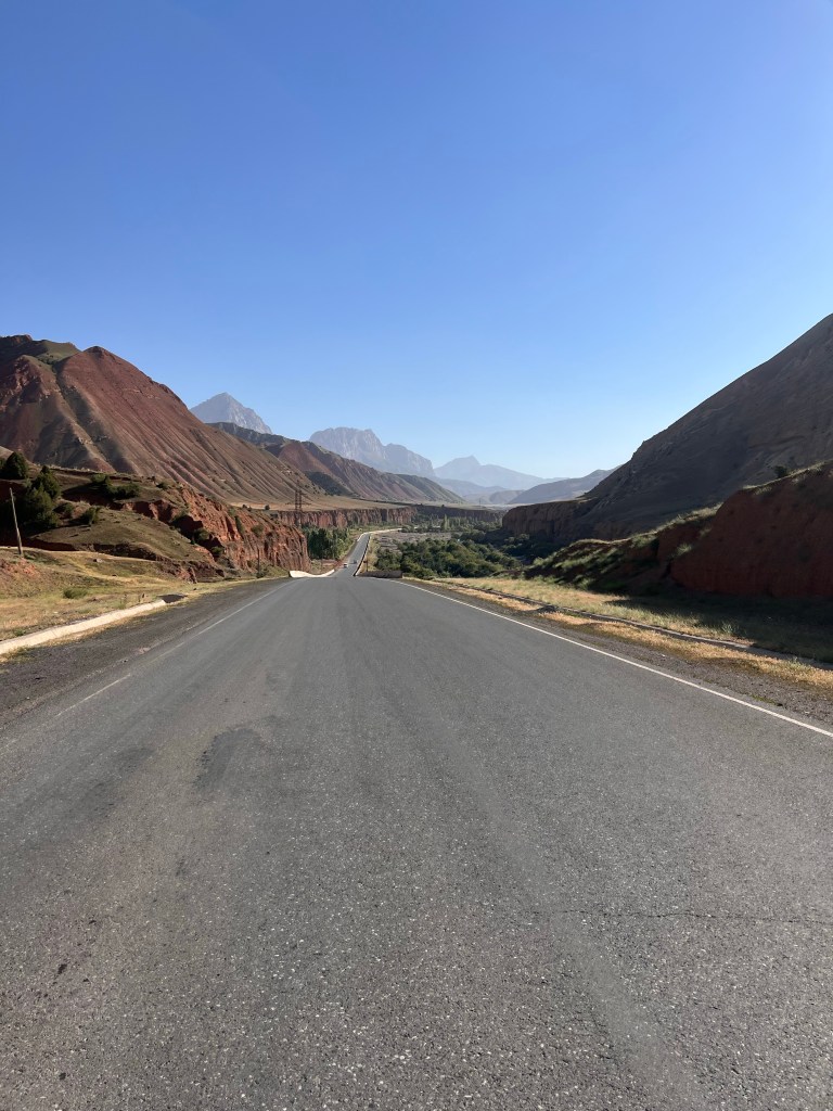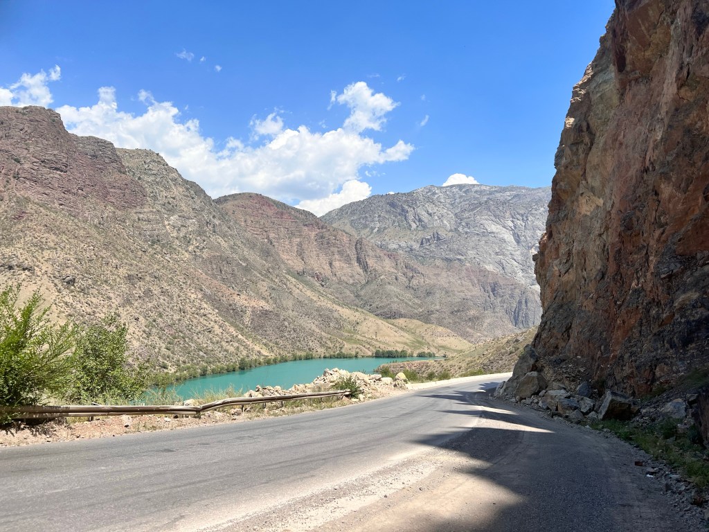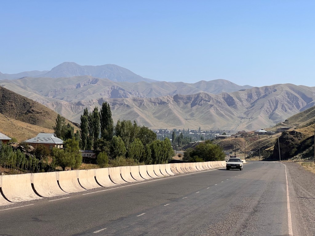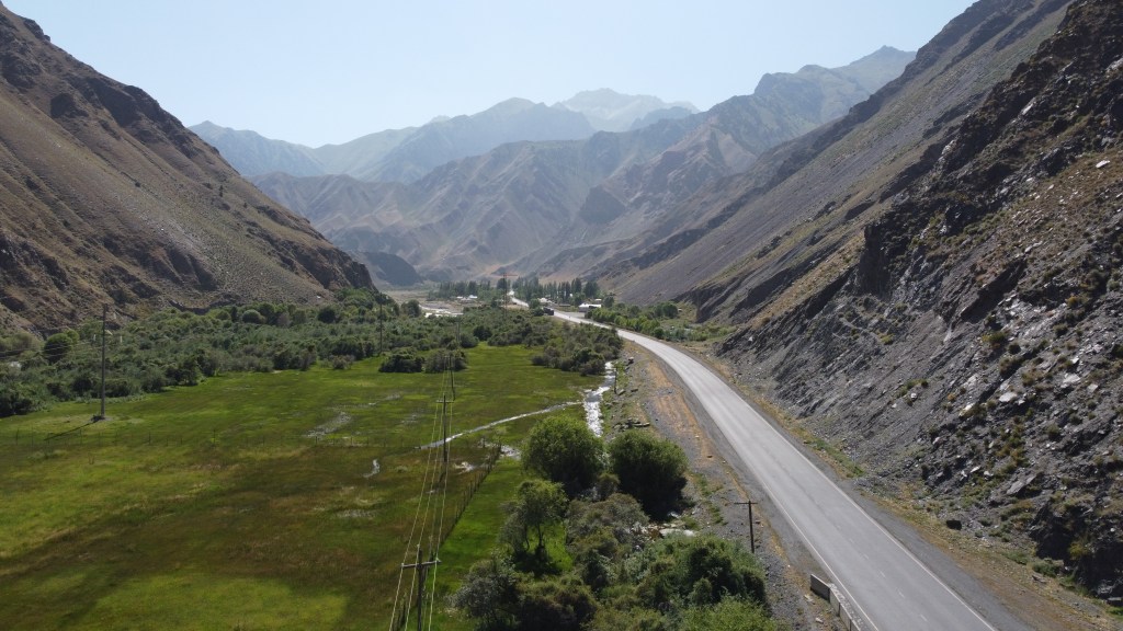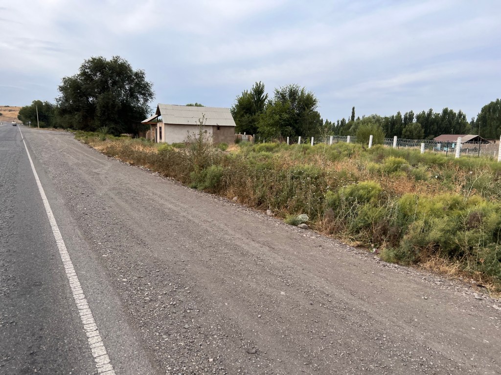 Trotz wenig Schlaf hatte ich deutlich mehr Energie als am Vortag und so hatte ich bis mittags dann schon fast 85 km hinter mich gebracht. Auch dem geschuldet, dass es mal keine hohen Berge zu überwinden galt und die Strecke relativ eben war. Es ging entlang der usbekischen Grenze. Ich hatte überlegt eine Abkürzung durch Usbekistan zu nehmen, da mir das ca. 120 km erspart hätte. Doch nach einiger Recherche, fand ich heraus, dass der Grenzübergang in der Nähe nicht geöffnet ist. Also nix mit Abkürzung.