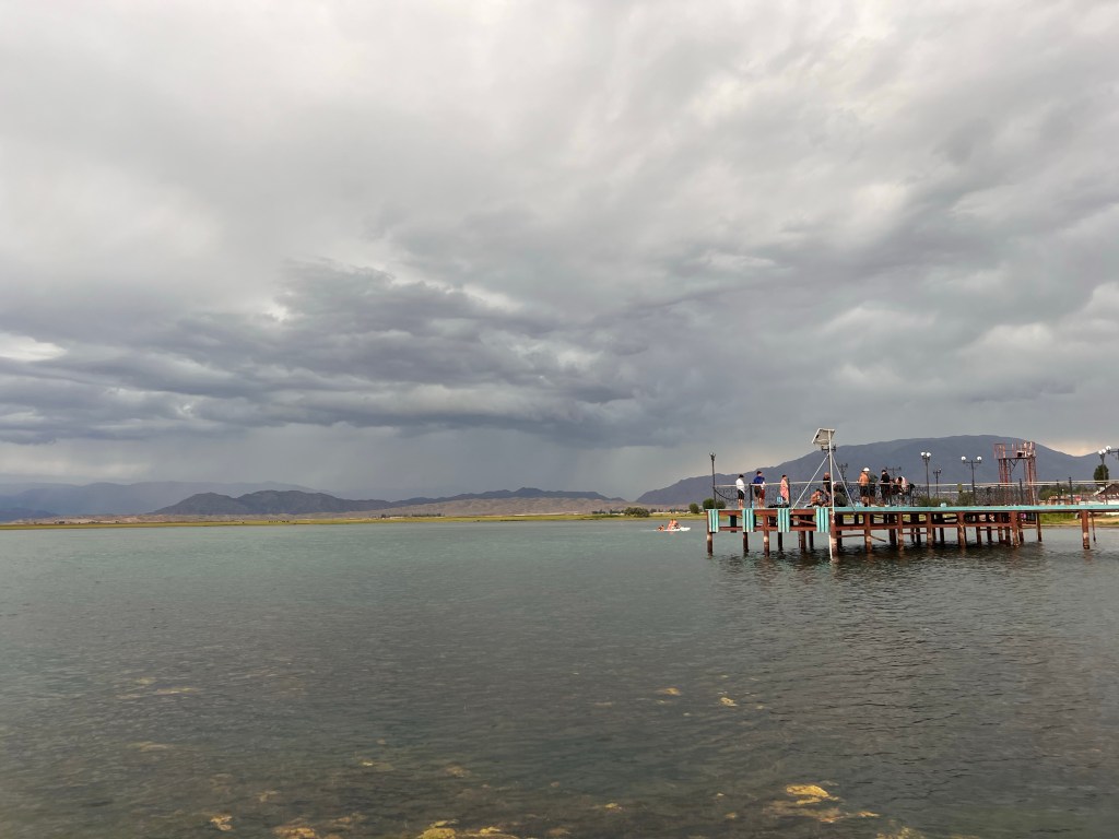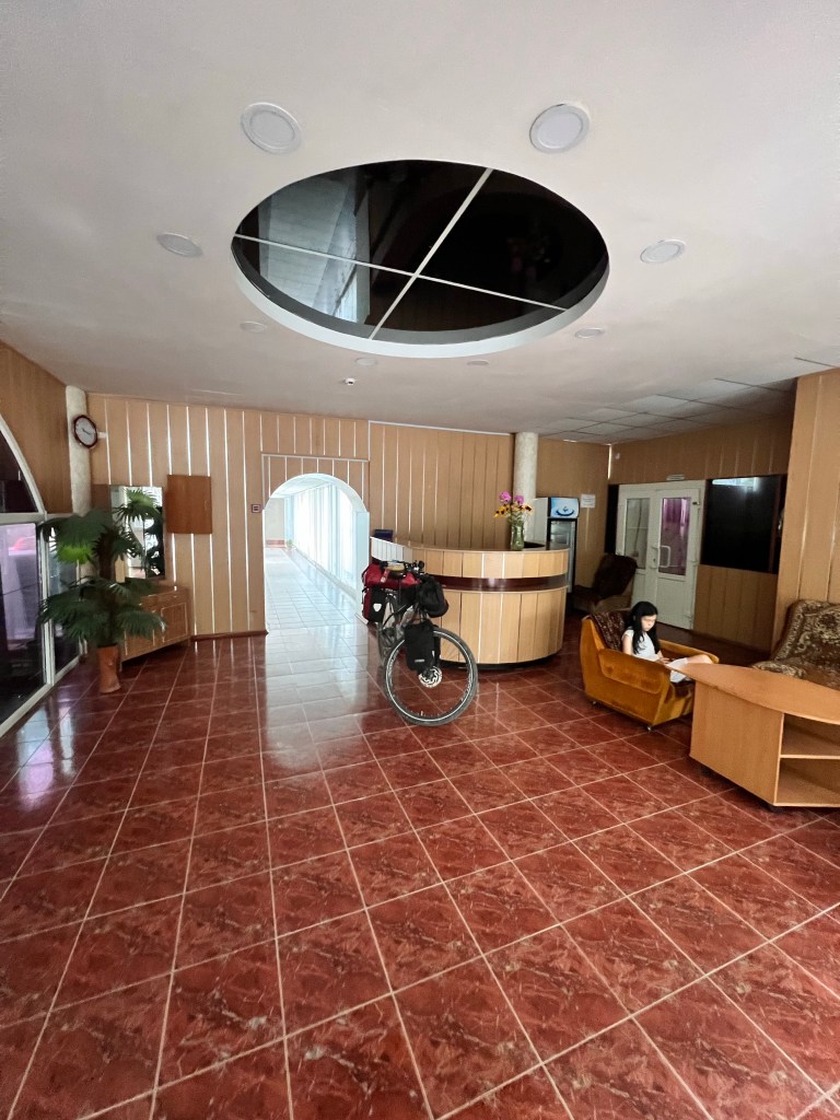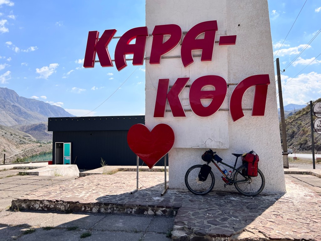 Am nächsten morgen ging es für mich um 6 Uhr wieder raus weil ich der Tageshitze entkommen wollte. Ziemlich geschafft machte ich mich los und kam schleppend voran. Nach einem längeren Frühstück ging es weiter am Toktugul Stausee entlang den nächsten Pass hoch. Oben angekommen freute ich mich auf die tolle Abfahrt. Doch auch hier war mein Freund Gegenwind am Start. Ich musste hier wieder bergab in die Pedale treten um vorwärts zu kommen. Nach einem kleinen stop an einem Rastplatz wurde ich von zwei Männern mit ihren Söhnen zum Essen eingeladen. Dann fuhr ich weiter in die nächste Stadt Karaköl und entschied mich hier einen Pausentag einzulegen. Da ich bin der Hitze und dem Anstrengenden Vortag geschafft war. Ich fand ein sehr rustikales Hotel im Soviet Style wo ich für eine Nacht knapp 5€ bezahlen muss.
