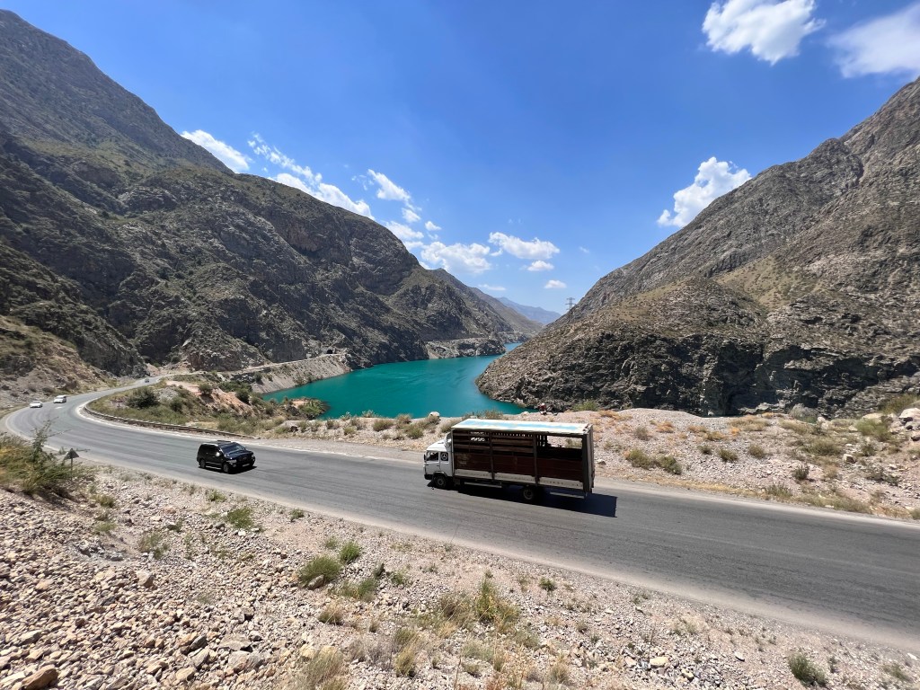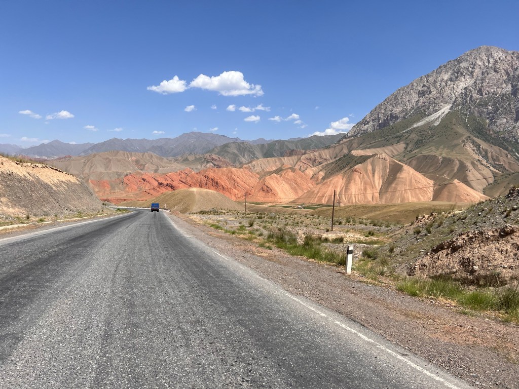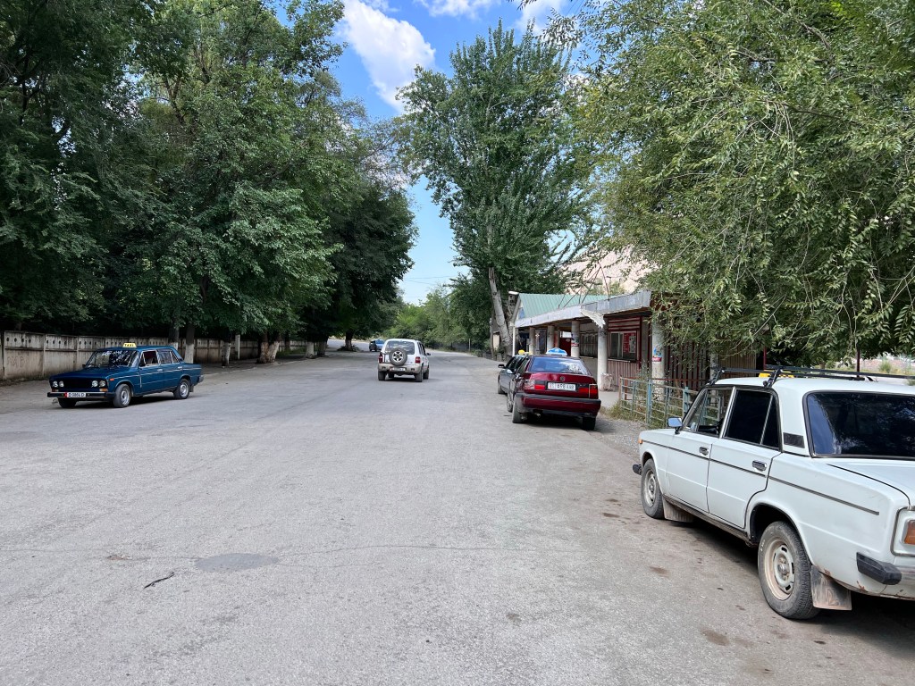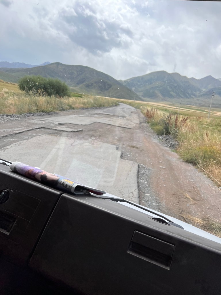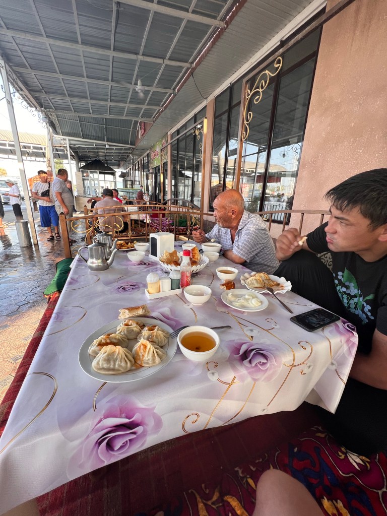 Wir verließen den Basar und schon ging das Rennen-fahren los. Noch in Osh wurden die ersten roten Ampeln überfahren und ich dachte mir so, „ok, was geht hier ab?“. Nachdem wir dann noch angehalten haben und ca. 20 min. warteten, kamen die nächsten 5 Personen hinzu. Die natürlich alle an mir und dem älteren Herrn vorbei unter das Dach krabbelten und dort die ganze Fahrt lagen. Insgesamt 7 Leute haben dort gelegen, unvorstellbar für mich bei dieser Fahrweise, die der Fahrer an den Tag legte. Es ging mit ca. 100 – 120 km/h innerorts, wie außerorts, immer auf der linken Spur manchmal zu dritt oder zu viert, mit Gegenverkehr dahin. Das Radio voll aufgedreht und gefühlt immer Vollgas. In Deutschland hätte der Gute nach einem Kilometer mit Sicherheit schon 3x den Führerschein abgeben müssen. Nach 4 h gab es dann die erste Pause und wir hielten in einem Restaurant. Ich gönnte mir Manty und Tee.