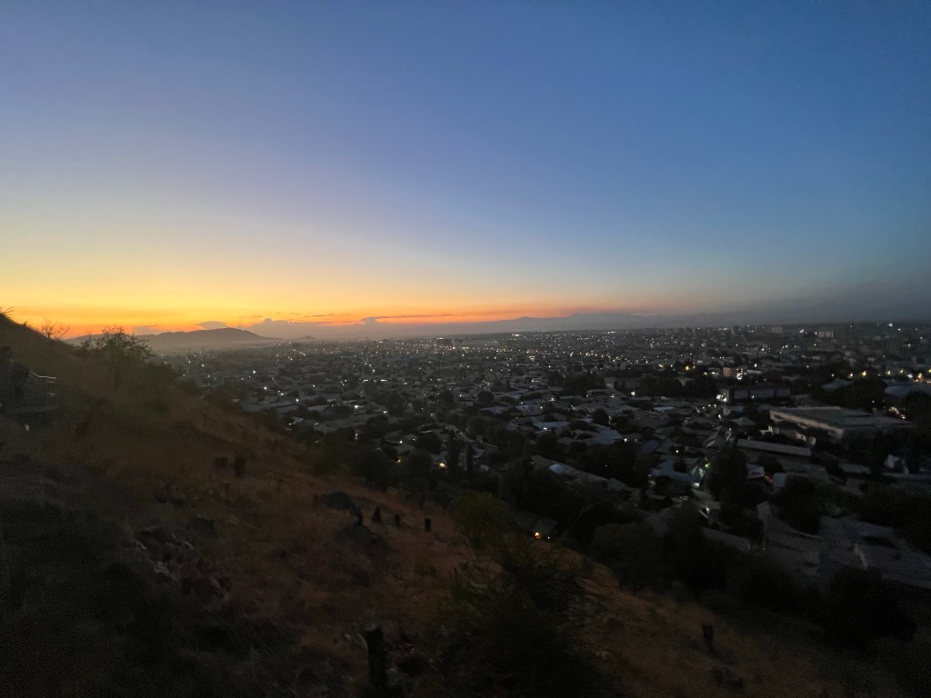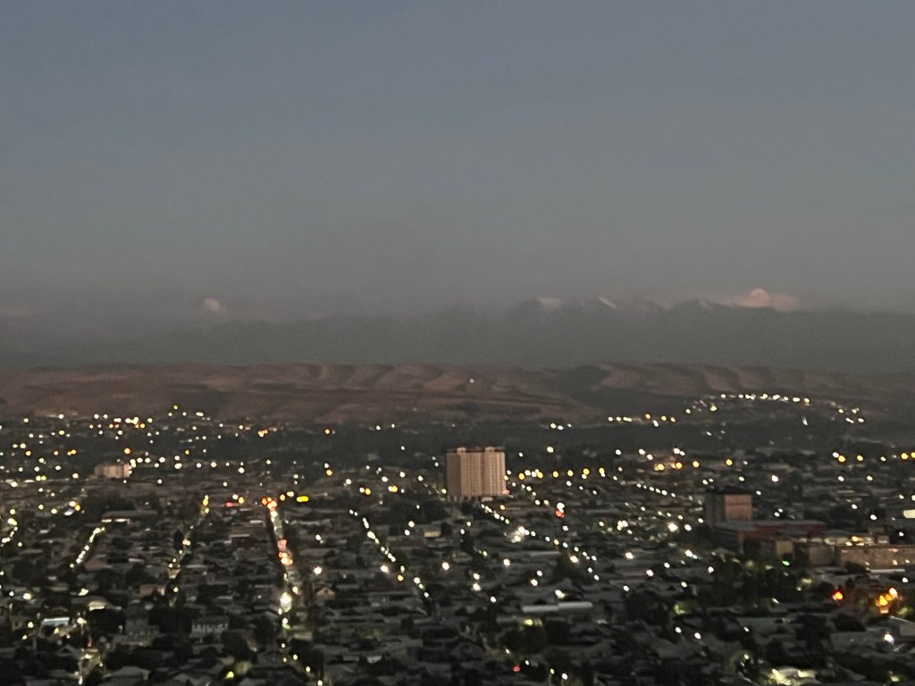Als wir dann den Tunnel, von dem ich am Anfang meiner Beiträge berichtet hatte, passiert hatten, ging es bergab und wieder flotter voran. Hier waren noch andere Sprinter unterwegs, mit denen wir uns dann duellierten. Der Fahrer und ich waren noch die einzigen, die wach waren und ich hatte doch auch schon stark mit Müdigkeit zu kämpfen. War ich doch nun auch schon seit knapp 6 Uhr auf den Beinen und hatte knapp 90 km mit dem Fahrrad absolviert. Gegen halb 5 hatten wir die Berge hinter uns gelassen und rassten nun Richtung Bishkek. In einigen Ortschaften machte der Fahrer das Licht aus vom Bus und versuchte mir zu erklären, dass er dadurch der Geschwindigkeitskontrolle der Polizei entgehen kann. Naja, was soll ich sagen. „Geht’s noch?“, dachte ich mir. Der Sprinter war so laut, dass man ihn schon von Weitem hörte. Wie soll der nicht auffallen, gerade nachts, wo so wenig Verkehr war. Nuja, nachdem er das Spiel 3-4 gemacht hatte, bogen wir plötzlich von der Straße ab und das ganze Obst wurde hier auf einem lokalen Markt abgegeben. Anschließend fuhren wir weiter nach Bishkek, wo wir dann endlich gegen 06:00 Uhr in der Früh ankamen. Ja, sein Versprechen hat er ja gehalten, mit der Uhrzeit. Wir kamen an einem großen Bus-Platz an und der Fahrer hüpfte aus dem Bus und verschwand. Mein Banknachbar und ich waren ein wenig verunsichert, ob es jetzt noch nicht weiter geht? Währenddessen wir so warteten, schlief ich ein und bin gegen 7 Uhr wieder aufgewacht. Ich habe mich dann aus dem Bus geschält, mein Rad zusammen gebaut, meine Taschen aus dem Bus geholt und alles fahrfertig gemacht. Ich hatte mich dann doch leicht verschlafen auf den Weg ins Hostel gemacht, wo ich mich erstmal wusch und ausschlief. Leute, was soll ich sagen, das war die krasseste Busfahrt in meinem Leben und ich lebe noch.