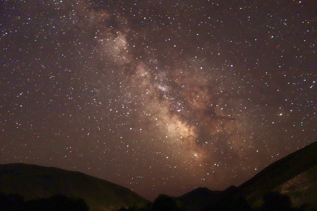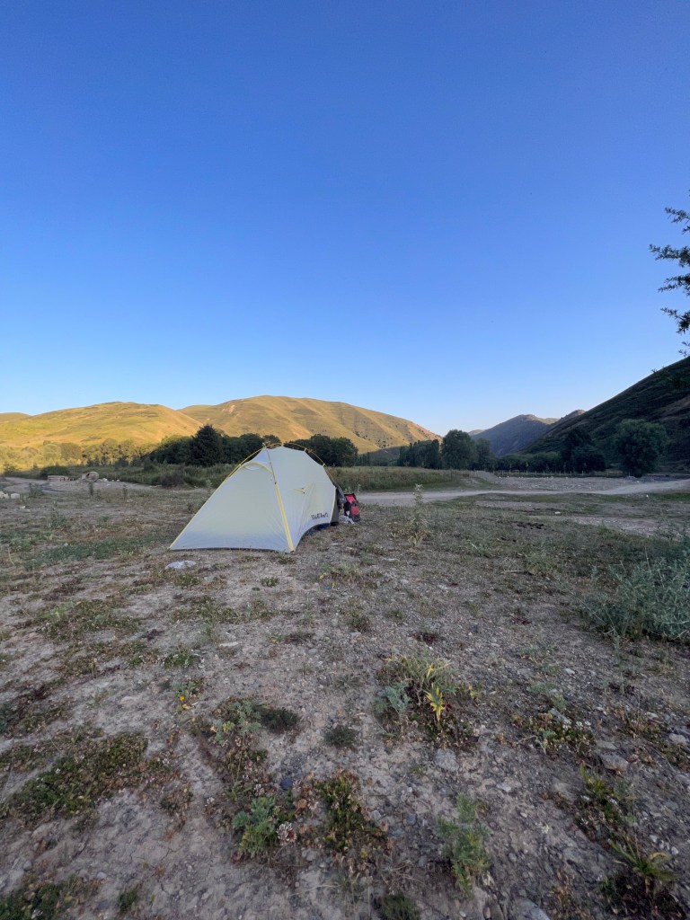 Ich habe es bewusst langsam angehen lassen. Da bis nach Sary Tash und Sary Moghol ca. 4000 hm und knapp um 220 km zu absolvieren waren. Am ersten Fahrtag nach Osh ging es moderat bergauf, ohne krasse Anstiege, dennoch hatte ich nach 60 km über 1150 hm absolviert. Kurz vor dem ersten Pass in einem kleinen Ort, suchte ich mir direkt am Fluss einen Zeltplatz. Ich dachte ‚Schlaf so hoch wie möglich, um dich an die Höhe der kommenden Tage zu gewöhnen‘. Bei meiner Zeltplatzsuche kam ein Einheimischer auf mich zu, der sehr gut Englisch sprach und ich fragte, ob es ok sei an der Stelle zu zelten. Er sagte ‚ja, es sei ok, ich sollte nur in der Nähe der Häuser bleiben‘, klärte das aber nicht weiter auf. ‚Na gut‘, dachte ich mir, wird schon gehen und breitete mich aus, wusch mich im Fluss und lies den Tag ausklingen. Der Zeltplatz war keineswegs abgeschottet und auf dem Weg, der dort vorbei führte, war reger Betrieb. Erst viele Autos und dann später trieben die Bauern ihre Kühe und Ziegen zurück in die Stallungen. Schlafen ging irgendwie nicht so gut, bellten doch den Großteil der Nacht Hunde. Da kamen mir die Situationen aus Georgien 2017 wieder hoch als Patrick und ich im Zelt lagen und plötzlich nachts ein lautes Wolfsheulen einsetzte, was sich sehr, sehr nah anhörte. Damals hatten auch die Hunde ringsrum lange gebellt. Vielleicht deswegen der Rat dicht an den Häusern zu schlafen? Naja, ein wenig unruhig war mir schon zumute. Nachdem ich mich nochmal zum Austreten gegen Mitternacht rausquälte, staunte ich nicht schlecht, als ich über mir die Milchstraße am Sternenhimmel sah. Jetzt dachte ich: alles oder nichts. Stativ raus und Kamera an, das lass ich mir nicht entgehen. Hatte ich damals 2017 die Chance schon einmal vertan als ich mit Magenkrämpfen in Kasachstan im Zelt lag und gefühlt zu schwach war Bilder zu machen. Nachdem ich ein paar Bilder gemacht habe, ging es zurück ins Zelt. Ich lauschte noch aufmerksam dem Gebell der Hunde bis ich dann doch irgendwann einschlief.