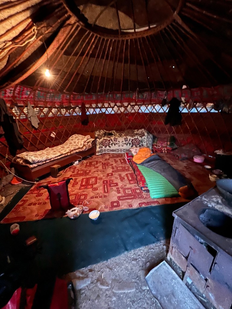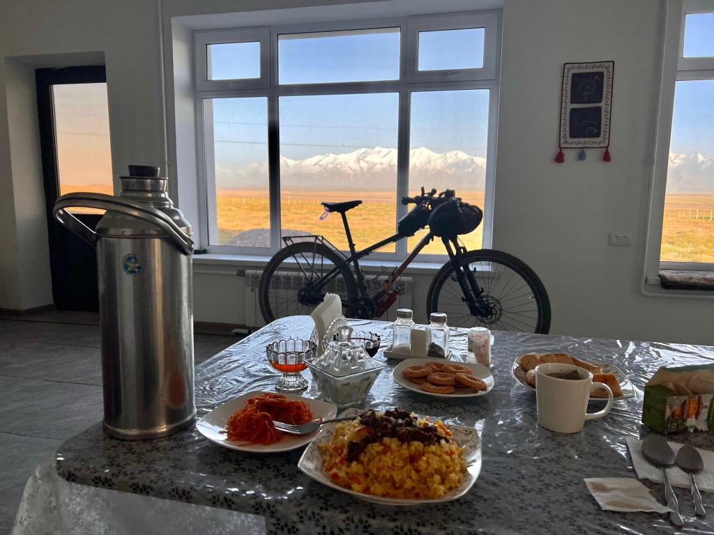 Für mich stand dann Abends ein wenig Erfahrungsaustausch mit den Radfahrer Pärchen und anderen Gästen auf dem Programm. Es war schön mal wieder sich auszutauschen. Und hier zeigt sich wieder unterschiedlich Reisen sein kann. Manche hatten einen exakten Zeitplan wo und wann sie alles besichtigen mit gebuchten Unterkünften und Guides gefühlt ohne Spielraum für Spontanität. Und dann mich der dann eben mal einfach losfährt und guckt bis wohin er kommt und noch nicht exakt weiß wo er am Abend schlafen wird. Doch das soll keine Wertung sein jeder darf hier seinen Weg gehen. Ich werde vermutlich nur einen Teil von Kirgisistan sehen doch das ist vollkommen okay für mich, mein Ziel ist es ja abzuschalten und mehr in meine Mitte zu kommen. Ich kann anderseits auch die Leute verstehen die begrenzte Zeit haben und alles sehen wollen.
