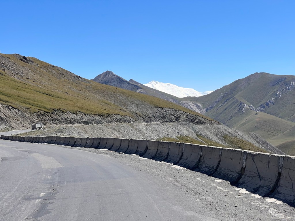 Nach dem Fotoshooting ging es dann erstmal wieder ein paar Kilometer bergab, um dann gleich wieder den nächsten Pass auf 3550 m Höhe zu überwinden. Bei der Abfahrt hat man kurz einen genialen Blick auf die Spitze des 7140 m hohen Pik Lenin. Ein toller und sehr beeindruckender Ausblick, wenn rundherum alles grün ist und dieser Berg mit seinem schneebedeckten Gipfel heraus sticht.