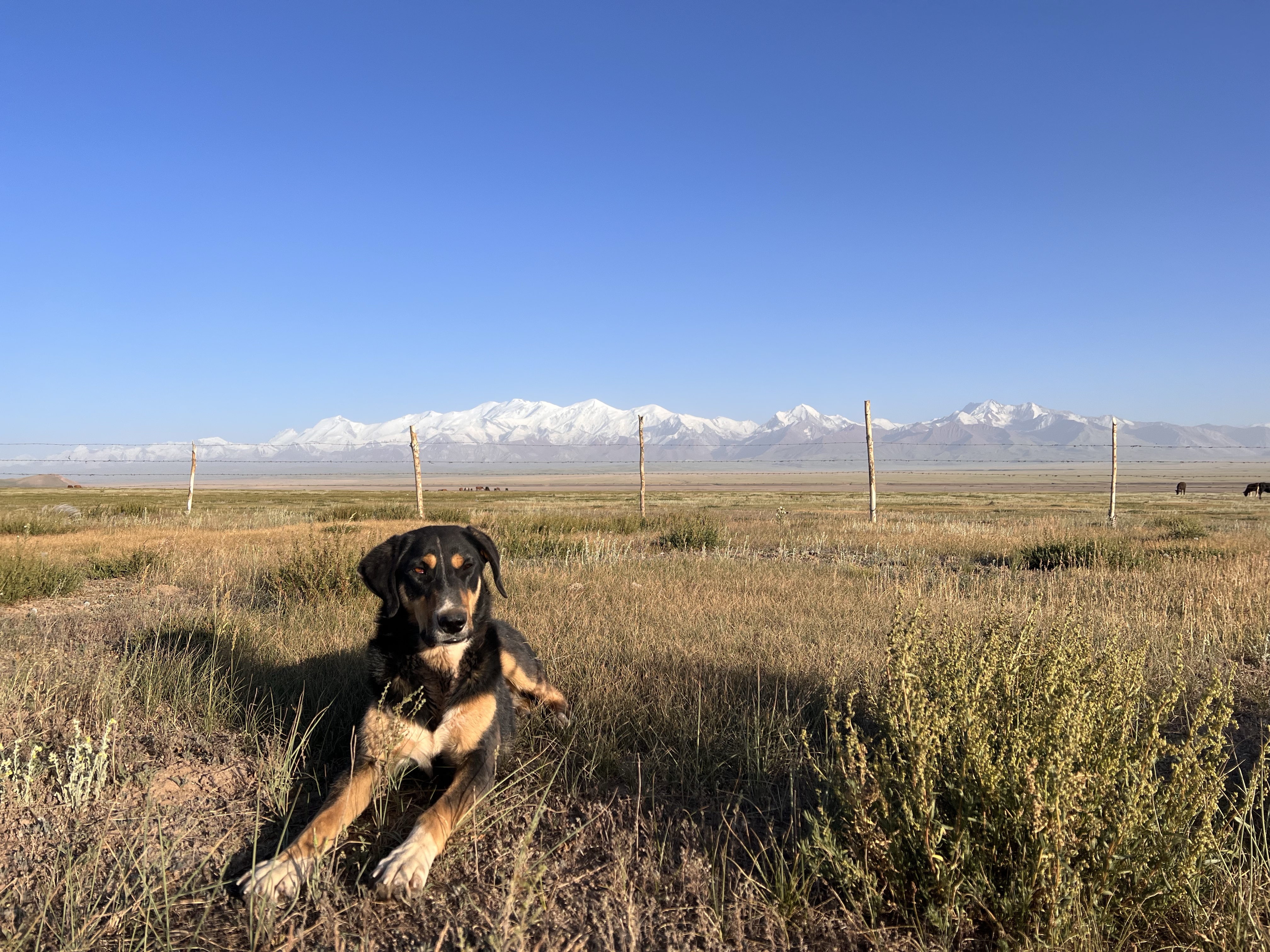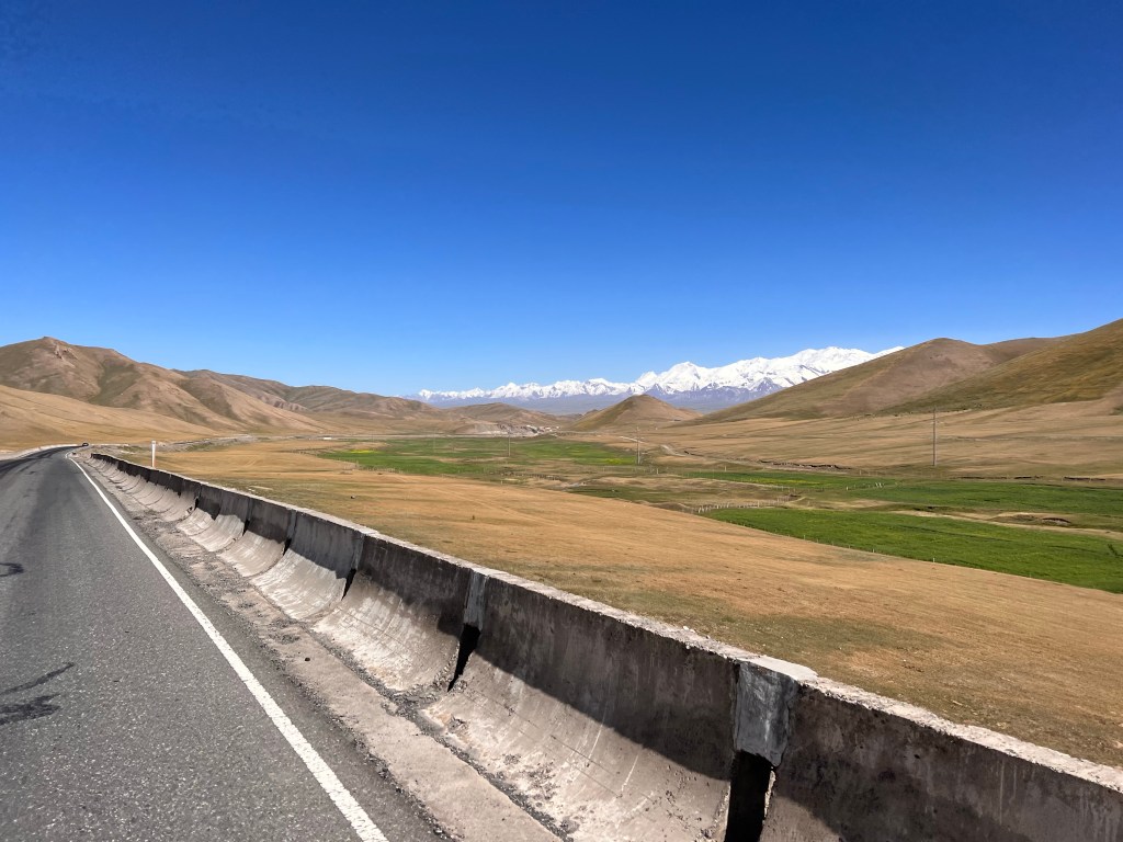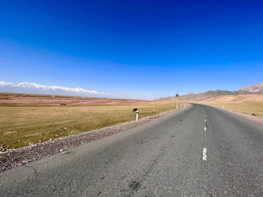 Kaum Verkehr so kann es bleiben Rechts Graslandschaft und links Schneebdeckte 7000erDie zwei Jungs besuchten mich als ich kurz Pause machten mit einem lockeren hello Mr.Warum auch nicht kleines Nickerchen auf der StraßePik Lenin immer in Sichtweite Flach und gerade ging es dahin
