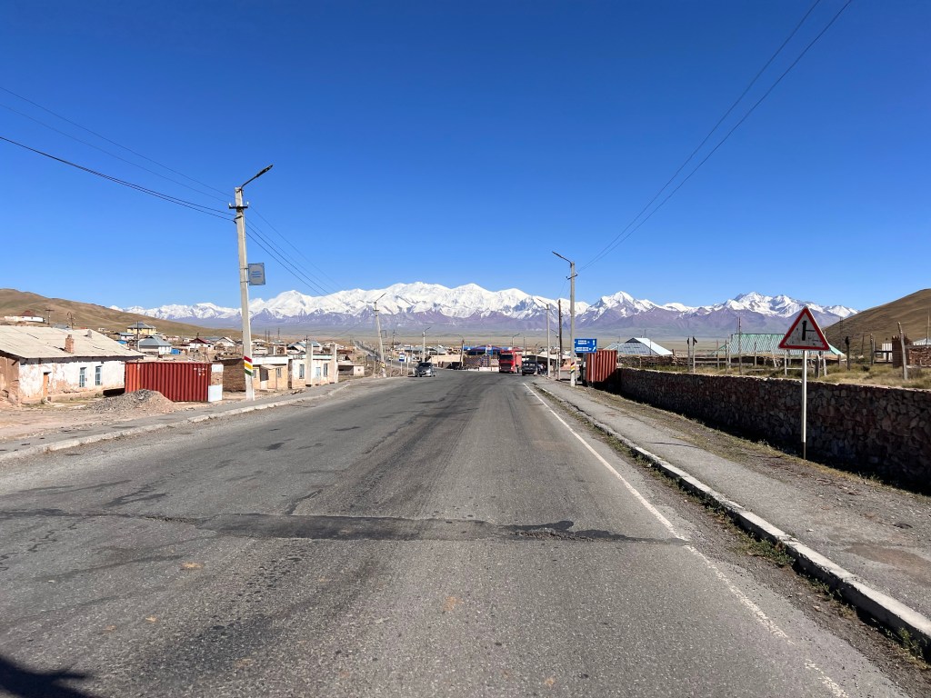 Nach dem Überwinden des nächsten Passes, ging es dann nur noch bergab. Die Einfahrt nach Sary Tash war sehr beeindruckend durch die Schnee-bedeckten Berge der Alai Kette im Hintergrund, die bis zu 6500 m hoch sind. Der Ort liegt auf ca. 3200 m und ist ein wichtiger Verkehrsknotenpunkt. Zum einen treffen sich hier der Pamir Highway von Tadschikistan Kommend und die Straße zum Irkeshtam Pass zum Grenzübergang nach China.