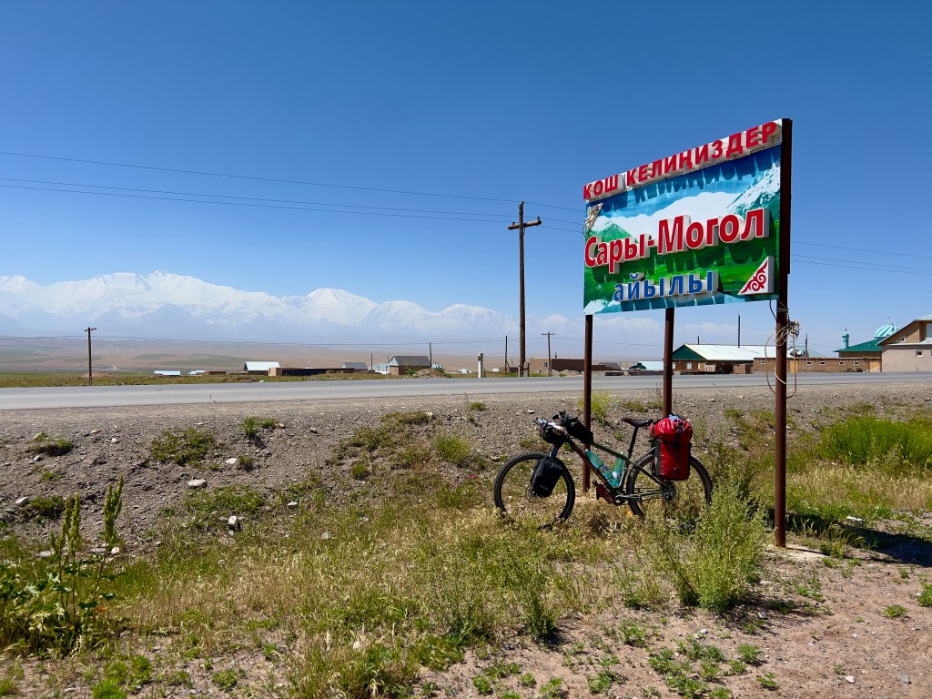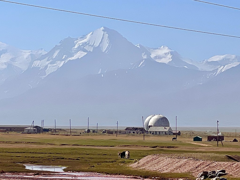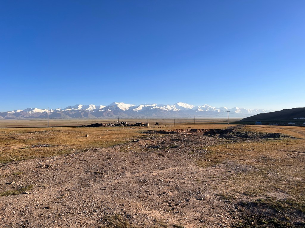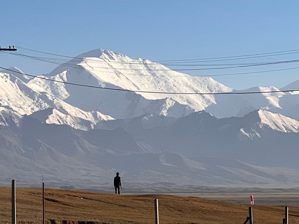 Es sind rund 40km bis nach Sary Moghol die ich sehr entspannt angegangen bin. Ich genoß den permanenten Blick auf die Alai Bergekette und Pik Lenin. Es ist wirklich atemberaubend diesen einmaligen Blick über diese weite Hochebene auf die schneebedeckten Gipfeln zu haben. Die Straße verläuft relativ eben auf der Hochebene entlang und windet sich an kleineren Bergen entlang immer den Blick links auf die schneebedeckten Berge. Ich denke die Bilder sprechen für sich doch merke ich selbst beim betrachten der Bilder in echt haben diese Riesen Berge die ja im Bereich der 7000m liegen eine viel imposantere Wirkung.