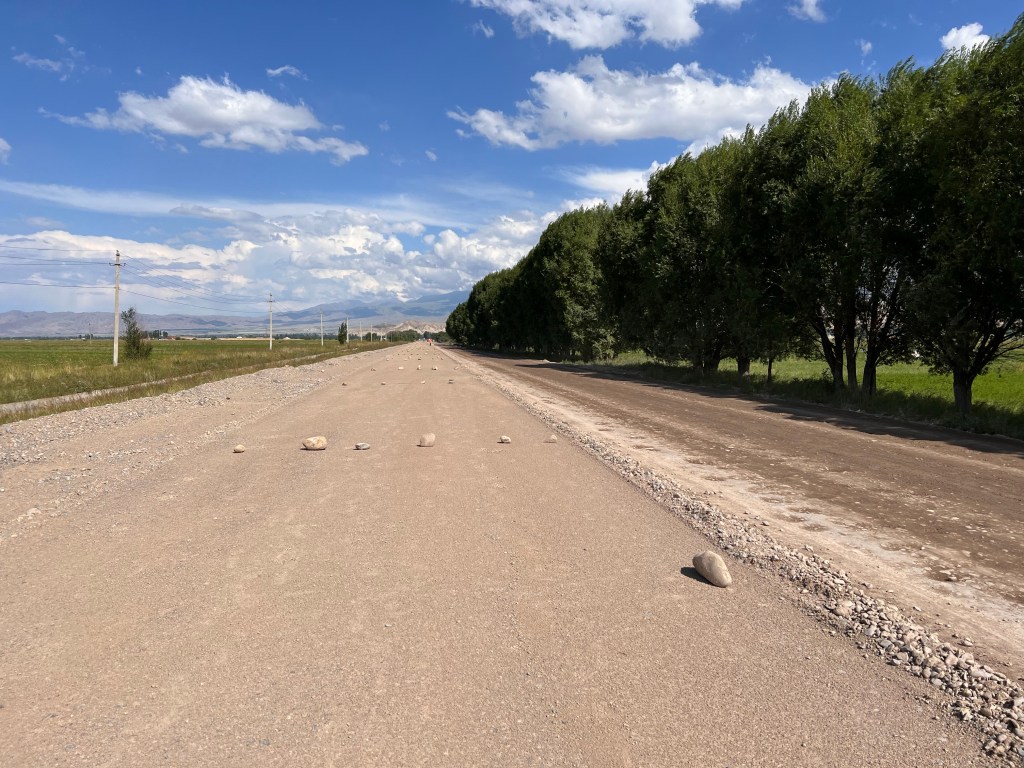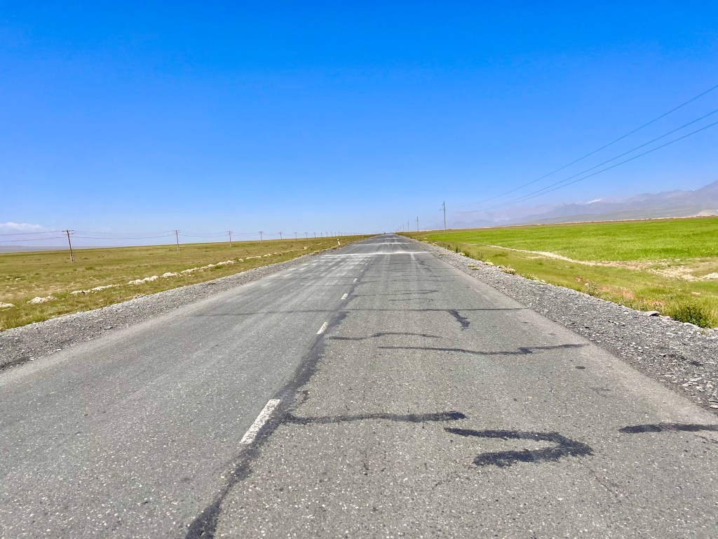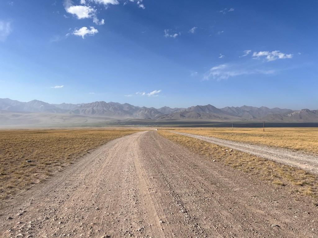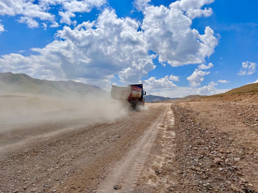 Weiter sollte es dann Richtung Song Kul gehen und ich hatte mir eine Route ausgesucht, die einen Teil über eine Bundesstraße ging. Ich hoffte dadurch gut voran zu kommen und dann über einen 3400 m Pass zum See zu kommen. Die Bundesstraße war gefühlt nicht mehr vorhanden und bestand nur aus Schotter und Staub. Anscheinend wird sie gerade erneuert. Nagut, dachte ich mir, fahren wir mal. Das Ganze wurde nicht besser und nach 2 h zog extremer Gegenwind – mal wieder! – auf und ich fuhr mit ca. 7-9 km/h die Holperpiste entlang. Immer wieder kamen LKWs, die unglaublich viel Staub aufwirbelten, sodass ich anhalten musste. Immer noch extrem geschafft vom Tag zuvor, traf ich nach langem hin und her die Entscheidung umzudrehen und den Song Kul auszulassen und direkt zum Yssy Köl zu fahren.