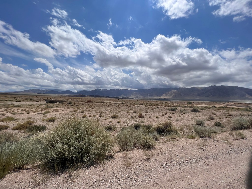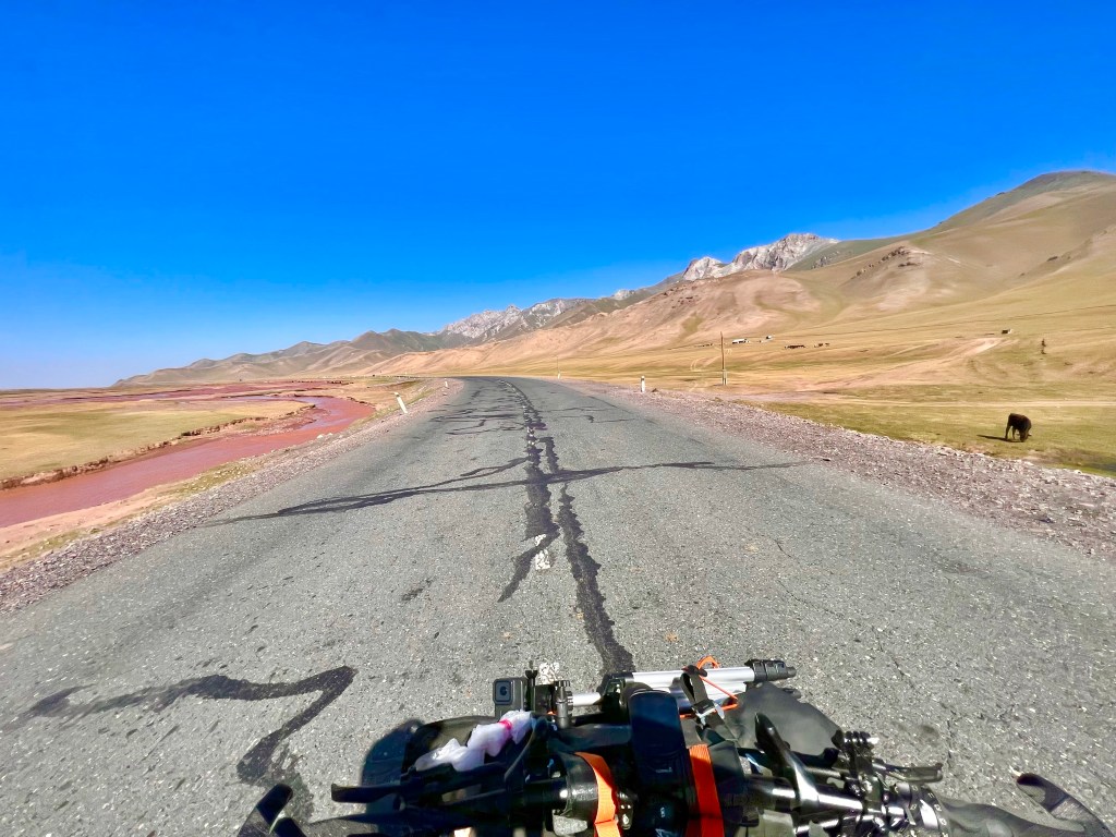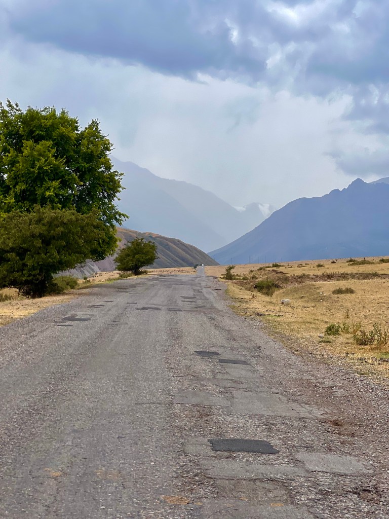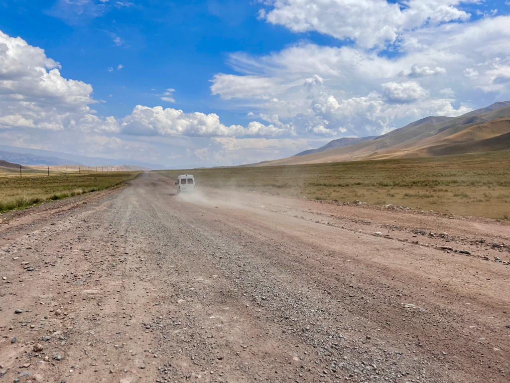 Weiter sollte es dann Richtung Song Kul gehen und ich hatte mir eine Route ausgesucht, die einen Teil über eine Bundesstraße ging. Ich hoffte dadurch gut voran zu kommen und dann über einen 3400 m Pass zum See zu kommen. Die Bundesstraße war gefühlt nicht mehr vorhanden und bestand nur aus Schotter und Staub. Anscheinend wird sie gerade erneuert. Nagut, dachte ich mir, fahren wir mal. Das Ganze wurde nicht besser und nach 2 h zog extremer Gegenwind – mal wieder! – auf und ich fuhr mit ca. 7-9 km/h die Holperpiste entlang. Immer wieder kamen LKWs, die unglaublich viel Staub aufwirbelten, sodass ich anhalten musste. Immer noch extrem geschafft vom Tag zuvor, traf ich nach langem hin und her die Entscheidung umzudrehen und den Song Kul auszulassen und direkt zum Yssy Köl zu fahren.