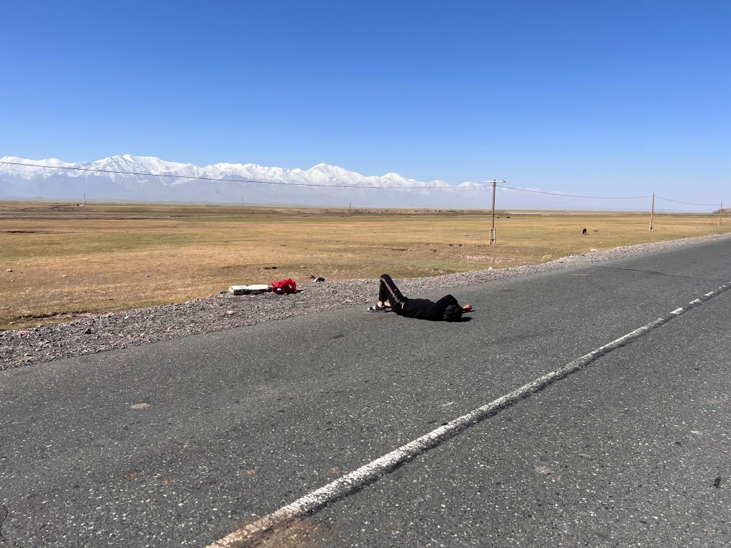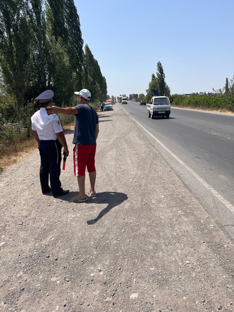 Hier versuchte gerade der Polizist einen Lkw Fahrer zu überzeugen mich mitzunehmen Absolut TÜV konform Mein Ticket nach Bishkek Lächeln trotz 40 Grad Hitze am Straßenrand