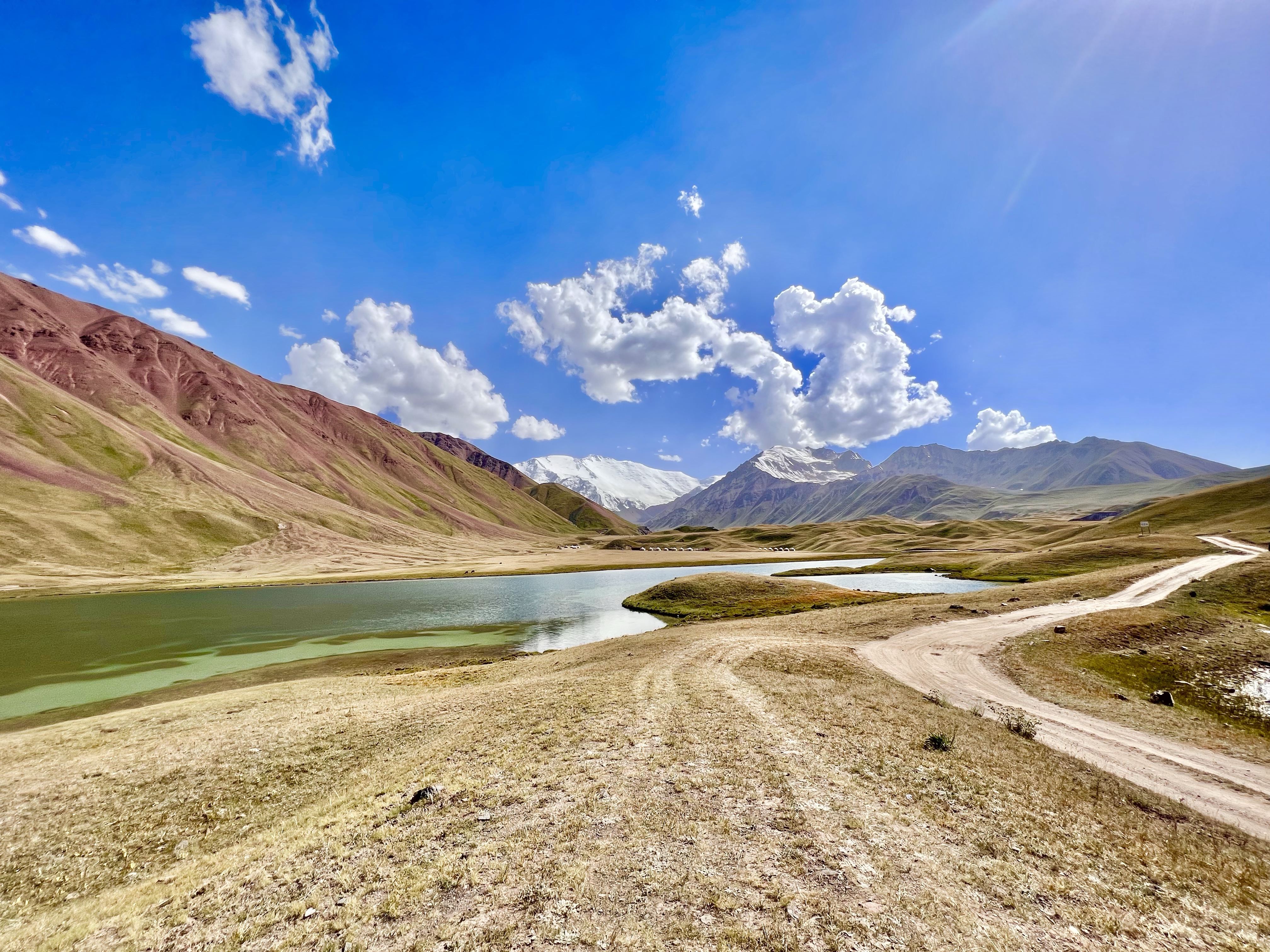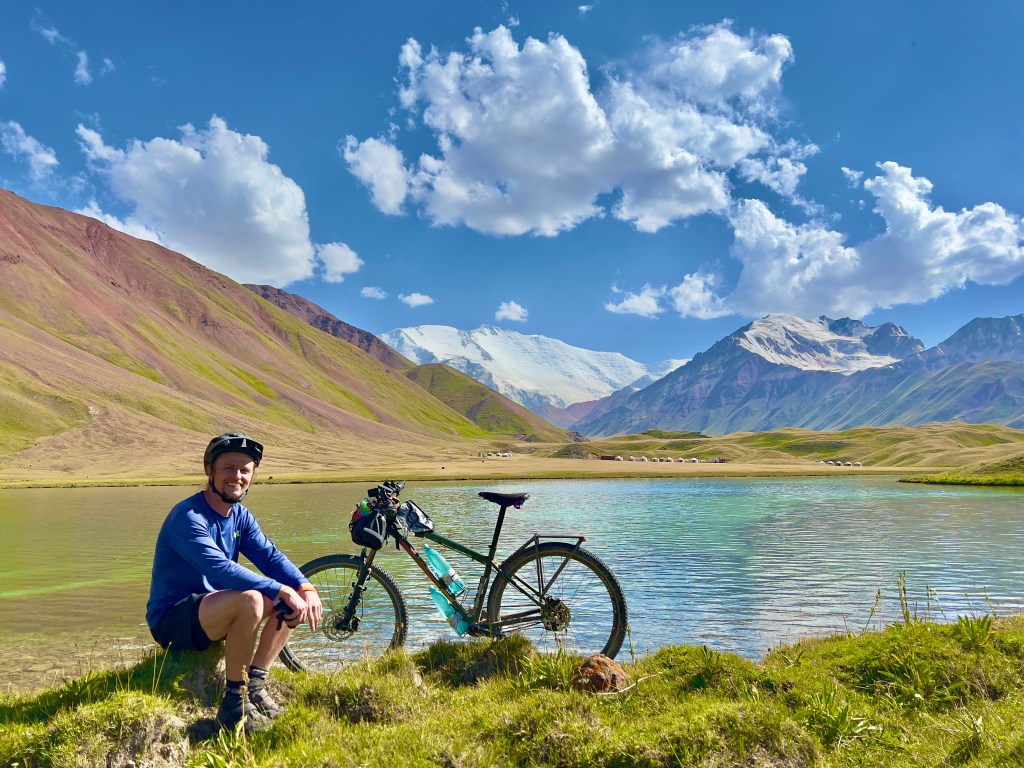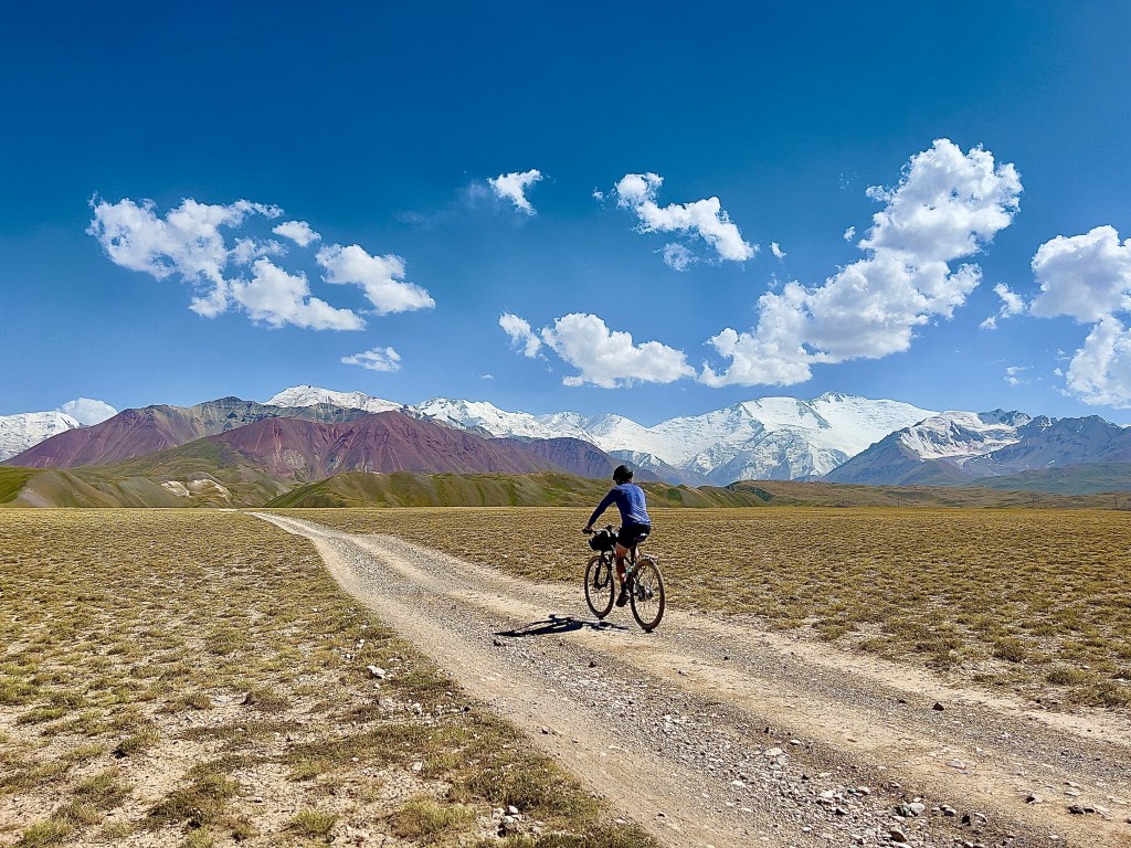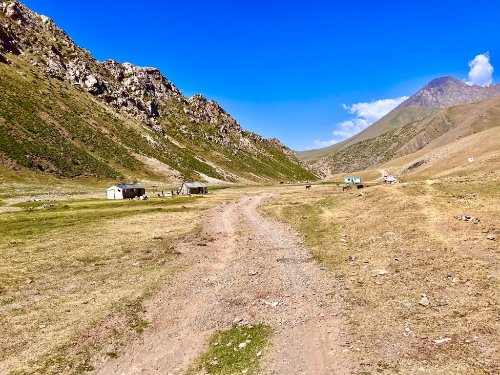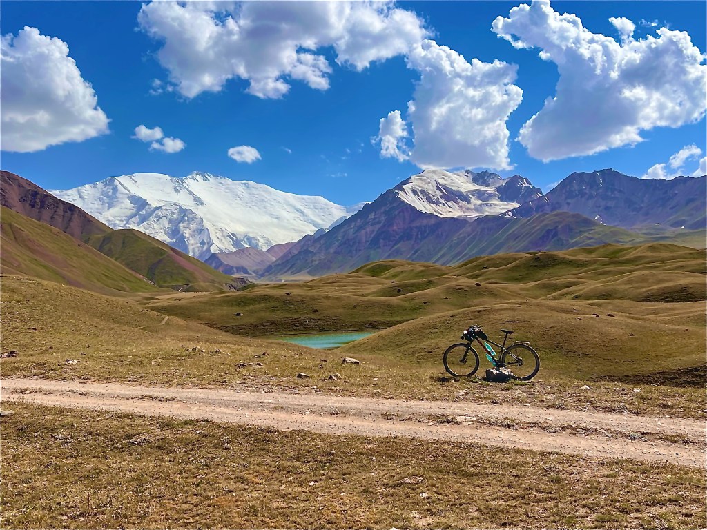 So nun aber weiter im Text. Angekommen in Sary Moghol kam ich im Lenin Peak Guesthouse unter welches mit Shamurat von Pamir Extreme empfohlen hat. Hier schien ich das erste mal wieder auf Reisende und Reiseradler zu treffen. Doch erstmal bezog ich mein Zimmer und packte meine Taschen vom Rad. Ich nahm alle nötigen Sachen mit und machte mich auf den Weg Richtung Pik Lenin und Tulpar Lake in der nähe des Base Camp. Vom Ort sah man den Schotterstraße die über die sanfte Graslandschaft dort hin führte. Vom ersten schauen sah es gefühlt nach 5km oder maximal 10km aus. Aber bei diesen weiten hier mussten es natürlich mehr sein. In der tat es waren knapp 25km und knapp 550hm bis hin. Ich also losgeradelt und dachte dabei noch an so schöne Schotterwege bei uns im Thüringer Wald. Doch was mich hier erwarte war wirklich nicht schön und hat mir einiges abgefordert ehrlich gesagt. Es waren verschiedene Spuren und Wege überzogen von großen Schottersteinen und durch die vielen Autos eingefahrenen Waschbrett Rillen. Ich war ja froh mich entschieden zu haben eine Federgabel zu verbauen doch war das geschuckel alles andere als angenehm für mich. Und diese 25km zogen sich über diese weite Landschaft ewig hin. Ich dachte teilweise das ich gefühlt nicht voran gekommen bin. Der positive Aspekt dabei war immer einen grandiosen Blick direkt auf den Pik Lenin zu haben. Beim rauffahren kam mir noch ein Radler Pärchen entgegen mit denen ich mich kurz austauschte. Enrice aus Spanien und Merede aus Norwegen bereisen Kirgisistan zum zweiten mal. Wir tauschten uns ein wenig aus und da wir im gleichen Guesthouse sind verabredeten wir uns zum Abendessen. Dann ging meine wilde Schotterfahrt weiter. Zum Ende wurde der Weg ein wenig besser und steiler. Ging es doch am Ende jetzt wieder bis auf 3500m hoch. Die Höhe machte mir zu schaffen und ich war echt platt als ich am Tulpar Lake angekommen bin.