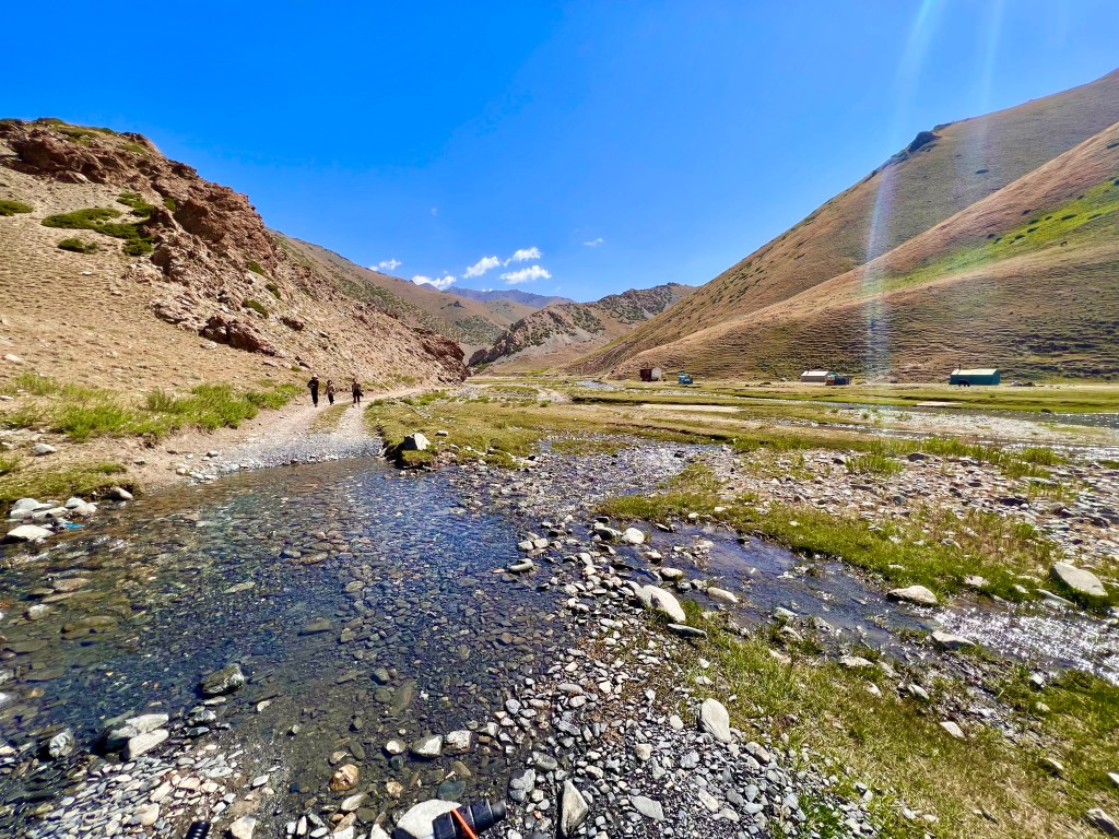 Nach dem ich noch einen Pausentag in Sary Moghol eingelegt habe machte ich mich auf den Weg zurück Richtung Osh von wo ich gekommen bin. Da ich nicht komplett den gleichen Weg fahren wollte fuhr einen ich einen Abschnitt des Silk Road Mountain Races aus diesem Jahr der mir sogar noch ein paar Kilometer sparen sollte, dennoch keine Zeit. Das wusste ich aber vorher noch nicht. Ich fuhr von Sary Moghol ca. 8km Straße bevor es dann links auf Schotterwegen durch ein kleines Dorf durch ein Tal Richtung Osh ging. Kurz nach dem Ort kam schon der erste Kirgise auf einem Pferd mir entgegen und platzierte sich vor mir als wollte er mich nicht passieren lassen. Nach kurzem smalltalk wünschte er mir alles gute und ich konnte weiter auf dem Schotterweg dahin poltern. Da kam auch schon die erste Wasserdurchfahrt von der noch ca. 10 folgen sollten. Der Weg führte immer entlang des Tals einen Fluss hinauf vorbei an vielen Jurten und Bauern die hier ihre Tiere auf den Weiden haben. Die Menschen haben hier so wie ich es wahrgenommen habe keinen Strom höchstens ein Solar Panel an der Jurte und kein Handy Empfang. Interessant was diesen Menschen dadurch so alles verbogen bleibt. Für viele ist ja die täglicher Medialer Bericht Erstattung und Angstmacherei schon wie eine Droge womit Sie ihren von Kindesbeinen an gelernten Stress und Angst Pegel füttern und in Schockstarre gehalten werden. Weil die Welt da draußen ja so schrecklich ist. Deswegen mein Appell, geht raus in Welt und macht euch selbst ein Bild und ihr werdet überrascht sein wie es wirklich aussieht.