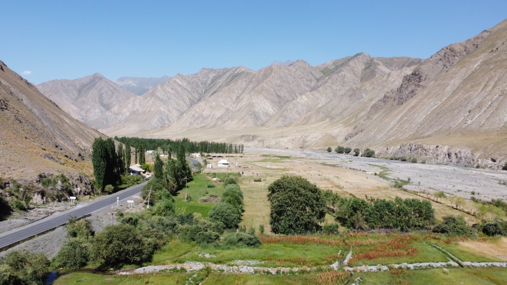 Pamir Extreme Mountain Lodge Blick auf Sary Tash Links sind es 71km bis nach China und rechts geht es Richtung Tadschikistan und Pik Lenin