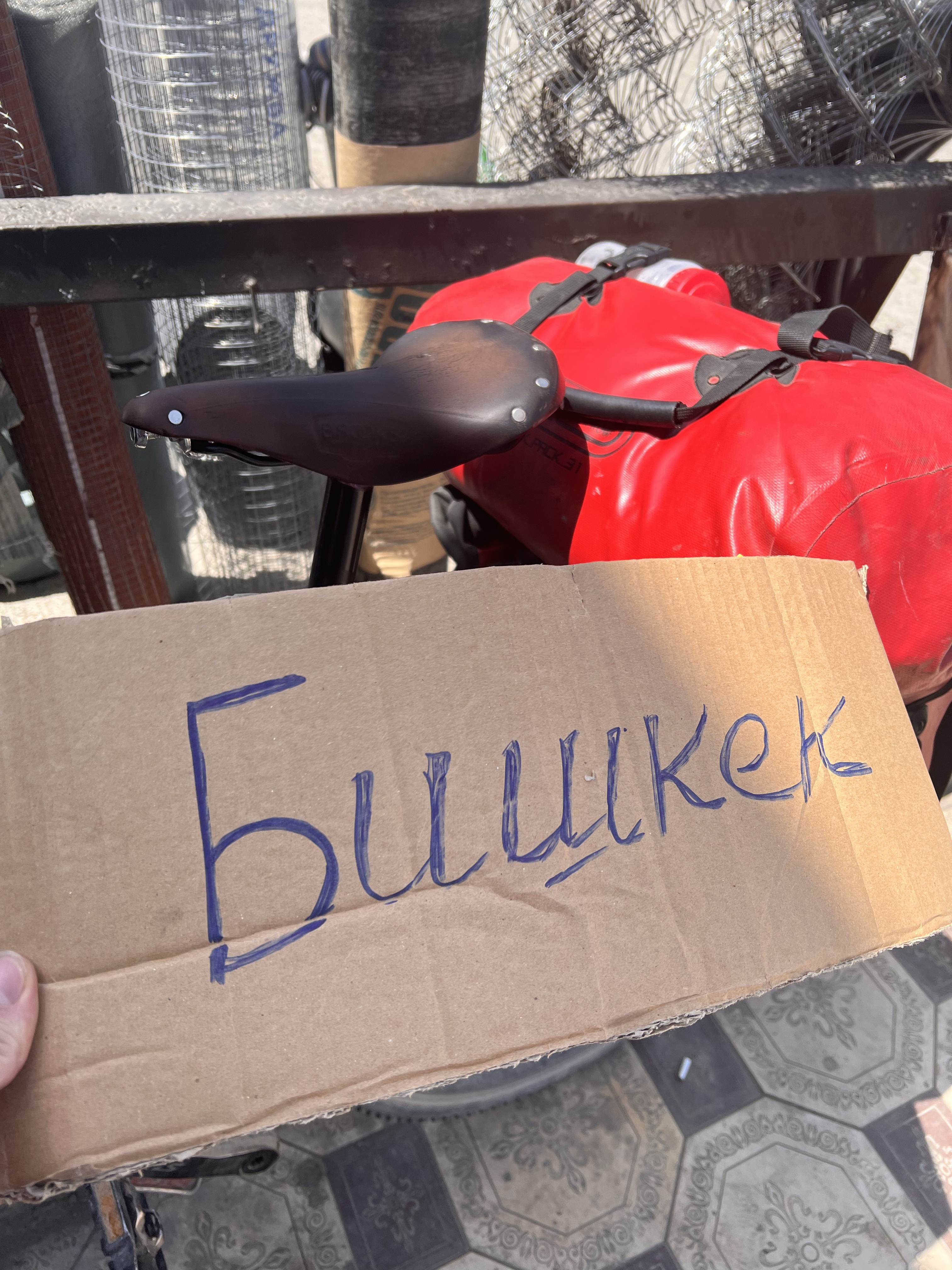Als ich mich mit meinem doch sehr breiten Radkarton auf meinem Wagen nach draußen kämpfte (die Durchgangstüren am Flughafen waren doch deutlich schmaler als in Frankfurt), wurde ich von Taxifahrern belagert, die mich in die Hauptstadt transportieren wollten. Die Jungs waren sehr hartnäckig, doch ich konnte sie abschütteln und mein Rad auf einem kleinen Platz hinter einer Hecke in aller Ruhe zusammenbauen. Beim auspacken konnte ich keine Beschädigungen feststellen und baute alles recht schnell zusammen. Dann die Taschen noch mit allem nötigen bepacken und ab geht es Richtung Bishkek.