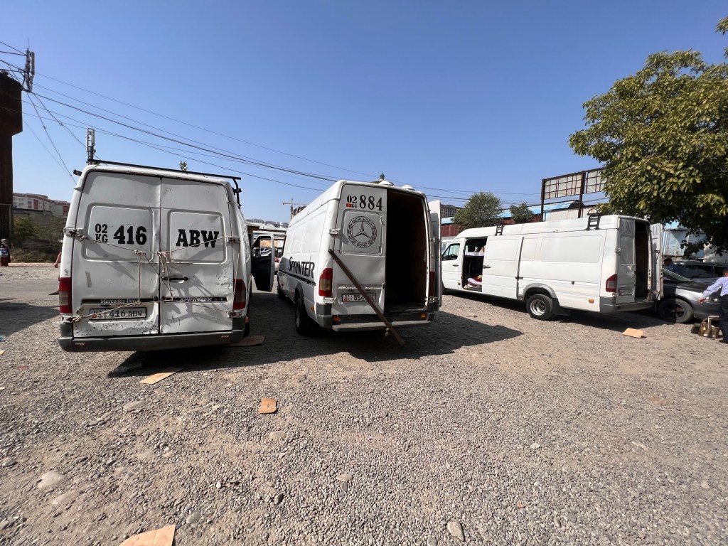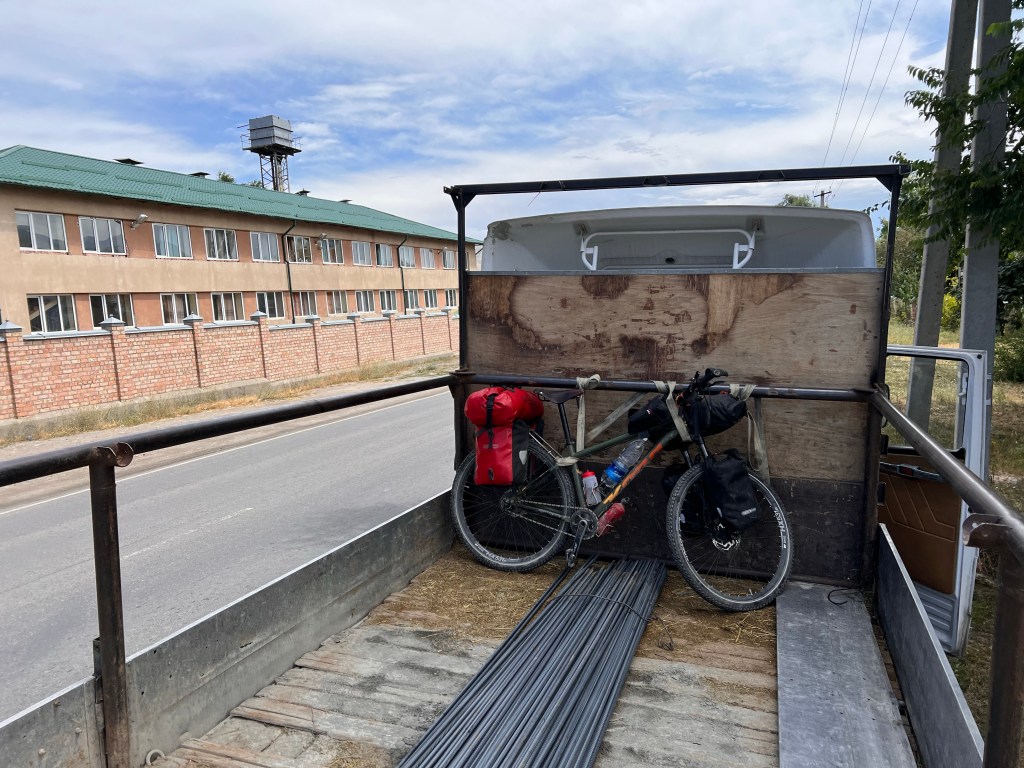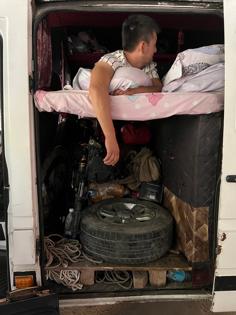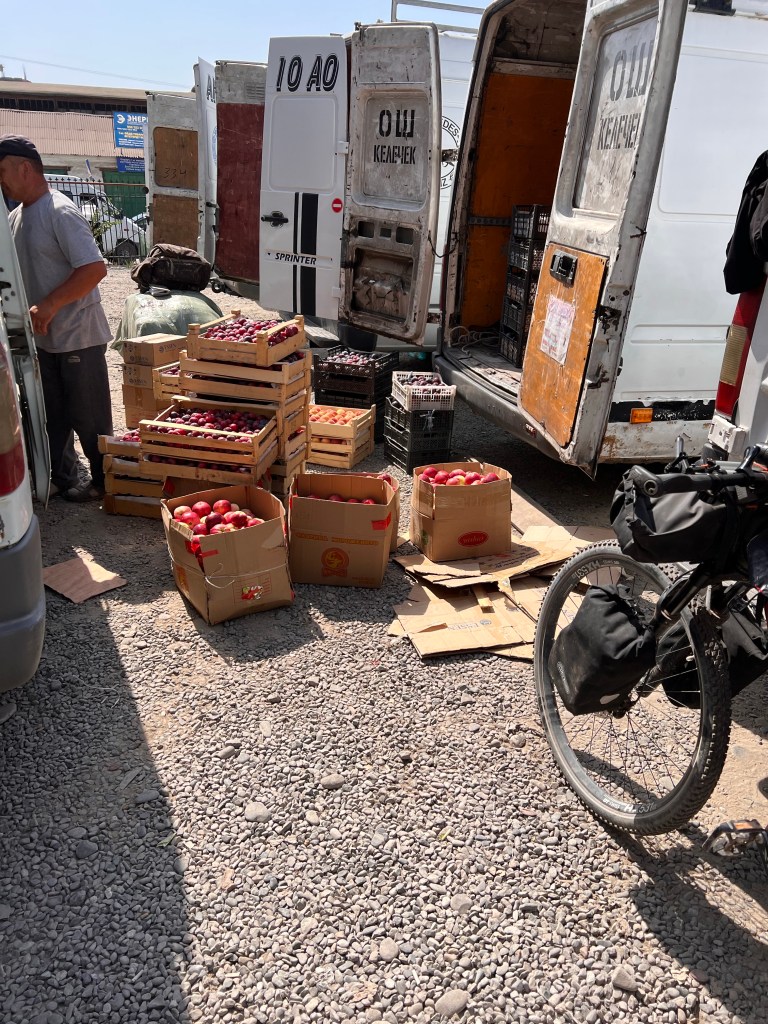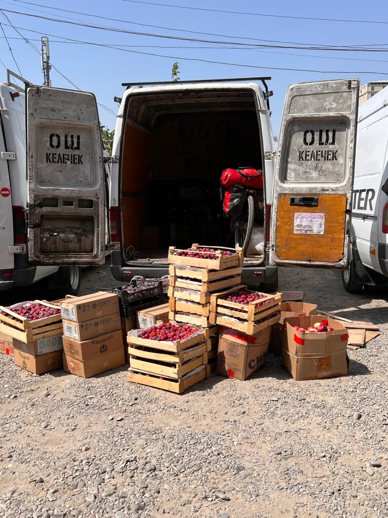 Am Bus-Platz angekommen, wurde ich schon von unzähligen Leuten umworben, die mir ansahen: der Junge will nach Bishkek. Nach einigen Verhandlungen, stand der Bus fest, bei dem ich mit fahre. Umgerechnet 20€ für mich und Fahrrad für die 600km in Hauptstadt waren akzeptabel. Ich hob mein Rad in den Sprinter und kaufte noch Wasser und ein wenig zu Essen ein. Ich dachte 5-6h werden wir ja schon fahren. Als ich wieder kam, standen hinter dem Sprinter unzählige Kisten mit Obst, was anscheinend mitgenommen werden sollte. Da dachte ich mir schon, dass da mein Rad dann aber nicht mehr rein passt. War auch so und ein älterer Herr, der sich als Mitfahrer rausstellte, wollte mir klar machen, das Rad kommt dann oben auf’s Dach. Ein Fahrer schlug mir vor, wir könnten doch das Rad hinten an den Sprinter binden, mit Taschen. Ich machte den Jungs klar, dass keiner der Vorschläge für mich akzeptabel gewesen wäre. Nach einigem hin und her, mit viel Getöse, konnte ich das Rad mit Taschen direkt hinter dem Fahrer platzieren. Puh, war ich erleichtert, dass das Rad jetzt im Auto war. Ich entdeckte im Sprinter dann den Schlafbereich, der direkt unter dem Dach lag und mit Matratzen, Decken und Kissen ausgestattet war. Gerade so hoch, dass man dort halb sitzen konnte. Für mich stand fest, ich würde dem Fahrer nicht von der Seite weichen und mich keinesfalls zum Schlafen hinlegen. Irgendwann gegen 16:30 Uhr ging dann die Fahrt endlich mal los, mit 5 Personen.