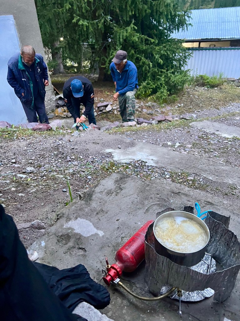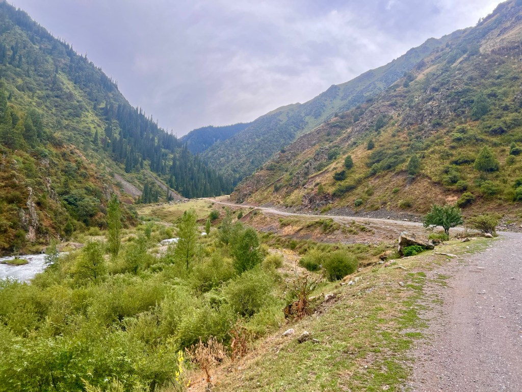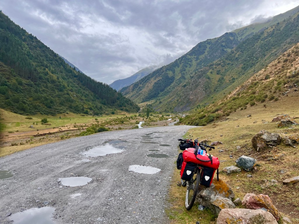 So startete ich früh in Bishkek Richtung Kegety Pass. Es sollten ca. 105 km und über 3000 hm bis zum Pass auf 3780 m überwunden werden. Ich fuhr über kleine und ruhige Straßen aus Bishkek Richtung Südosten. Nach und nach wurde der Verkehr wieder mehr und die Straßen deutlich schlechter. Als ich ein Bild von einem Panzer, der an Straße stand machte, sprachen mich zwei ältere Herren an, wo ich denn hin wöllte. Ich sagte Richtung Kegety. Sie waren in die selbe Richtung unterwegs und ich sollte jetzt unbedingt mitfahren. Ich überlegte nicht lange und so luden wir das Fahrrad auf ihren Mercedes LKW, was auch sonst, jeder fährt hier Mercedes. So polterten wir über unglaublich schlechte Straßen, hielten erneut an, um noch jemanden mitzunehmen und dann zu viert im LKW zu sitzen. Nach rund 25 km und dem ersten Pass, signalisierten mir die Männer, dass ich jetzt raus muss, weil sie abbiegen müssen. Alles wieder abgeladen, ging es für mich erstmal bergab. In einem Magazin kaufte ich mir gefrorene Pelmeni und machte mir in der Wildnis erstmal Mittag. Diesmal wollte ich mich ein wenig fernhalten von den Restaurants und meinen Magen schonen, da die nächsten Tage extrem anstrengend werden sollten. Nachdem ich gut gestärkt war, ging es weiter Richtung Pass-Anfang. Im Hostel hatte ich gehört, dass die nächste Zeit das Wetter schlecht werden sollte, hab dem Ganzen aber keine große Beachtung geschenkt. Als ich in Bishkek startete, war noch Sonnenschein. Als ich den Ort Kegety passierte und es so langsam bergauf ging, zogen schon Gewitter Wolken heran und kurze Zeit später blitzte und donnerte es heftig mit zusätzlich starkem Regen. Dann suchte ich mir erstmal einen kleinen Unterstand. Da kamen mir die ersten Gedanken, ob das jetzt eine gute Idee bei so einem Wetter war in die Berge zu fahren, war es doch auch plötzlich ziemlich kalt und sah auch nicht nach Besserung aus. Irgendwann hört es dann auf und ich fand auf der Karte in der Nähe ein Guesthouse, wo ich die Nacht ja vielleicht trocken übernachten konnte. Der Regen verschwand und mein Drang diese Etappe doch zu bewältigen, war größer und so fuhr ich den Pass auf dem aufgeweichten Schotterweg immer weiter nach oben. Neben mir floss ein laut tösender Bach ins Tal und ich fuhr auf einem groben Schotterweg nach oben. Mir war schon klar, dass ich den Pass nicht an einem Tag schaffen würde, da es schon später Nachmittag war. Ich fand in der Karte einen Zeltplatz und steuerte diesen an, in der Hoffnung eine Überdachung zu haben, da es die Nacht wieder regnen sollte und ich keine Lust auf nasses Zelt in der Tasche am nächsten Morgen hatte. Als ich mich den Pass weiter nach oben kämpfte, es wurde zwischenzeitlich ziemlich steil, erreichte ich den Zeltplatz. Naja, ich wusste, dass ich da war, weil mein Standort auf der Karte das verriet. Vor Ort, wie immer in Kirgisistan, keine wirkliche Spur, dass hier jetzt der Zeltplatz ist. Naja, gut, dachte ich mir, fahre ich weiter, da ich noch eine Art Schutzhütte entdeckte. Und es ging ziemlich steil über den Schotterweg nach oben, was schon ziemlich kräftezehrend war. Irgendwann war ich bei der Schutzhütte angekommen, das stellte sich als eine Art Ferienanlage heraus mitten im Nirgendwo. Auf Nachfrage konnte ich dort unter einem kleinen Dach schlafen, was ideal für mich war. Die Besitzerin Nurda erzählte mir, dass ihr Sohn momentan in Stuttgart studiert. Sie wollte mich noch zum Essen einladen, doch ich hatte die Taschen randvoll mit Essen und das muss ja auch mal leer werden. So saß ich da unter meinem Dach, kochte und beobachte das Treiben auf dem Grundstück. Direkt neben mir wollte der Mann von Nurda einen Wasserhahn installieren. Schon eilten zwei ältere Herren herbei, die dem Jungen gleich mal erzählen wollten, wie das richtig gemacht wird aus ihrer Perspektive. Wem kommt das bekannt vor? Die Menschen weltweit haben doch grundlegend immer die gleichen Schwierigkeiten. 🙂 Ich dachte mir nur, dass ich eigentlich hier in den Bergen kaum Menschen sehen werde und meine Ruhe habe, da lag ich wohl falsch. Witzig wurde es dann später als drei Pakistanis im Dunkeln auf dem Gelände auftauchten. Ich beobachtete das treiben und fragte mich was die Jungs hier wollen. Sie beäugten mich von weitem und irgendwann schlichen sie dann bei meinem Schlafplatz vorbei. Sie erzählten mir das Sie Medizin in Bishkek studieren und auf dem Gelände gerade eine Huhn kaufen was für sie geschlachtet wird. Es war gerade 23 Uhr und diese Ferienanlage lag weit weg von jeglicher Ortschaft oder öffentlicher Straße. Ebenso die Straße dorthin ist kein leichtest unterfangen mit einigen Wasserdurchfahrten und sehr holprigen Teilstücken. Also warum nicht sich Abends mal ins Auto setzen und ein Huhn kaufen mitten in den Bergen, wer macht das nicht ständig.Die schüchternen Pakistanis verabschiedeten sich und ich verkroch mich bei einstelligen Temperaturen in mein Schlafsack. Die Nacht unter dem Dach war super. Ich ließ mein Zelt in der Tasche und nutzte nur Schlafsack und Matratze.