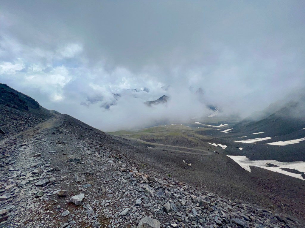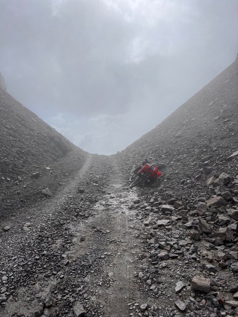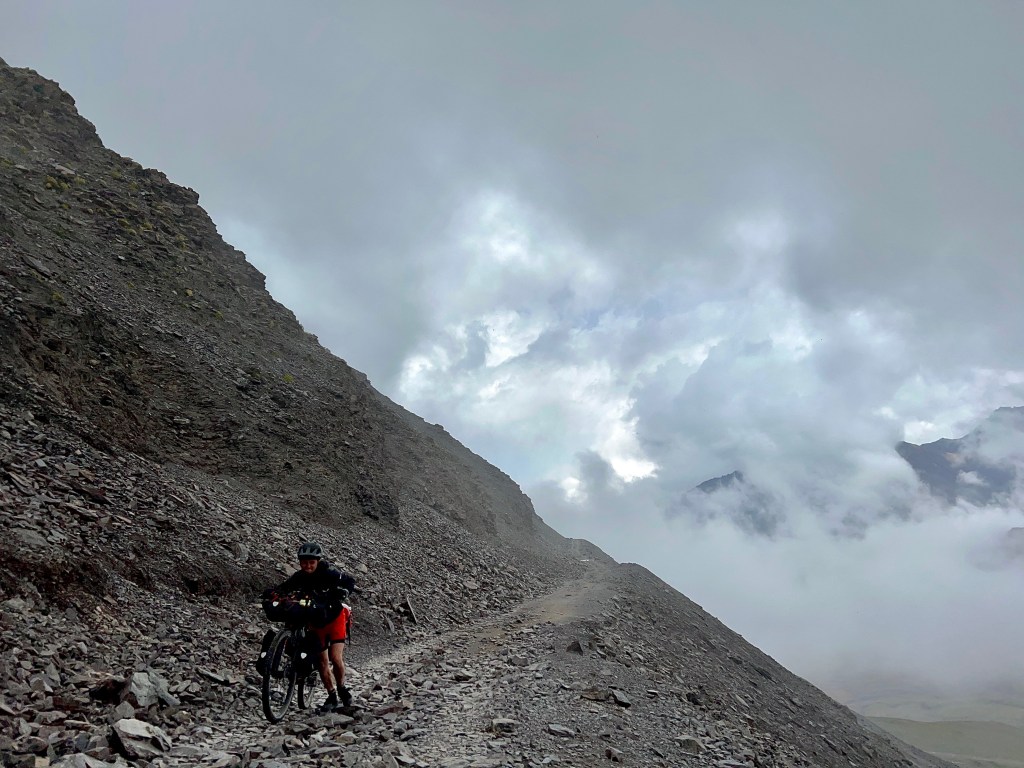 Bitte lächeln 😀 Auf einmal standen überall ZelteAb 3000m änderte sich die Landschaft in noch schöner Hier ging das fahren noch Hier wurde es dann doch schwierig extrem steil und anstrengend Und es wurde nicht besser Gab schon tolle ausblicke für kurze Zeit Sonne und regen Wechselten alle halbe Stunde Eine von unzähligen Pausen Die letzten Kilometer waren schwerst Arbeit Leider zog es sich am Pass sehr zu sodass leider kein besseres Bild herauskamNoch 250m bis zum Pass. Pause muss sein!Endlich oben angekommen nach 7h