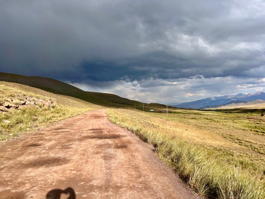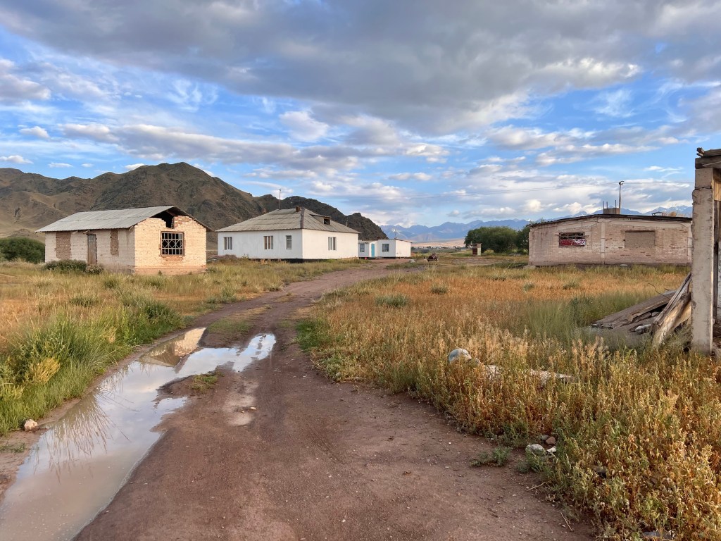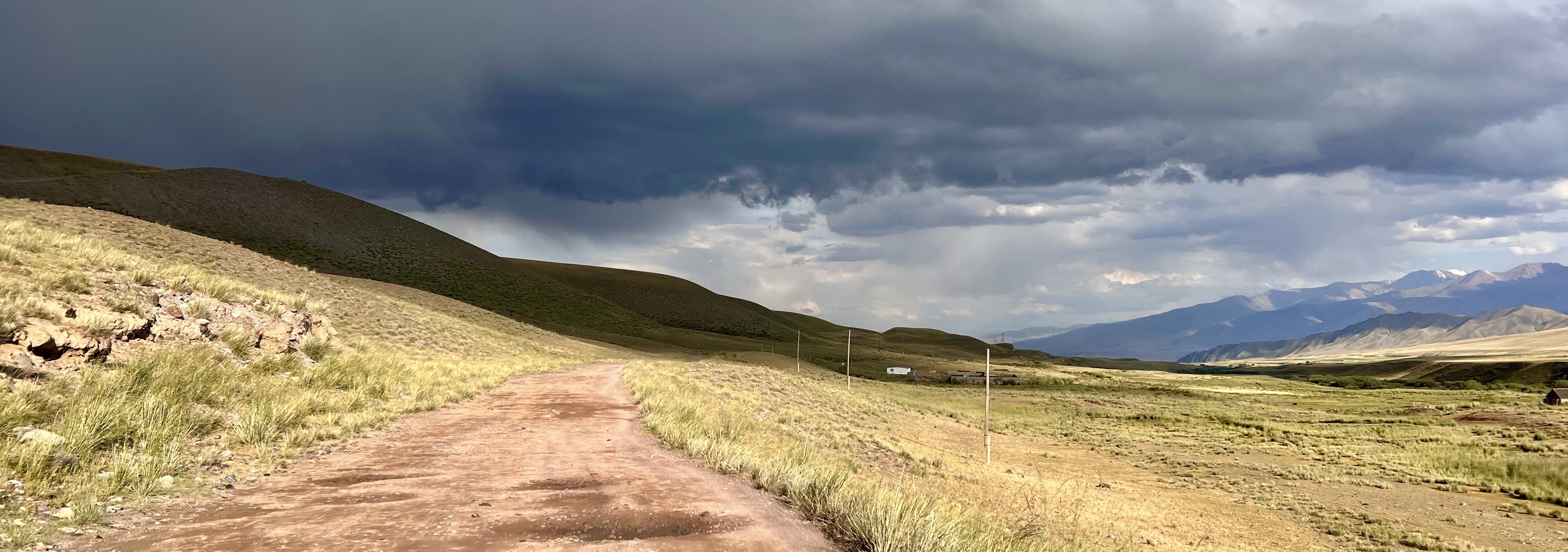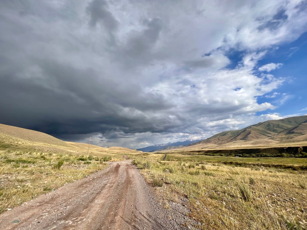 Jetzt ging es mit ordentlich Rückenwind nach unten. Doch die Straße mit den unzähligen Waschbrettern war kein Geschenk. Kurze Zeit später traf ich Mark, aus England, mit dem Rad. Er hatte sich für das Silk Road Mountain Race angemeldet und war zwei Wochen vorher angereist um sich ein wenig auf das Terrain einzustellen. Er absolvierte ebenfalls mehrere Etappen des Rennens und nach Schilderung meiner Erfahrung, war er sich sicher die Teilnahme am Rennen zu canceln. Er erzählte mir, dass er schon drei mal am transcontinentel Rad Rennen teilgenommen hat, was mit ca. 4000 km durch Europa führt. Und das, was er hier in Kirgisistan gesehen hat, echt hart ist. Wir unterhielten uns noch ein wenig und verabschiedeten uns dann. Für mich ging es dann weiter auf Straßen, die sich im Bau befanden, nach Kochkor. Ich suchte mir ein Hostel, um mich erstmal zu erholen. Draußen zog schon wieder das nächste Gewitter auf und ich war froh im Trockenen zu sein. Das Hostel war bei Weitem kein Highlight, doch ich habe schon Schlimmeres gesehen.
