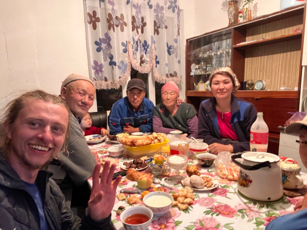 So nun ging es an die Abfahrt auf der anderen Seite. Als ich den Weg, wenn man ihn denn so nennen will, gesehen hatte, dachte ich mir, da war der, den ich hochgefahren bin, noch recht easy. Ein schmaler Pfad über viele Felsblöcke und ziemlich steil nach unten. Also stürzte ich mich mal nach unten und das war schon ziemlich heftig. Steil, loser Schotter, Felsen, über die ich mit dem Rad drüber musste. Irgendwann war der Weg verschwunden und ich fuhr querfeldein, was gar nicht so ungefährlich war. Das Spanische Pärchen, was ich Tage zuvor getroffen hatte, erzählte mir, die Frau sei dort abgestürzt und hat eine schwere Gehirnerschütterung davon getragen. Sie haben dort zwei Tage kampiert bis sie weiter konnten. Auf Hilfe braucht man hier nicht zu hoffen. Bergwacht oder ähnliches gibt es nicht. So schaffte ich es mit einiger Anstrengung das Steilstück lebend zu überwinden und kam dann auf einen recht gut ausgebauten Weg, der aber durch Felsbruch von vielen Felsblöcken übersäht war. Die Landschaft wurde langsam wieder grün und es ging ordentlich voran auf dem Weg nach unten. Immer begleitet vom Pfeifen der Murmeltiere, die wahrscheinlich ihre Artgenossen warnten: ‚Achtung Eindringling‘. Der Schotterweg wurde dann wieder schlechter und flacher und verlief entlang eines Flusses weiter bergab. Da folgte auch schon das nächste Gewitter hinter mir und ich zog schnell meine Regenjacke drüber und fuhr weiter. Es ging dann über eine weite Ebene zurück in Ortschaften, wo es endlich wieder Straßenbelag gab. Es war schon 19:00 Uhr und ich musste unbedingt was essen. Ich fuhr aus der Ortschaft raus und sah einen für mich alten verlassen Bauernhof. Dort startete ich meinen Kocher und bereite alles vor, um mich zu stärken. Nach kurzer Zeit kam ein Auto und mir war klar: da wohnt ja doch noch jemand. Ich wurde zum Essen und Schlafen im Haus eingeladen. Bei uns würde man mit so einem Eindringling wie mir mit Sicherheit nicht so nett umgehen, oder ? Da mein Essen schon fertig war, winkte ich ab und bedankte mich herzlich dafür. Später wollte ich dann im halbdunkeln mein Zelt aufbauen und da zog schon wieder ein heftiges Gewitter heran. So entschied ich mich das Angebot anzunehmen und bei strömenden Regen im Haus nachzufragen, ob sie denn eine trockene Stelle zum Übernachten hätten. Ich wurde herzlich empfangen und mein Schlafplatz wurde in der großen Wohnstube für mich alleine hergerichtet. Danach ging es an den Abendbrotstisch und mir wurde alles, was ging an Essen hingestellt. Ich lehnte ab, da ich ja schon gegessen hatte und satt war. Bei der vergorenen Stutenmilch musste ich hartnäckig sein und konnte mich dann noch zum Tee retten, zum Glück! Es war ein wahnsinnig anstrengender Tag und mit dem Sitzen dort am Tisch, wurde mir so langsam bewusst, was ich da so geleistet hatte und wie freundlich und hilfsbereit diese Menschen sind. Einfach Wahnsinn. Die junge Frau und Mann verabschiedeten sich mit ihren Kindern bei Oma und Opa und fuhren nach Hause und ich sagte auch Gute Nacht und legte mich ziemlich fertig hin. Am nächsten Morgen, pünktlich um 6 Uhr, wurde ich aus dem Bett geklopft und zum Frühstück bestellt. Das erinnerte mich doch sehr stark an meine Großeltern Zuhause. Also ab zum Frühstück. Hier gab es das gleiche wie abends zuvor: Fleisch. Ich begnügte mich mit Tee und ein paar Plätzchen, verabschiedete mich, lies noch eine kleine Spende da und machte mich auf den Weg Richtung Song Kul.